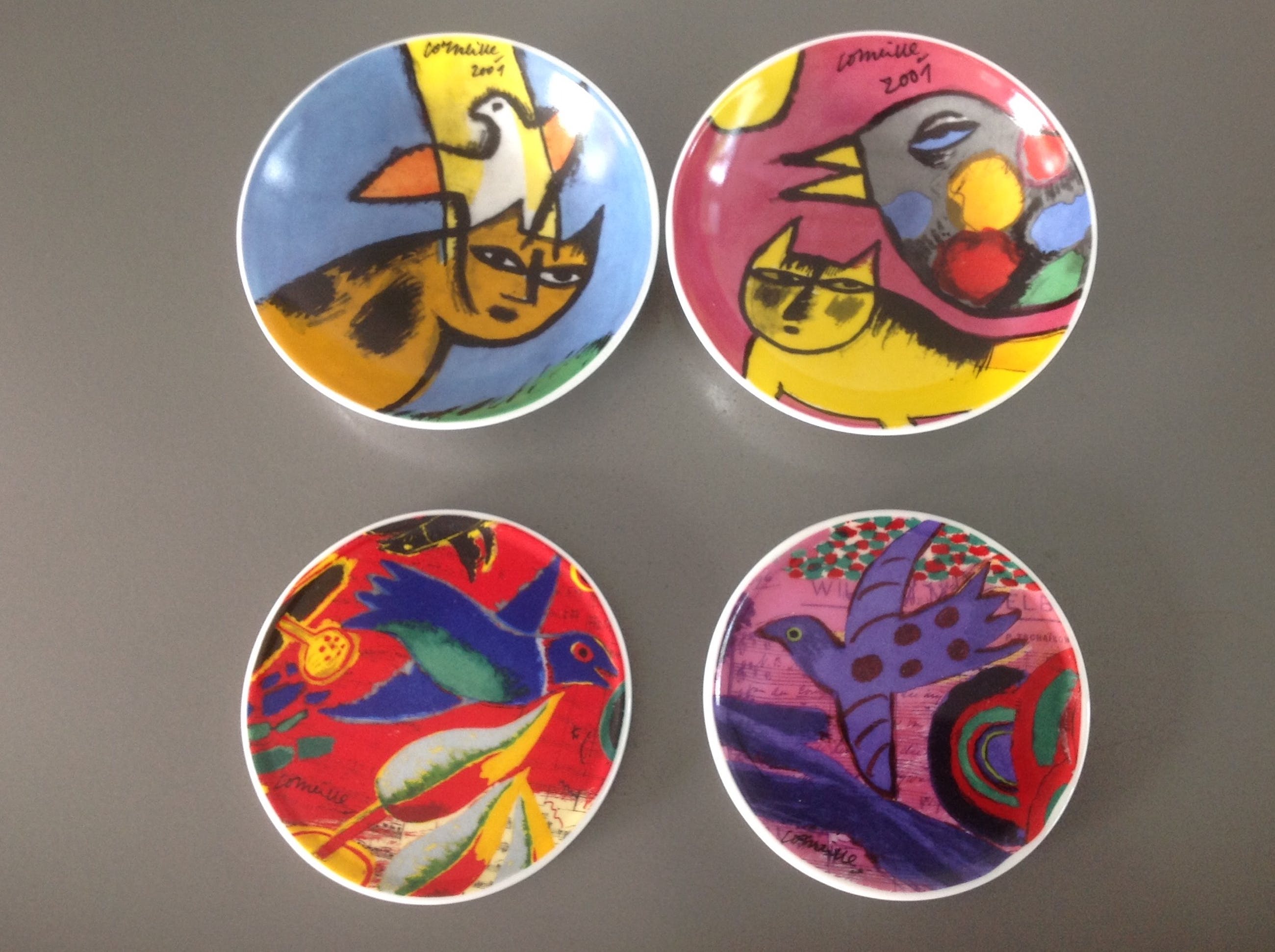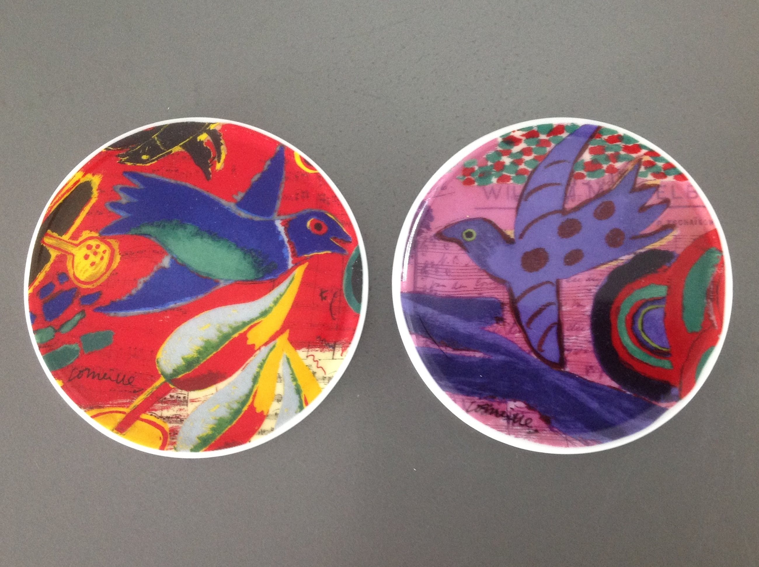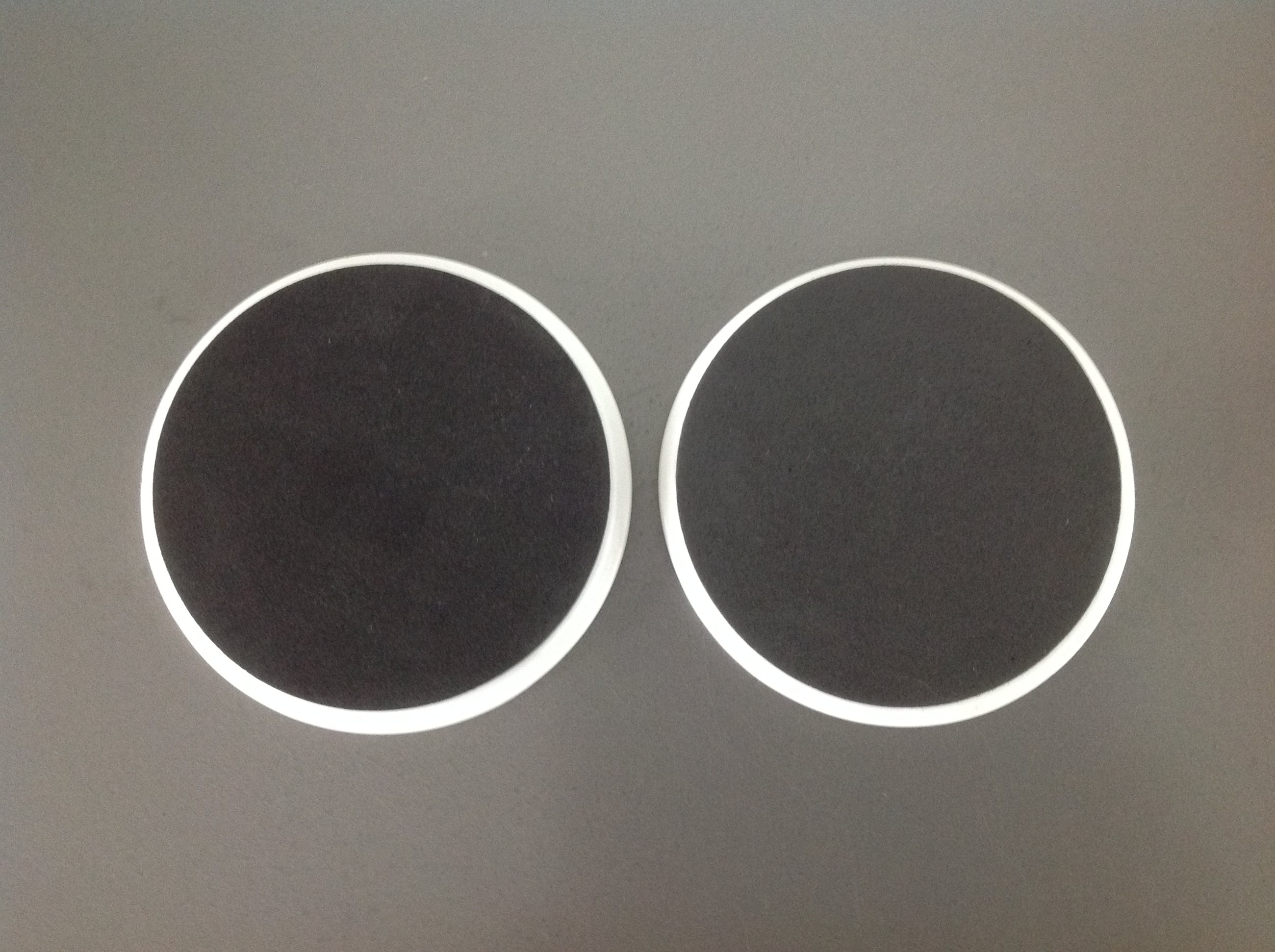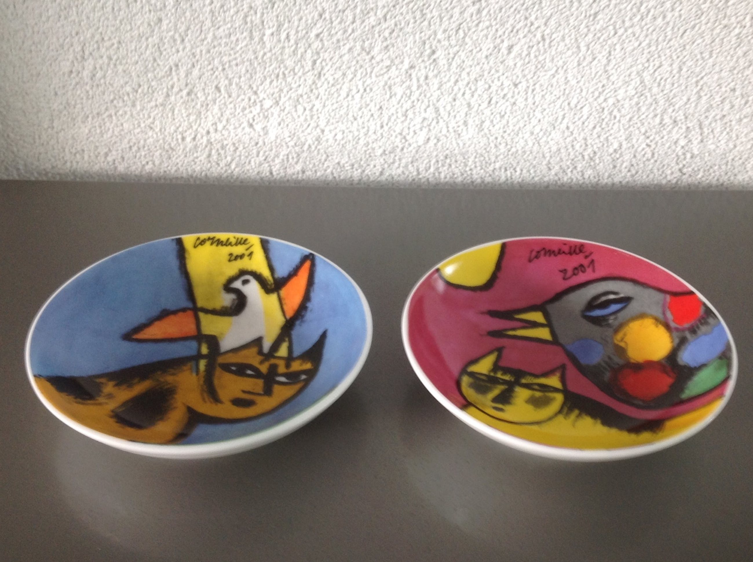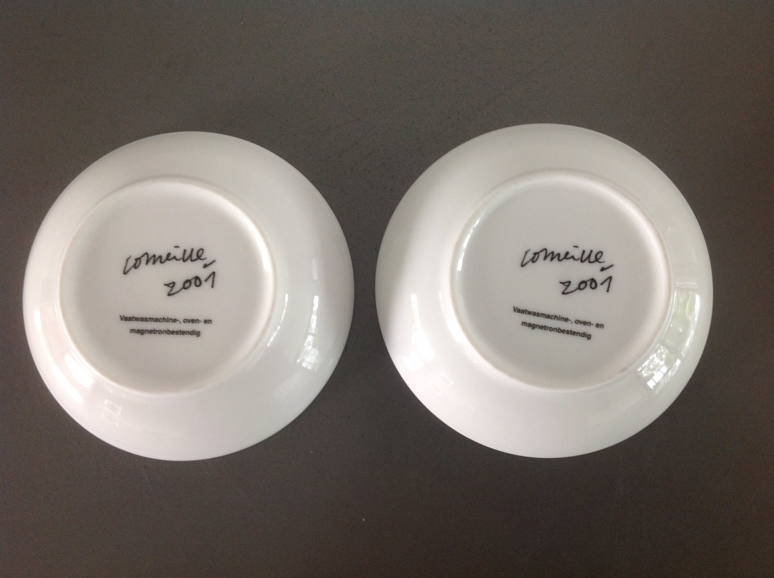De onderzetters hebben een doorsnede van 10 cm en rubber op de onderzijde.De schaaltjes meten 12 cm in doorsnee.