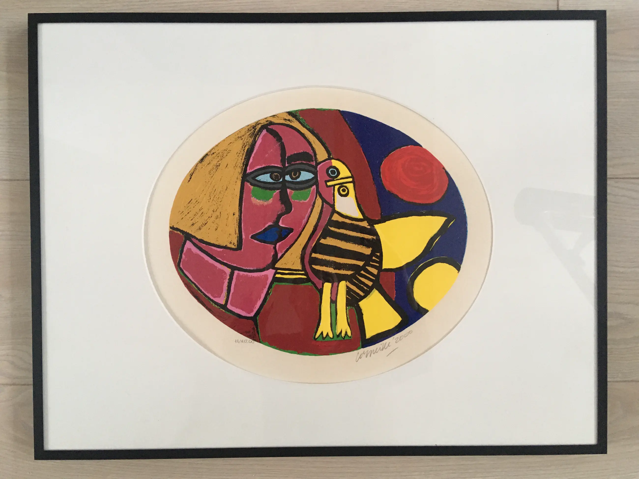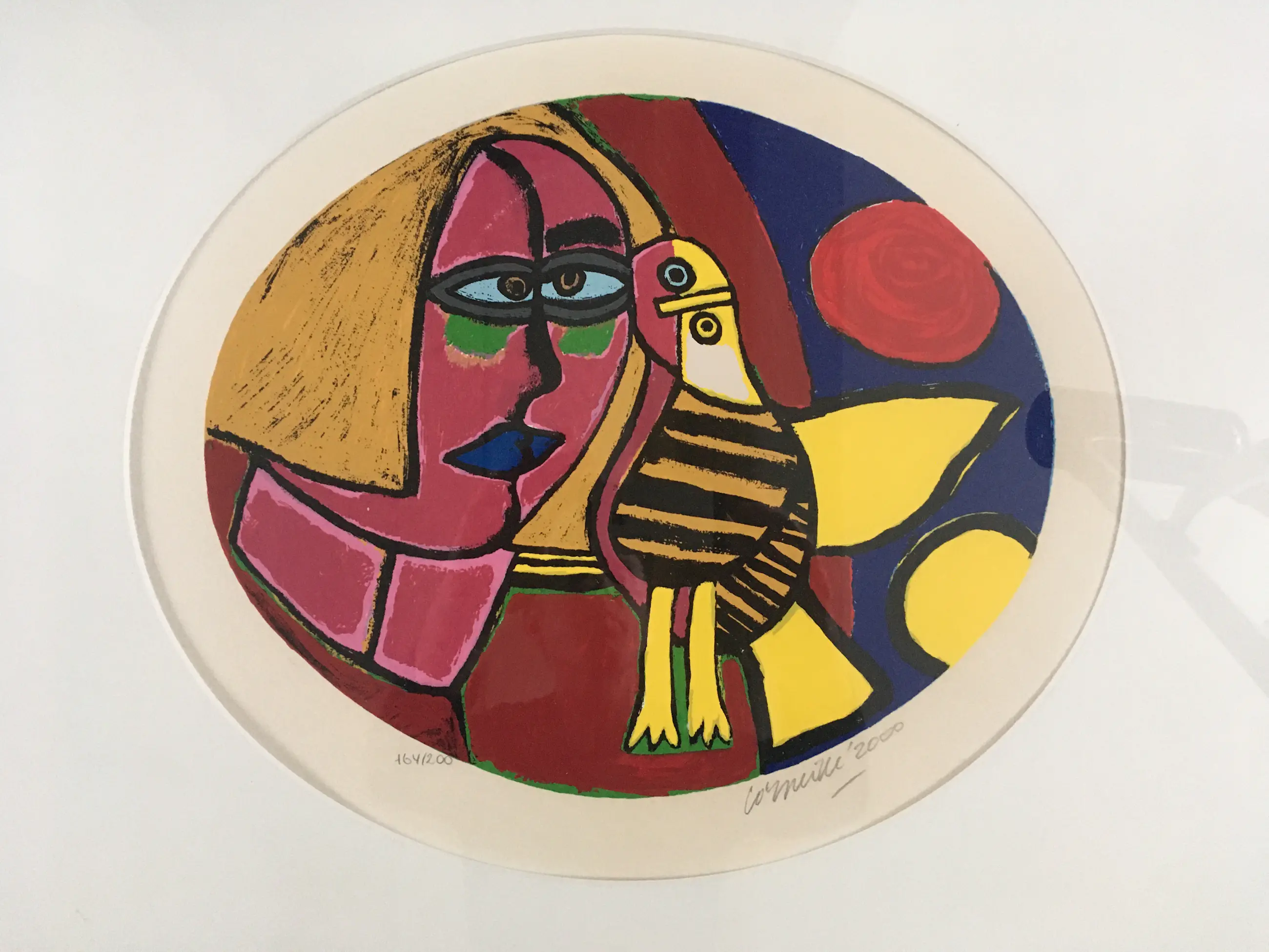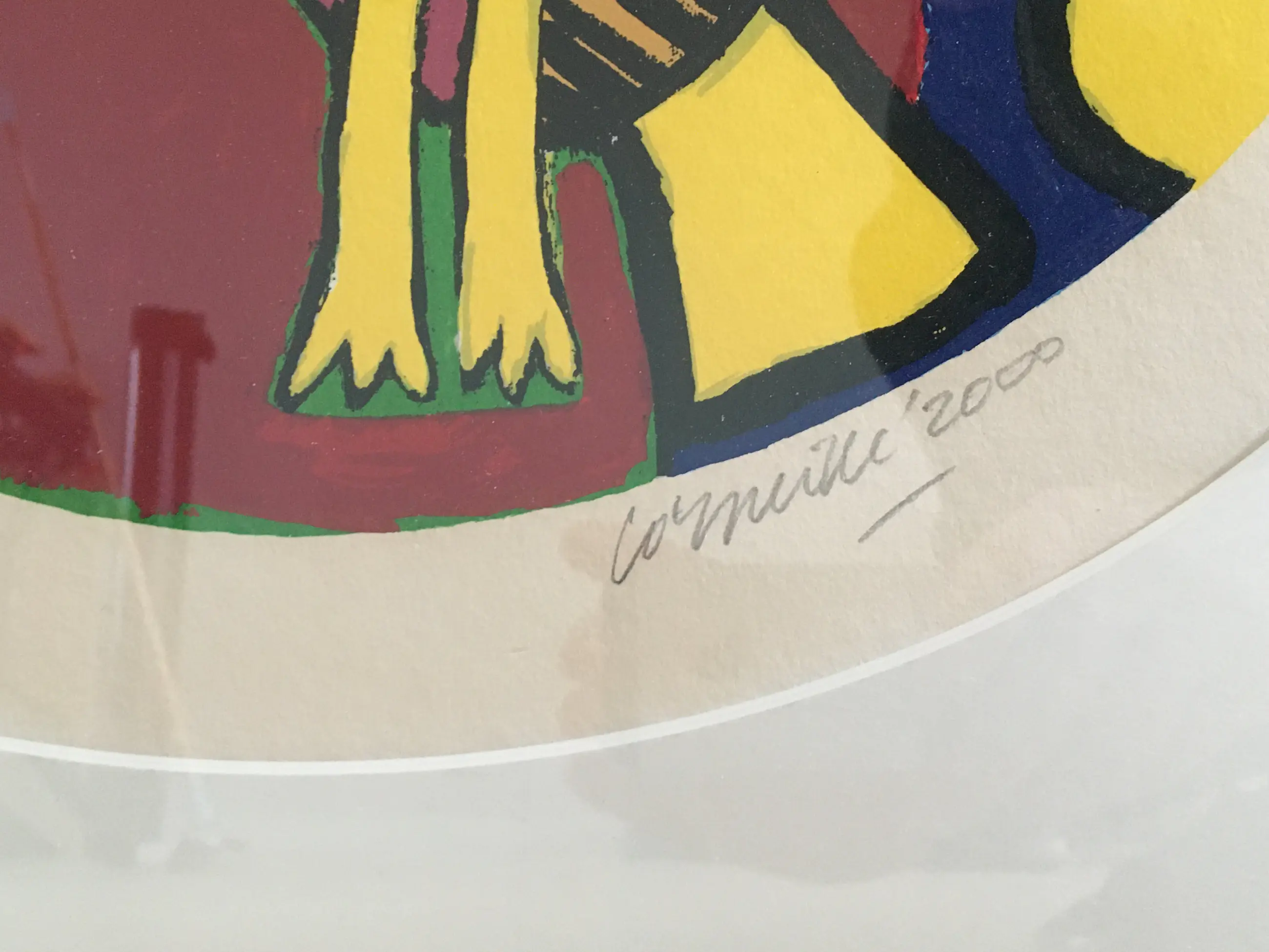 Prachtige ovale Corneille uit 2000! Zelden aangeboden. Mooie heldere kleuren. In nieuwe Barth lijst (25mm dik) met ovaalvormige passe-partout. Een aanwinst voor aan de muur.