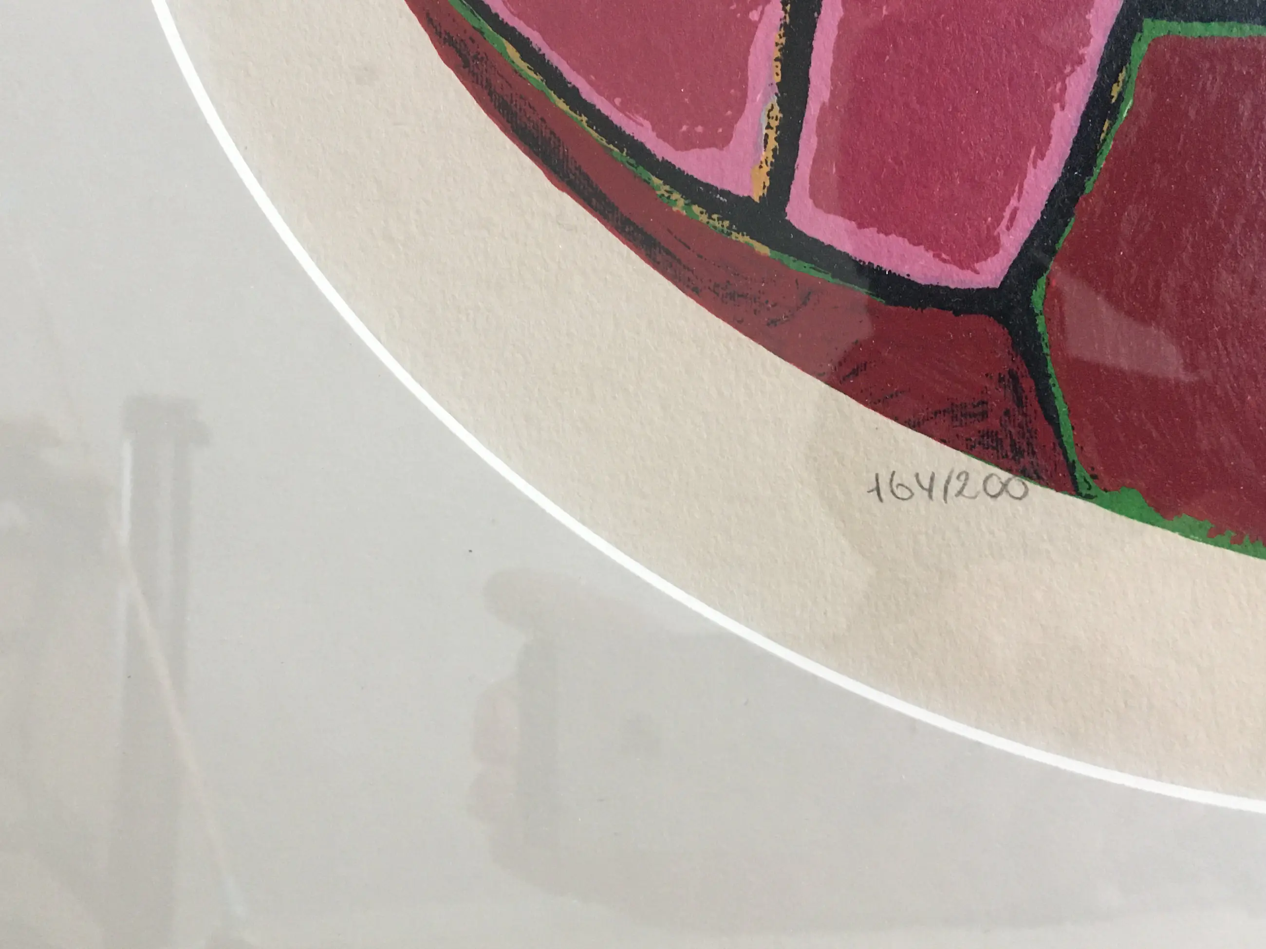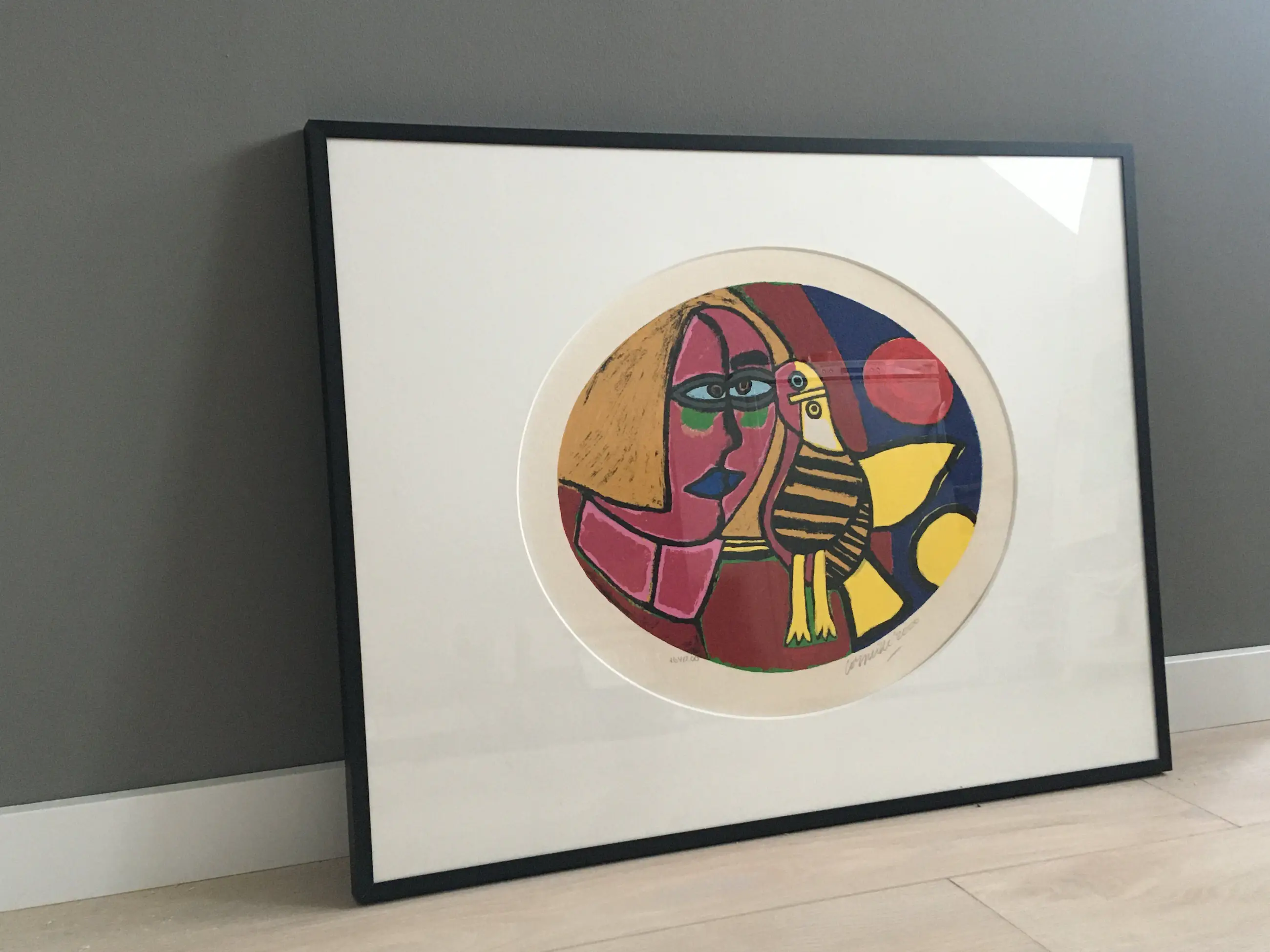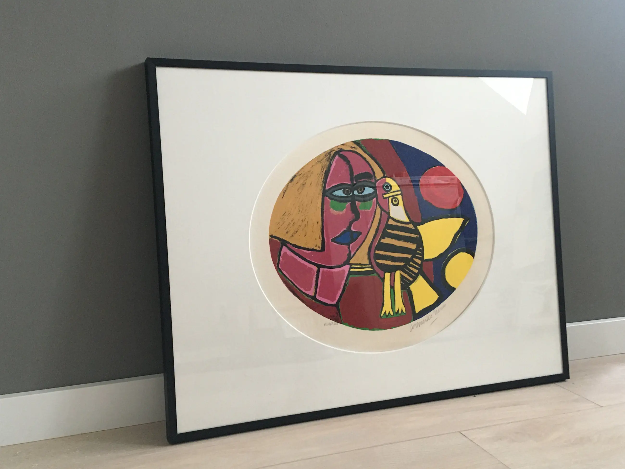 Prachtige ovale Corneille uit 2000! Zelden aangeboden. Mooie heldere kleuren. In nieuwe Barth lijst (25mm dik) met ovaalvormige passe-partout. Een aanwinst voor aan de muur.