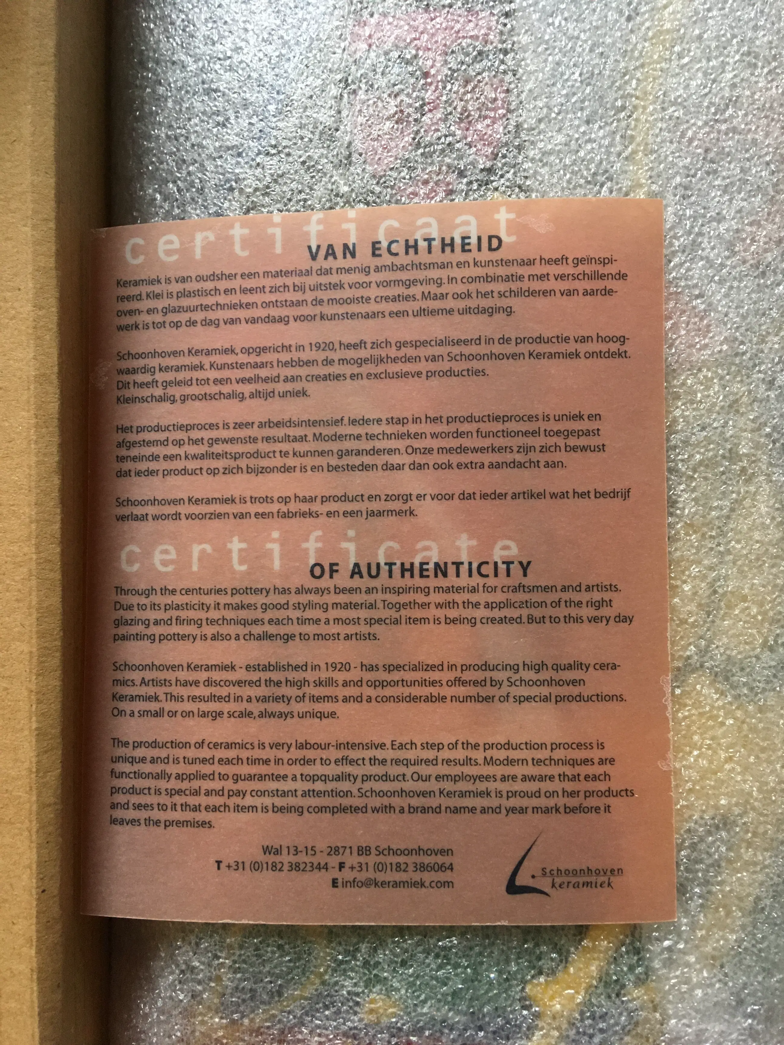 Het werk is af te halen op locatie. Als koper dient u zelf verpakkingsmateriaal mee te nemen. De locatie is: Hengelo, Nederland