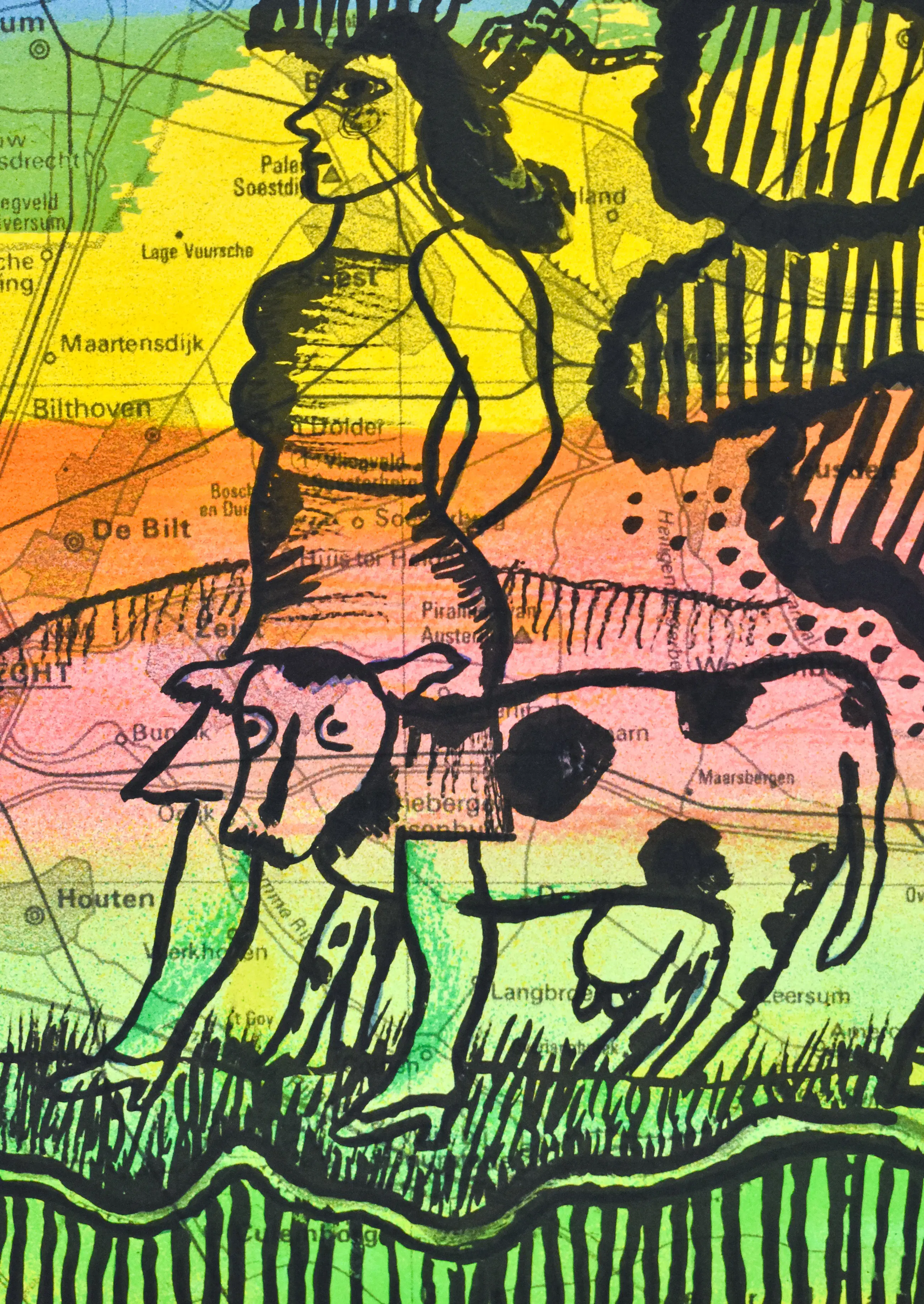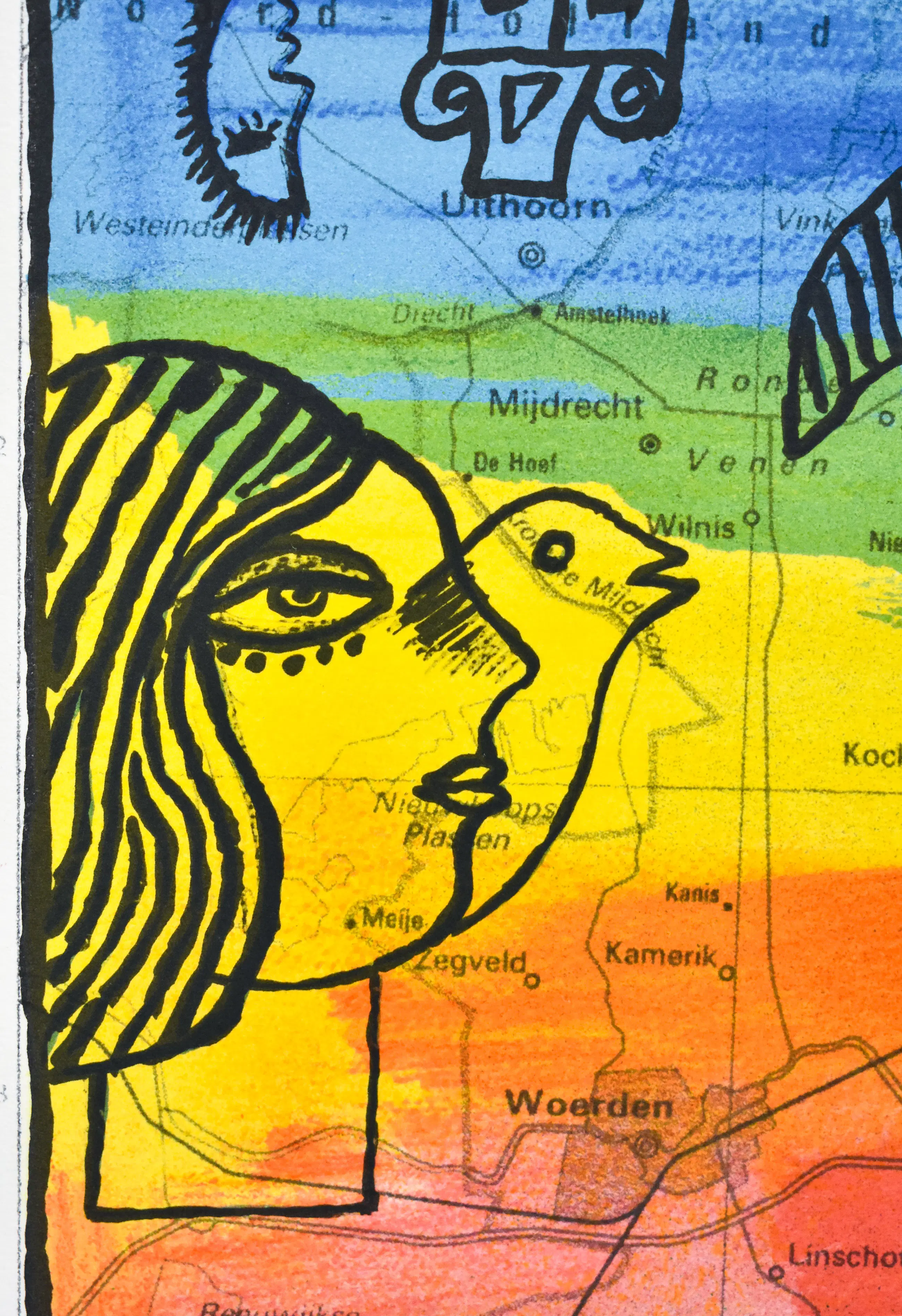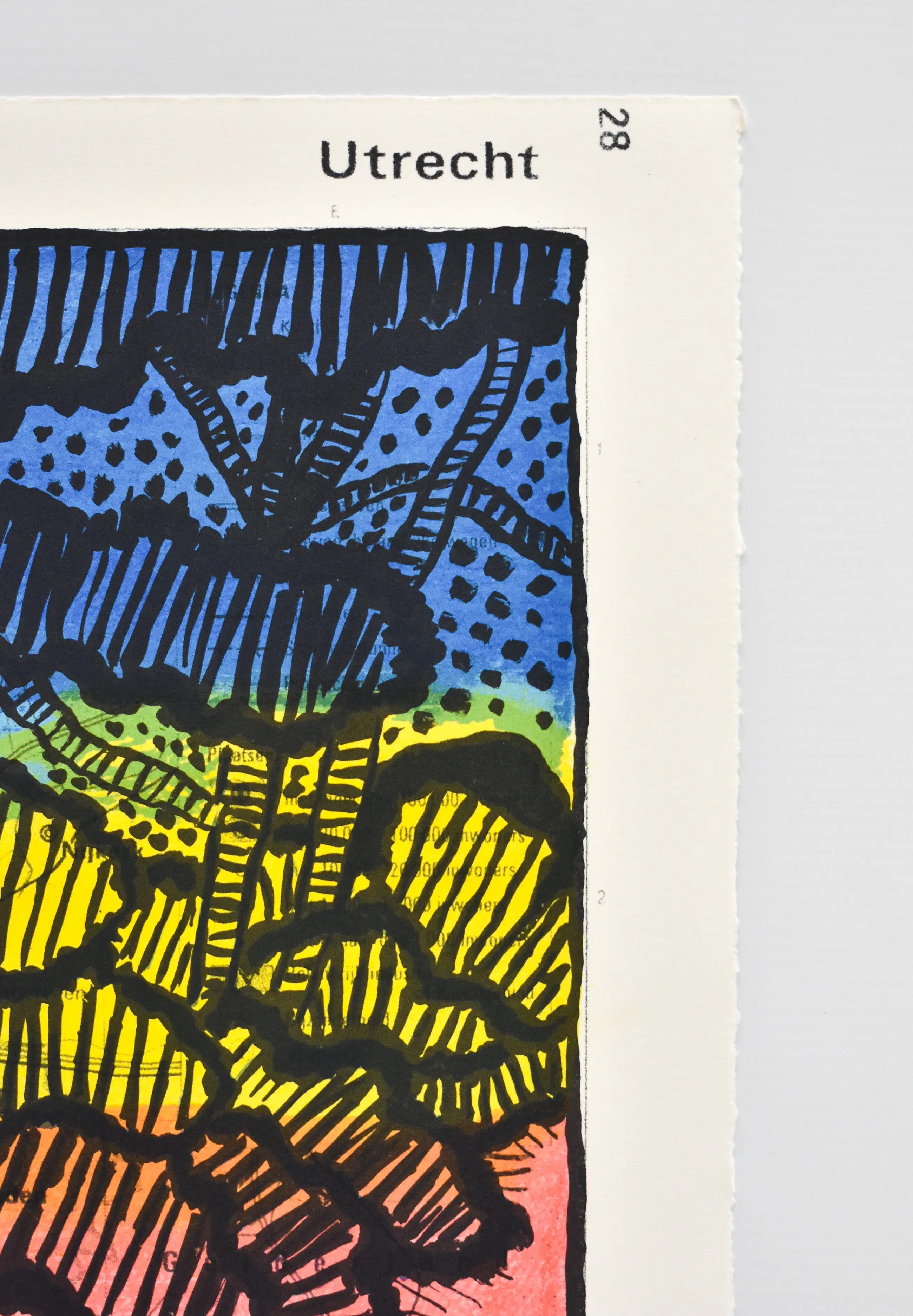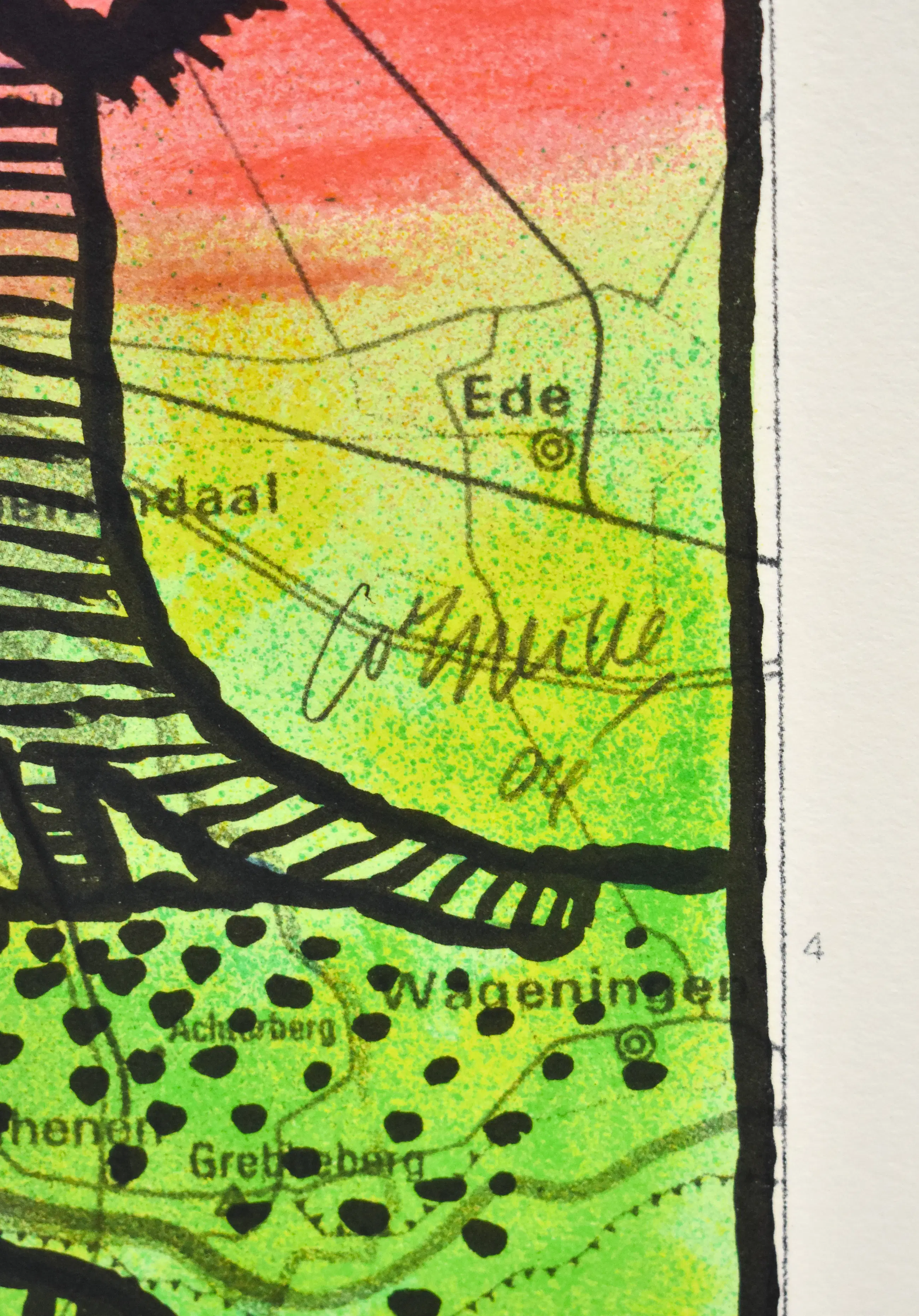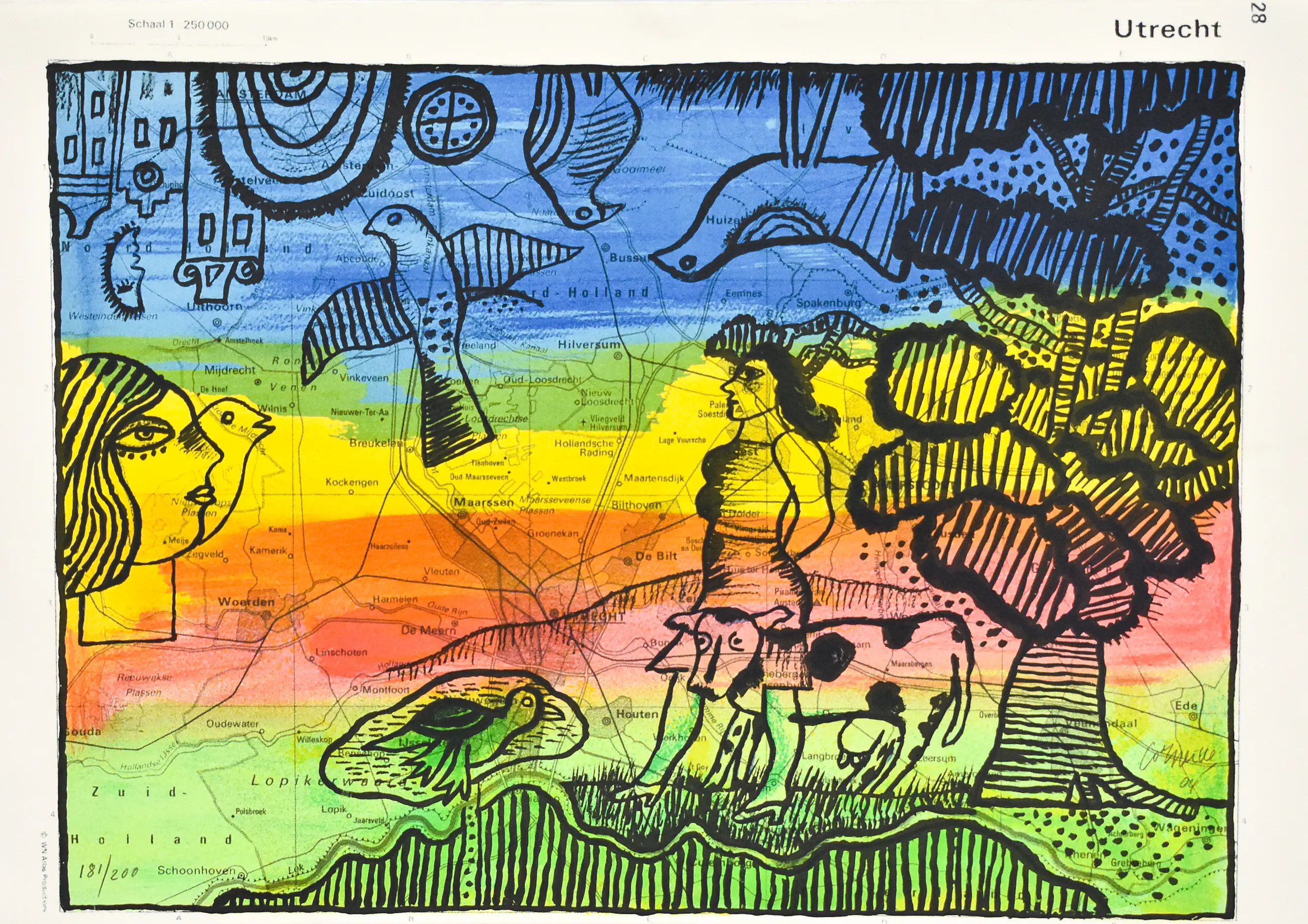 Deze kleurrijke litho getiteld “Utrecht” is een werk van Corneille (1922–2010), een van de medeoprichters van de CoBrA-beweging (samen met o.a. Karel Appel en Constant). Zijn werk kenmerkt zich door levendige kleuren, speelse vormen en terugkerende thema’s als vogels, vrouwen en exotische landschappen.