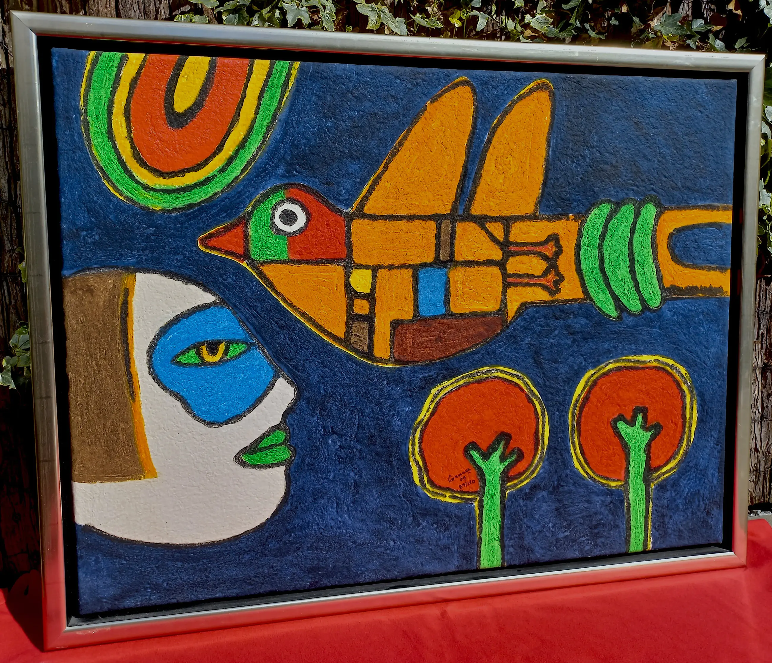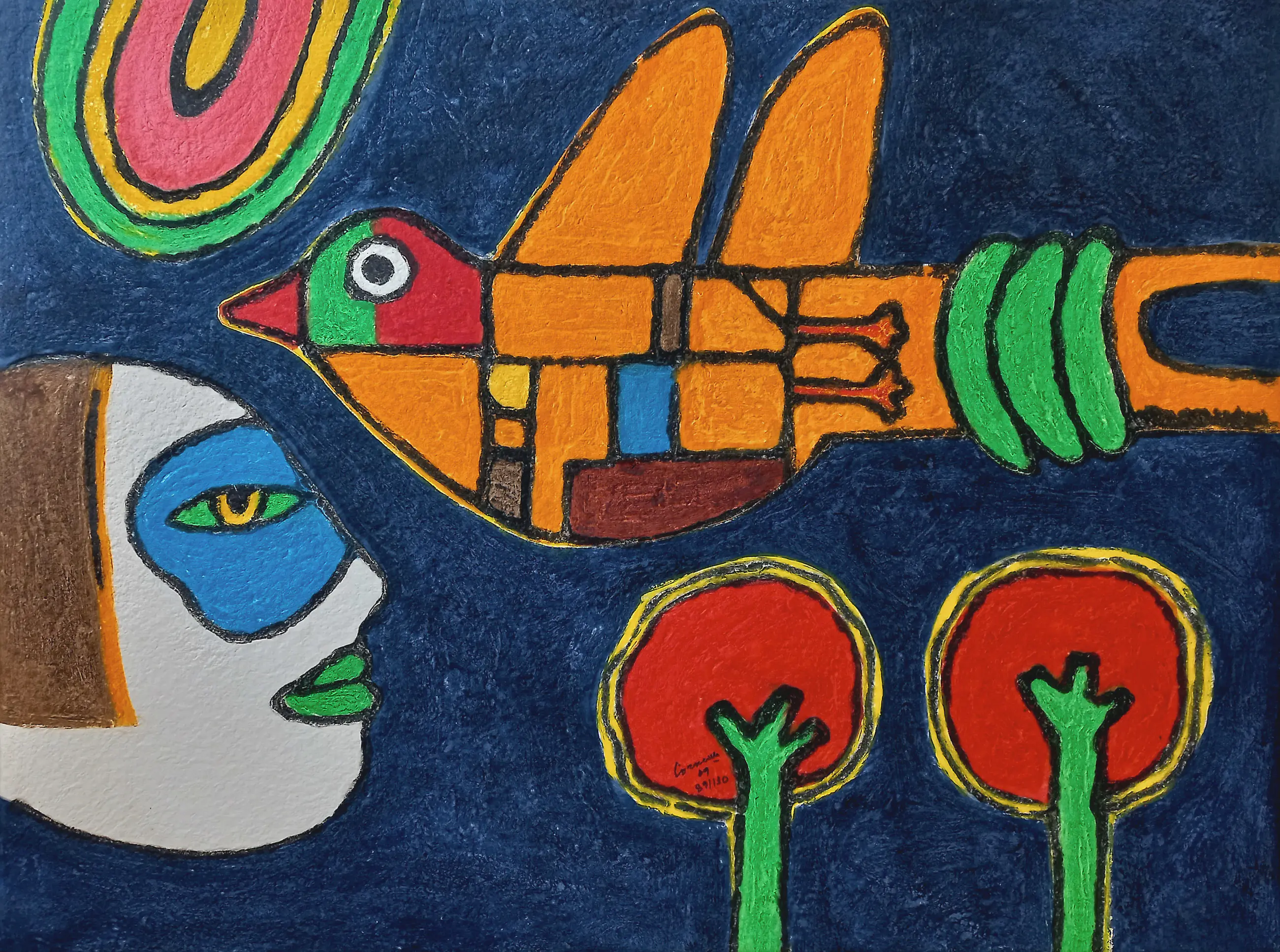 Prachtig, kleurrijk werk van Corneille, één van zijn mooiste latere composities. Carborundum druk op canvas, met de hand gesigneerd, gedateerd (‘09) en genummerd (89/130). In mooie, professionele lijst. In uitstekende conditie.