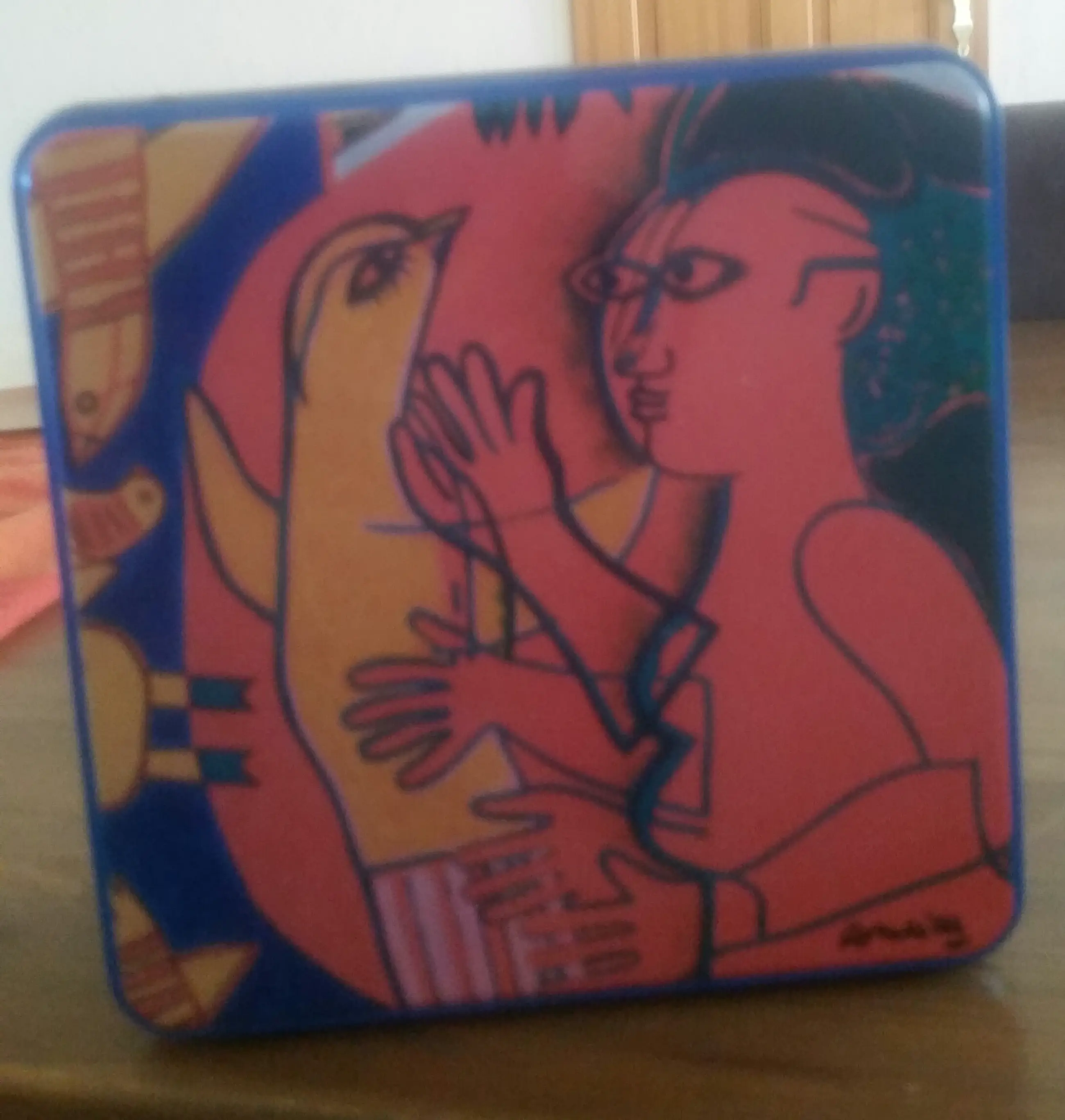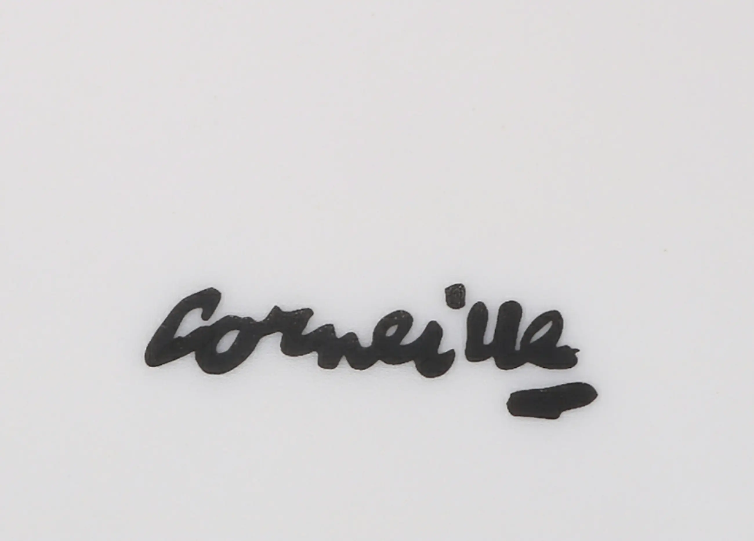 Set van 6 onderzetters met kleurijke figuren. Een groot bewaarblik met afbeelding. En een eierdopje. Dit alles van één van de bekendste Nederlandse kunstenaars C.B Corneille