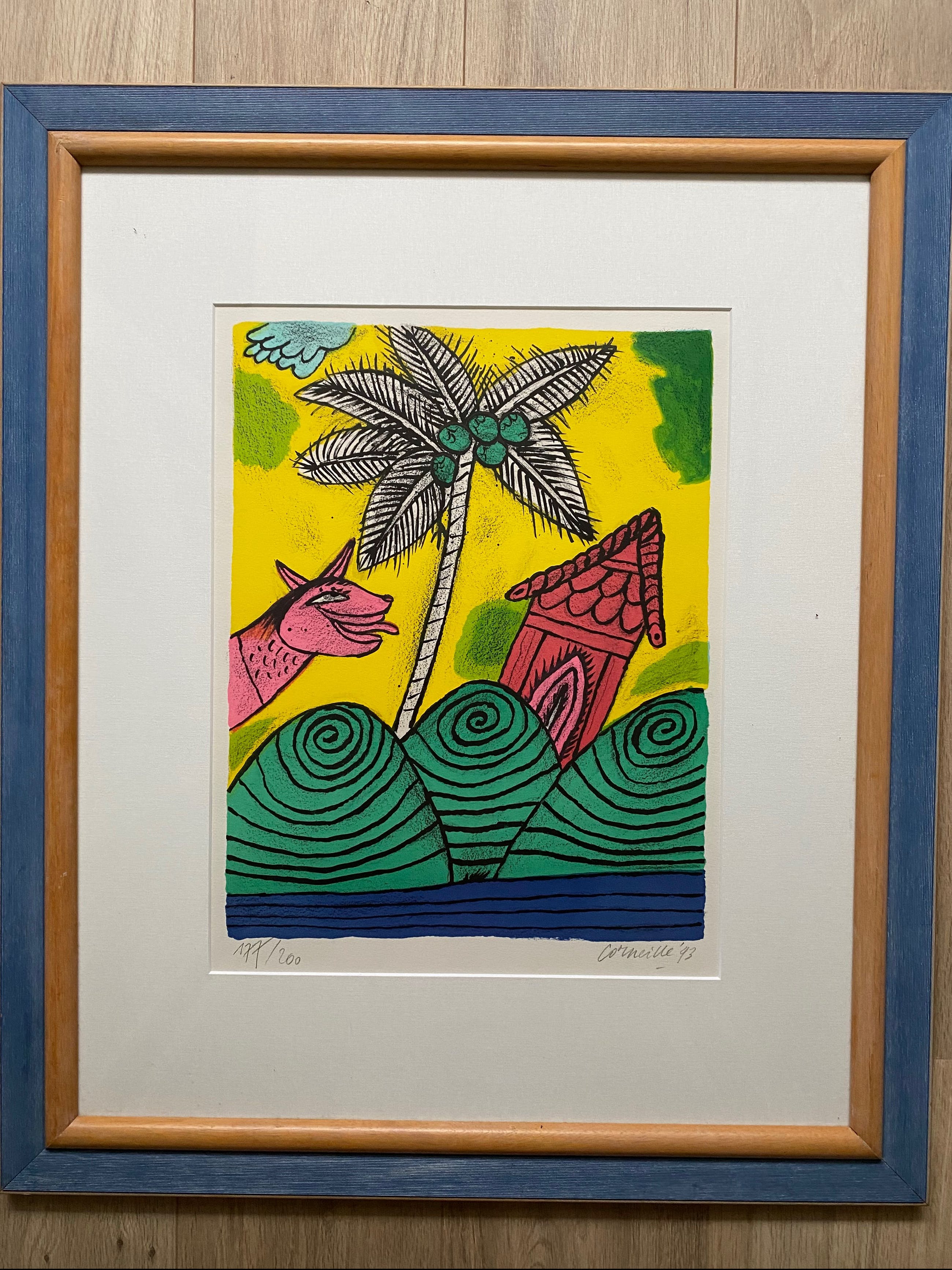 Schitterende zeefdruk van Corneille, mede oprichter van Cobra. Kenmerkend onderwerp in de figuratieve stijl van Corneille. Het werk is begin negentiger jaren aangeschaft bij een lijstenmaker en altijd in bezit geweest. Professioneel ingelijst. Naast het werk wordt ook de oorspronkelijke verzamelmap, een foto en een gesigneerd document van Corneille over het kunstwerk aangeboden.