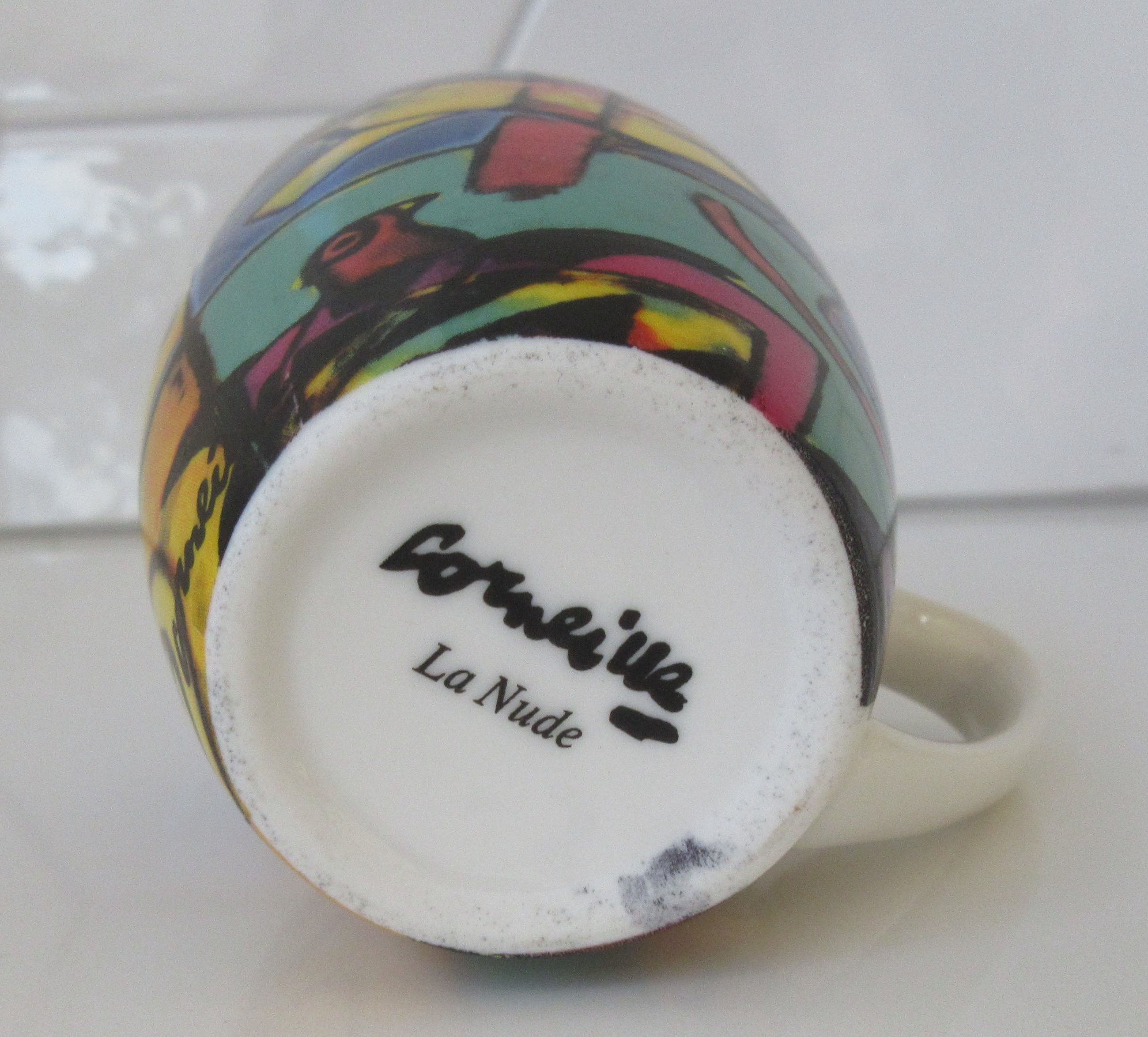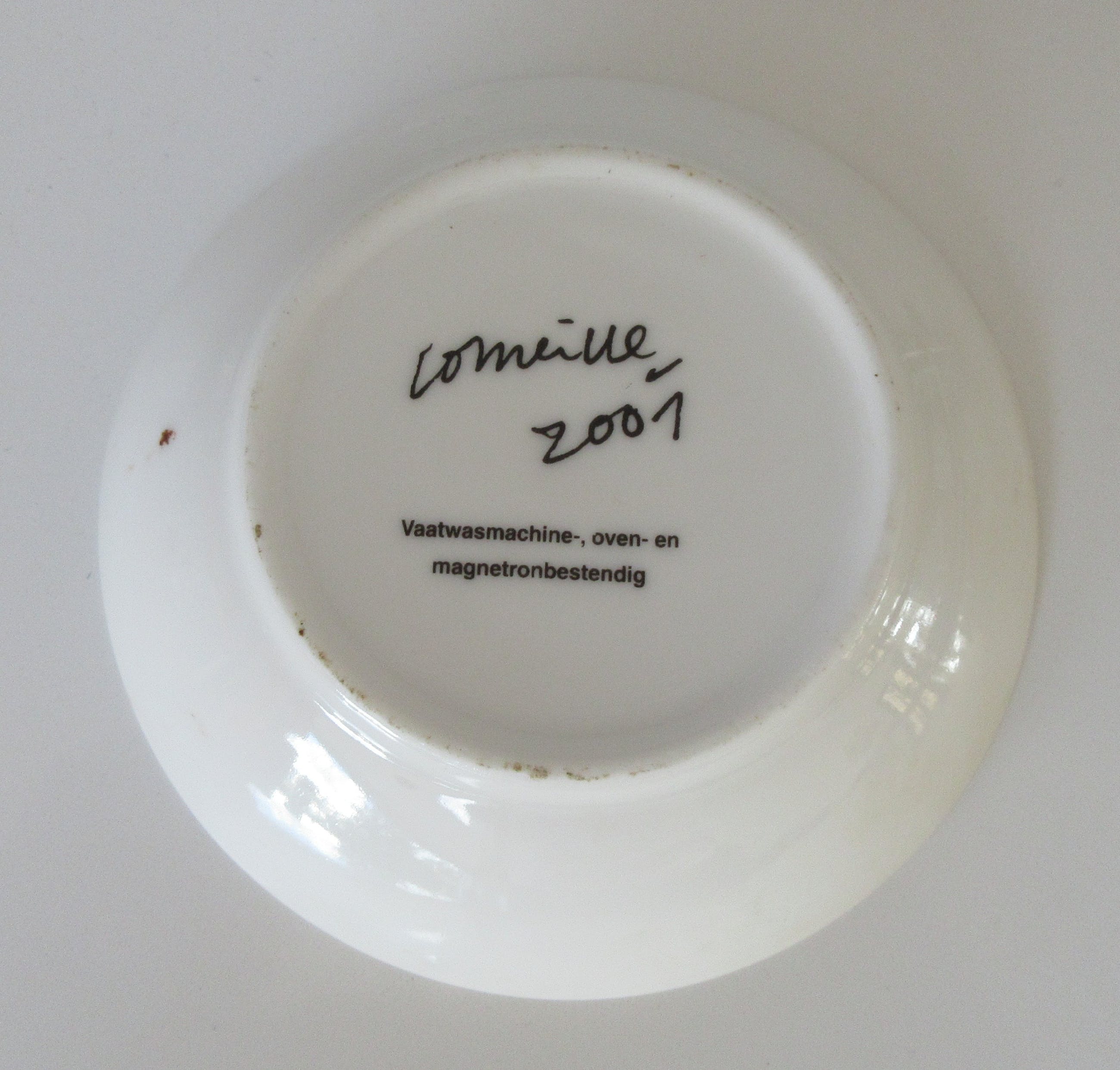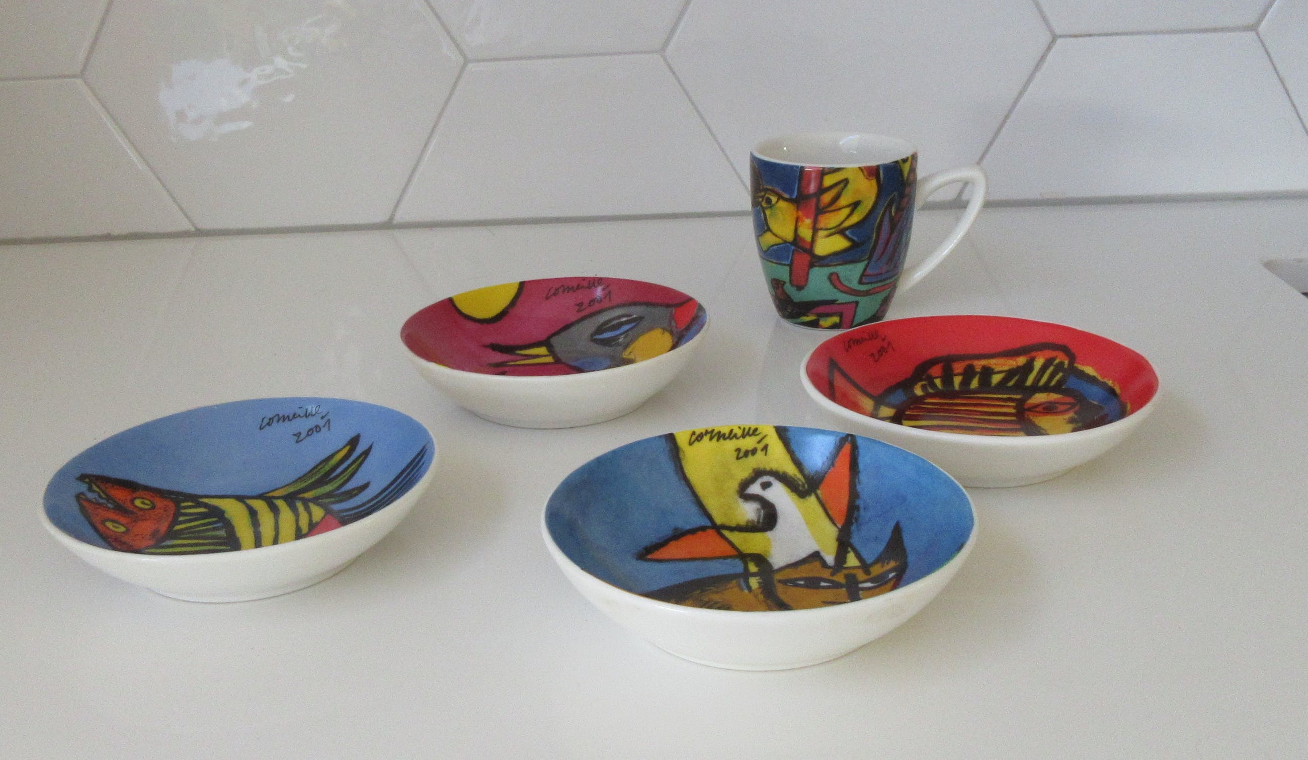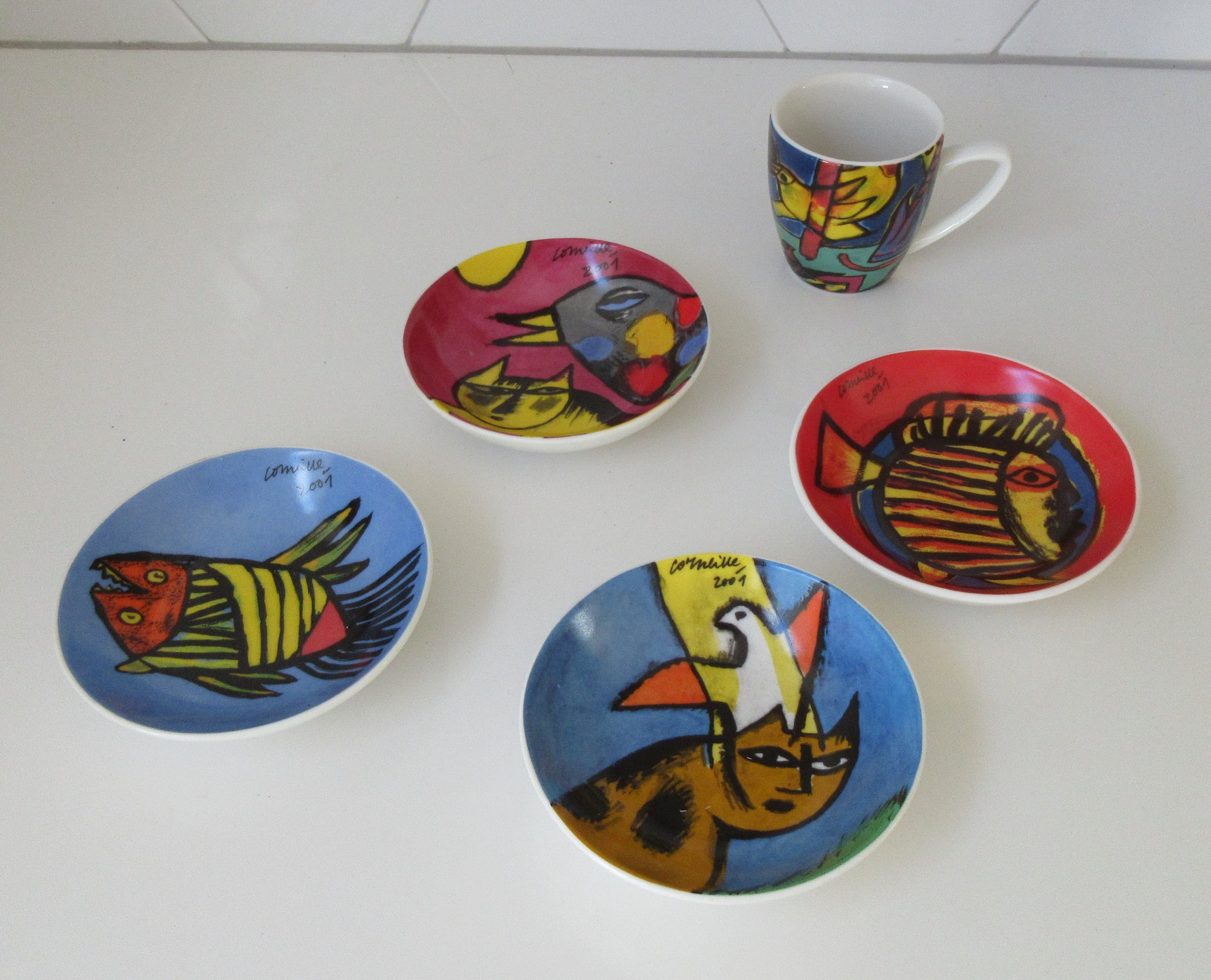 Vier porseleinen onderzetters en een kopje van Corneille. Alle vijf in prima conditie en gesigneerd. Het kopje heeft een afbeelding van het werk "La Nude".