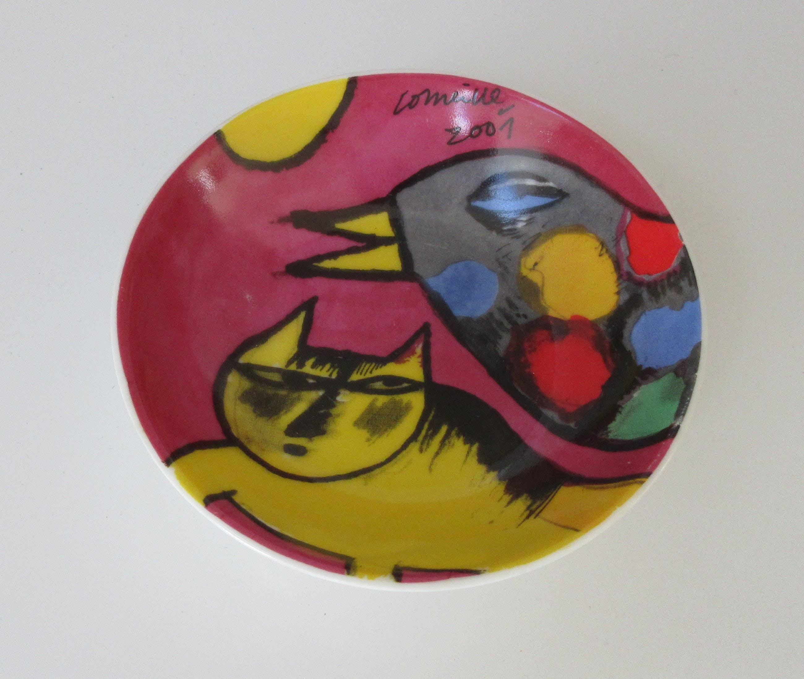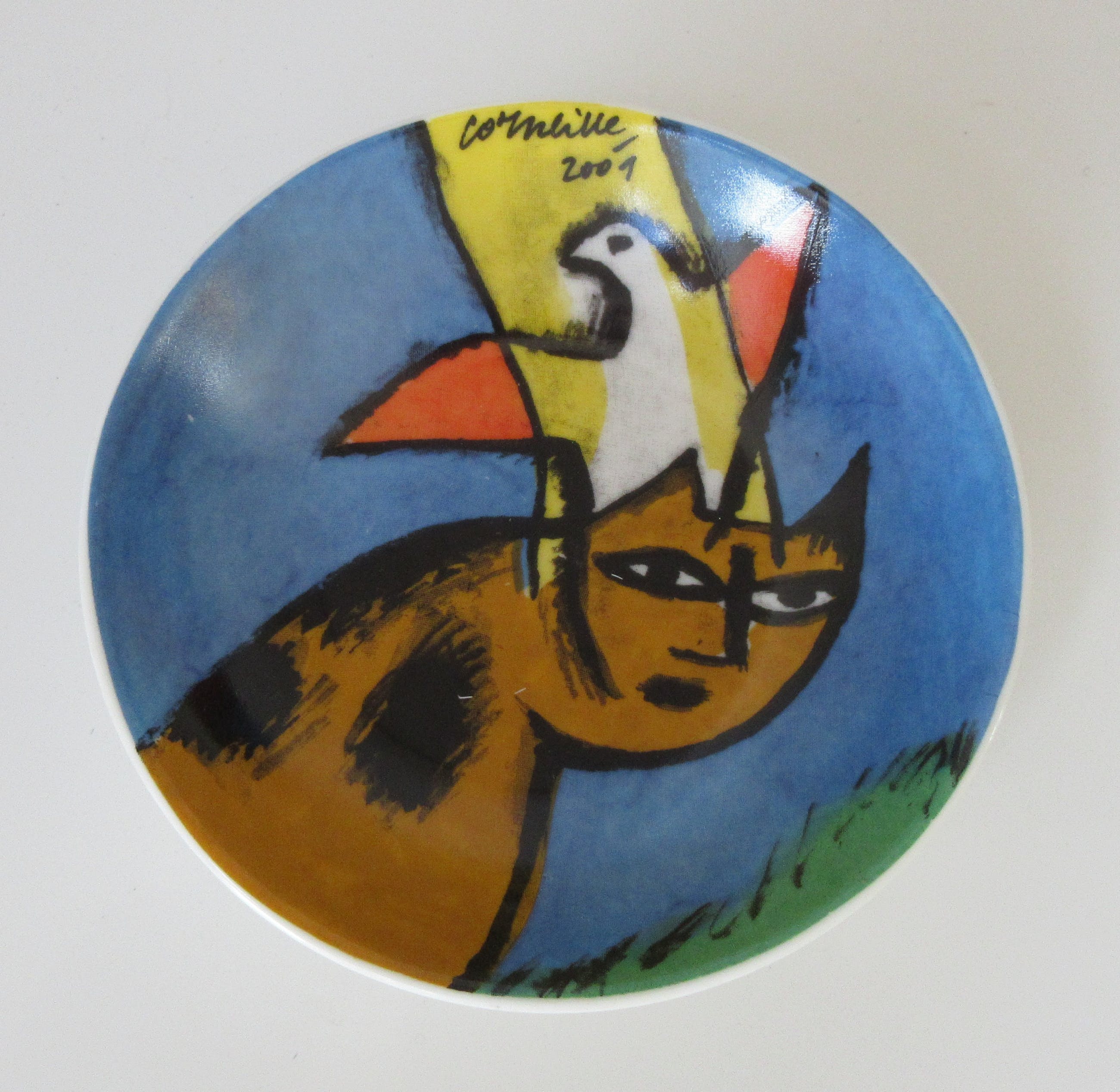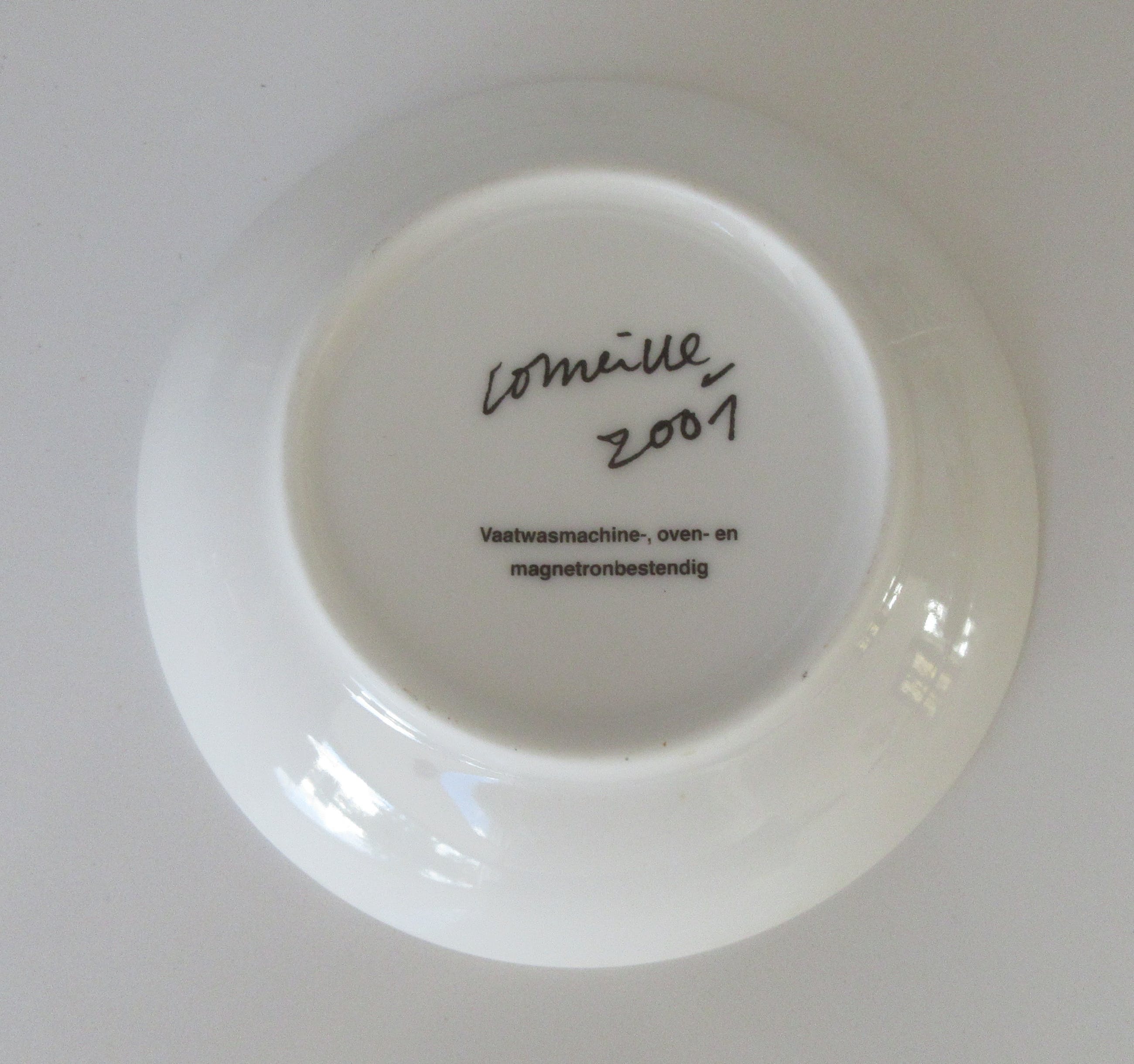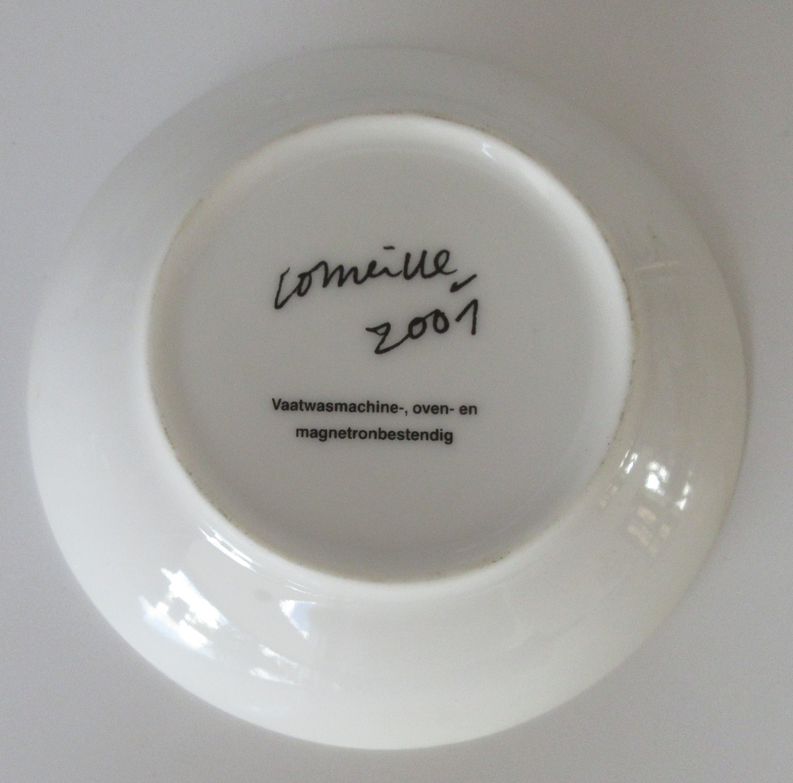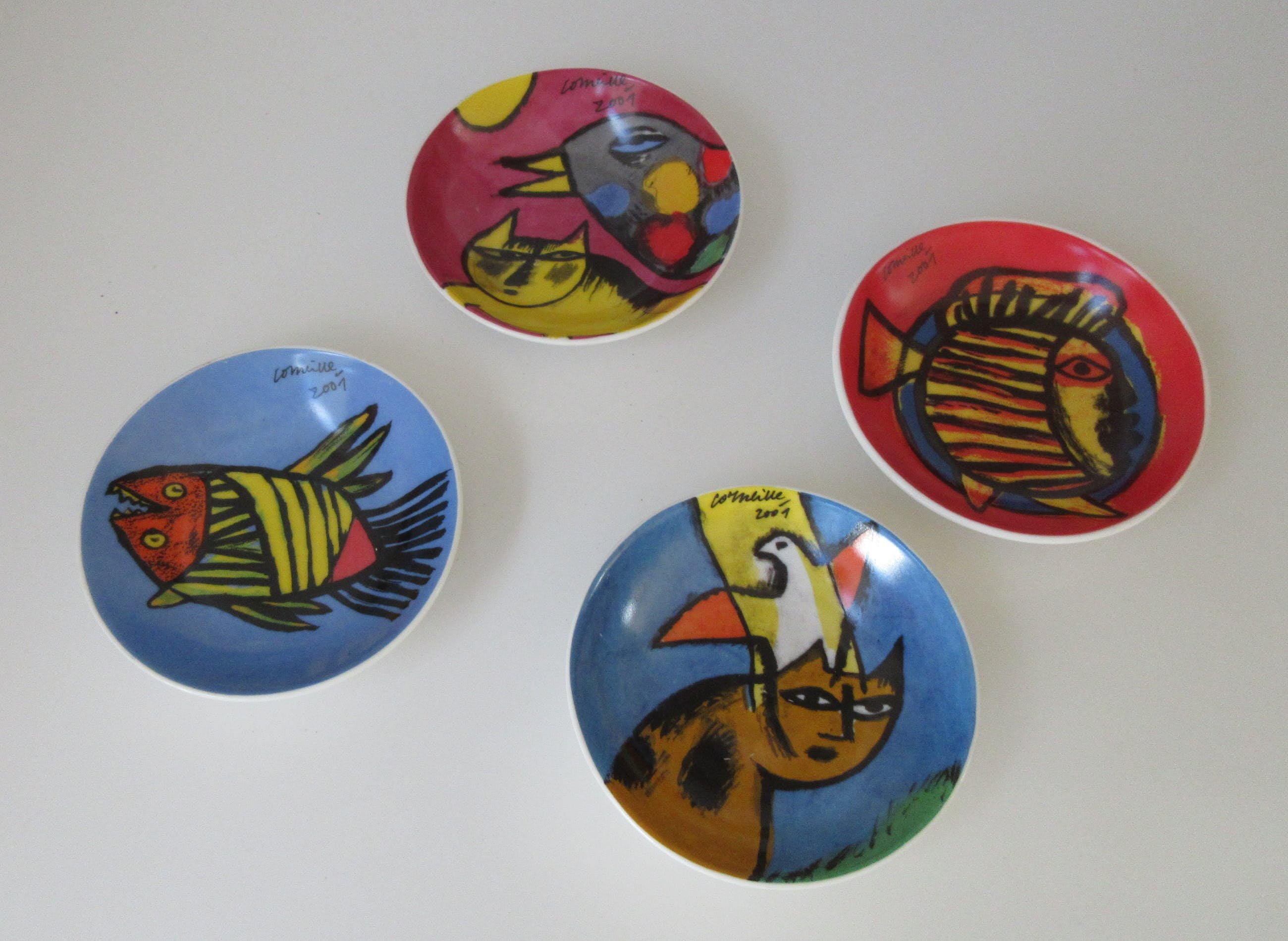 Vier porseleinen onderzetters en een kopje van Corneille. Alle vijf in prima conditie en gesigneerd. Het kopje heeft een afbeelding van het werk "La Nude".