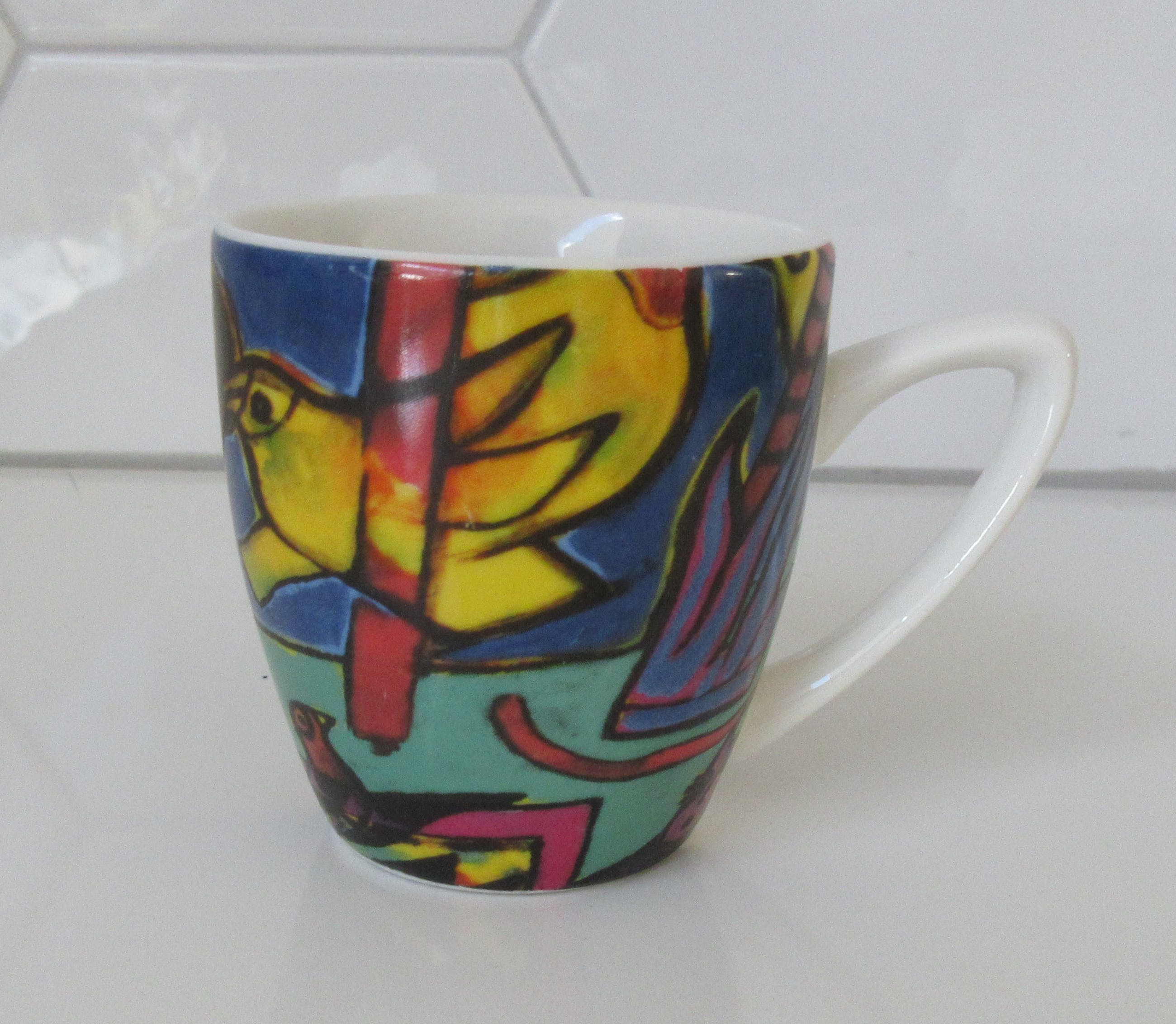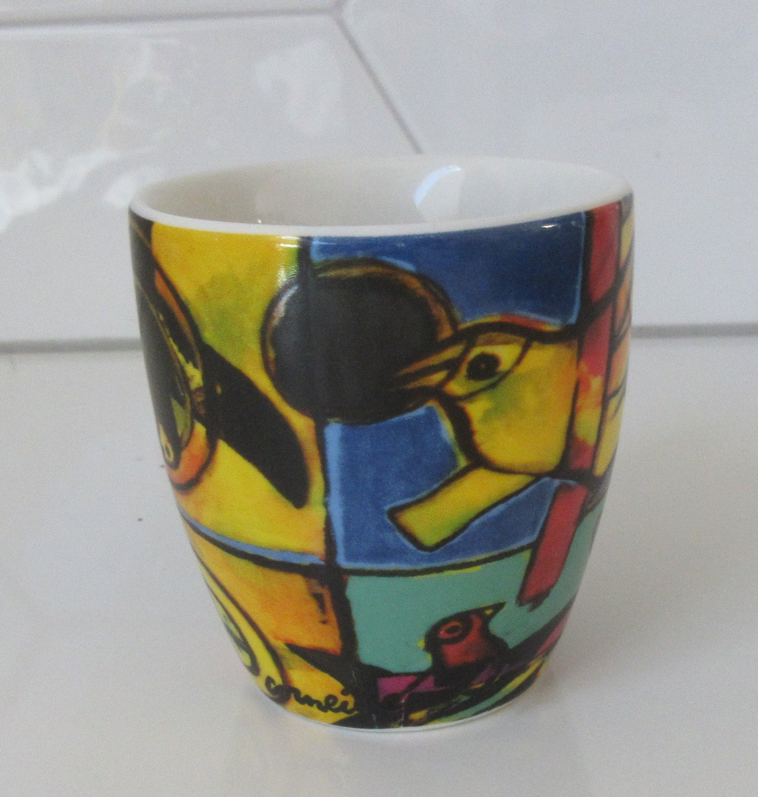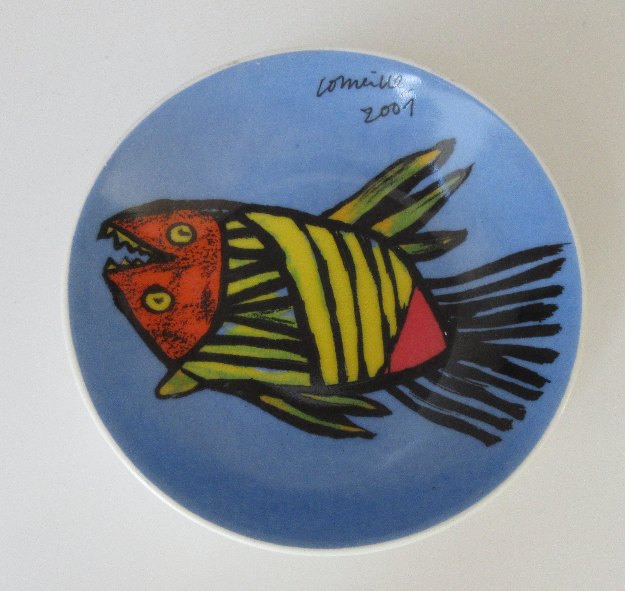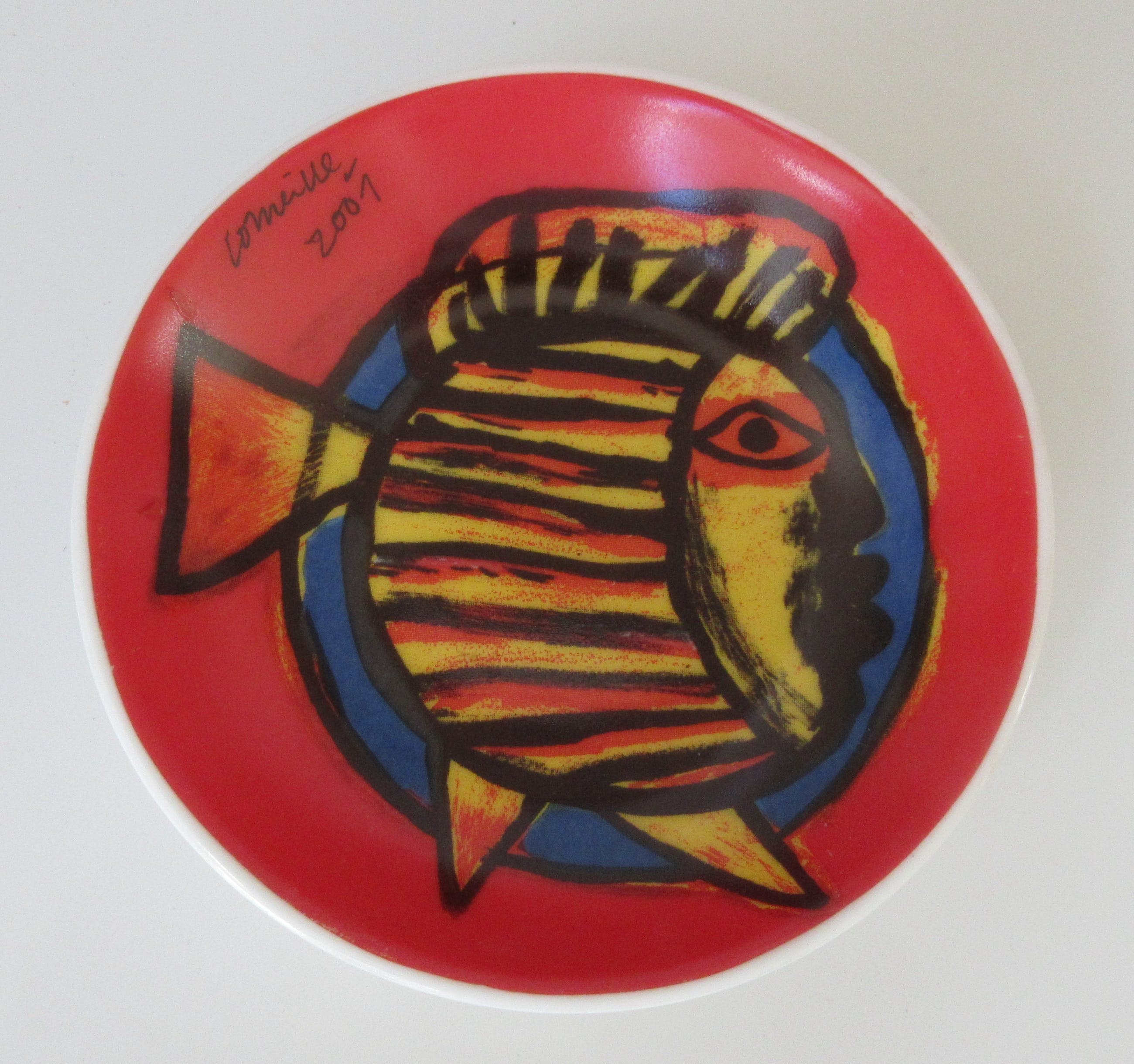 Vier porseleinen onderzetters en een kopje van Corneille. Alle vijf in prima conditie en gesigneerd. Het kopje heeft een afbeelding van het werk "La Nude".