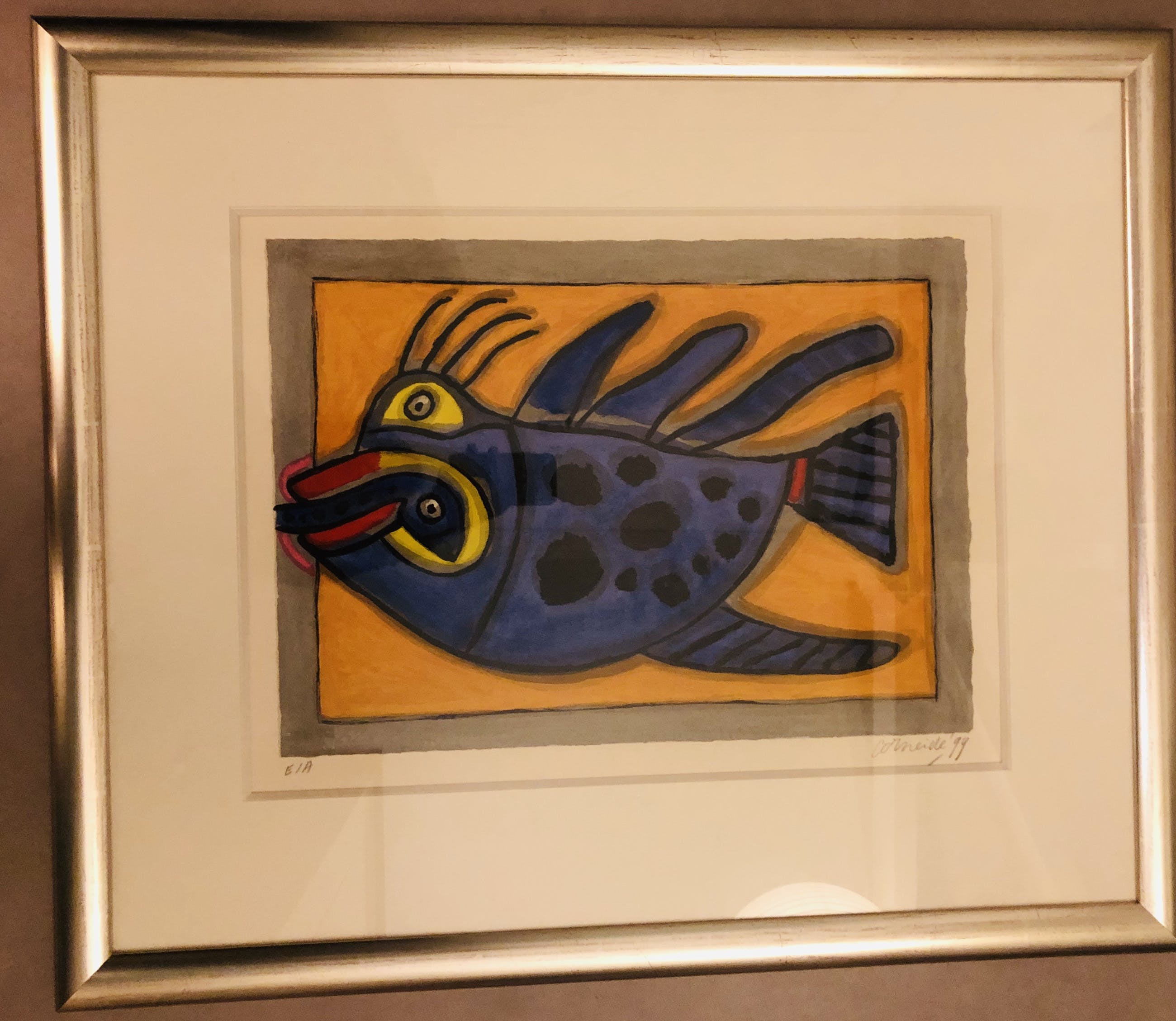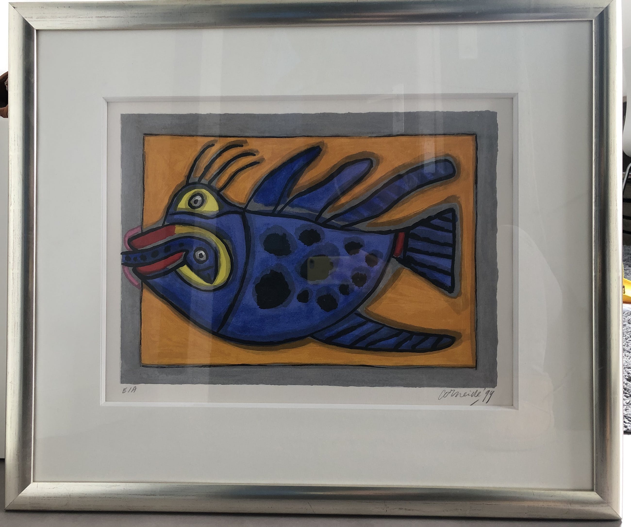 Bijzondere épreuve d'artiste van Corneille. In zilverkleurige lijst met verdikt passe-partout met wit biseaux.