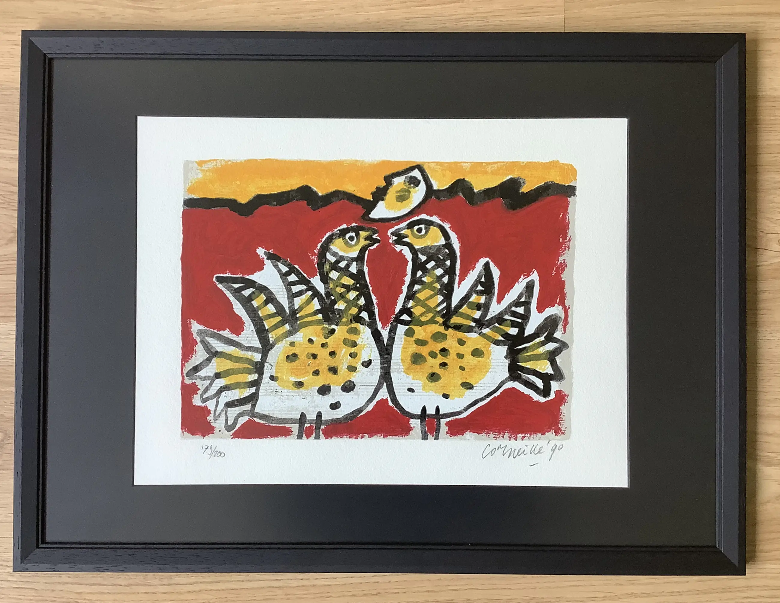Ingelijst in houten zwarte lijst, in een zwart passe partout, in ontspiegeld glas. Breedte lijst 2,5 cm. Hoogte lijst 1,5 cm. Kan zo aan de muur.