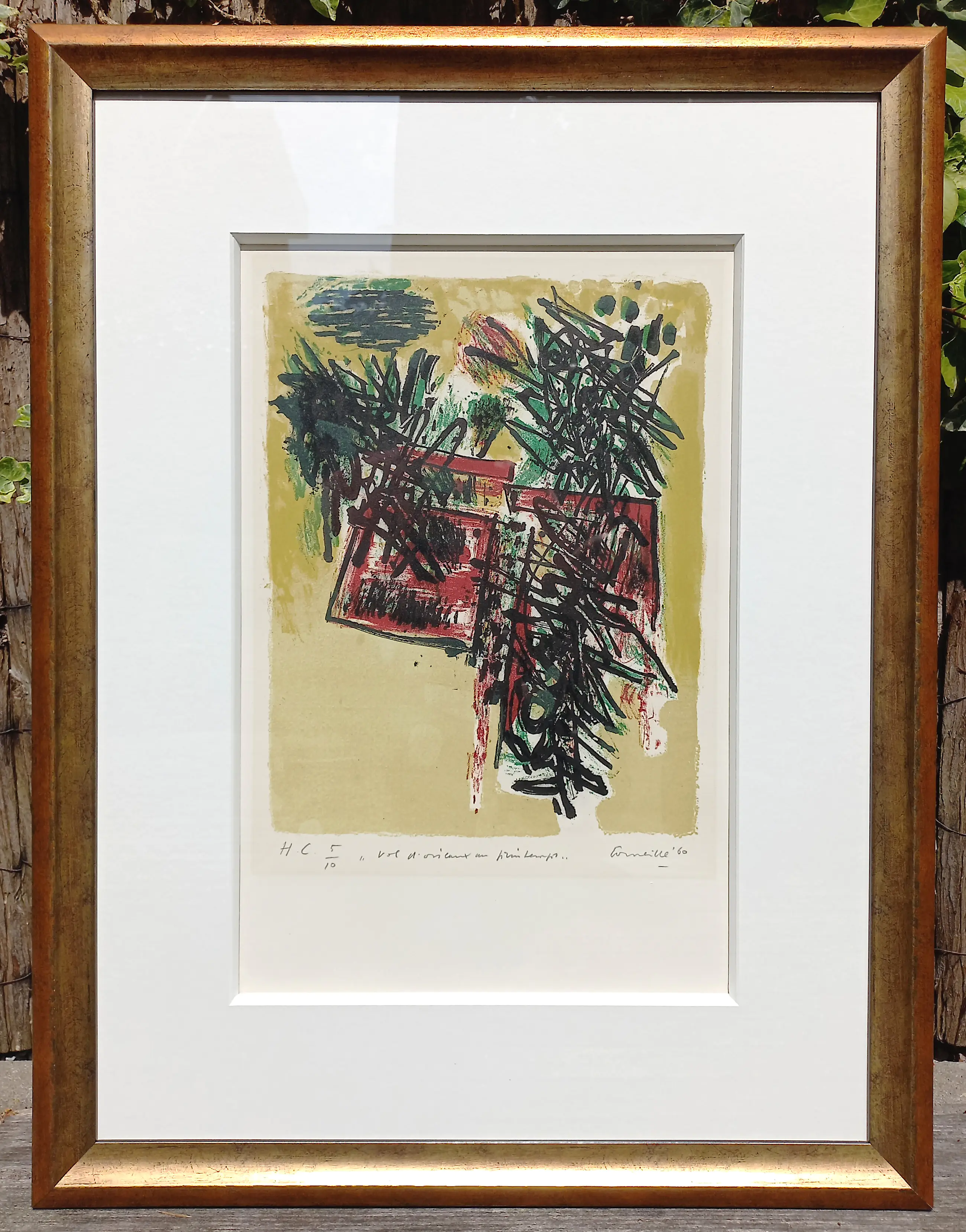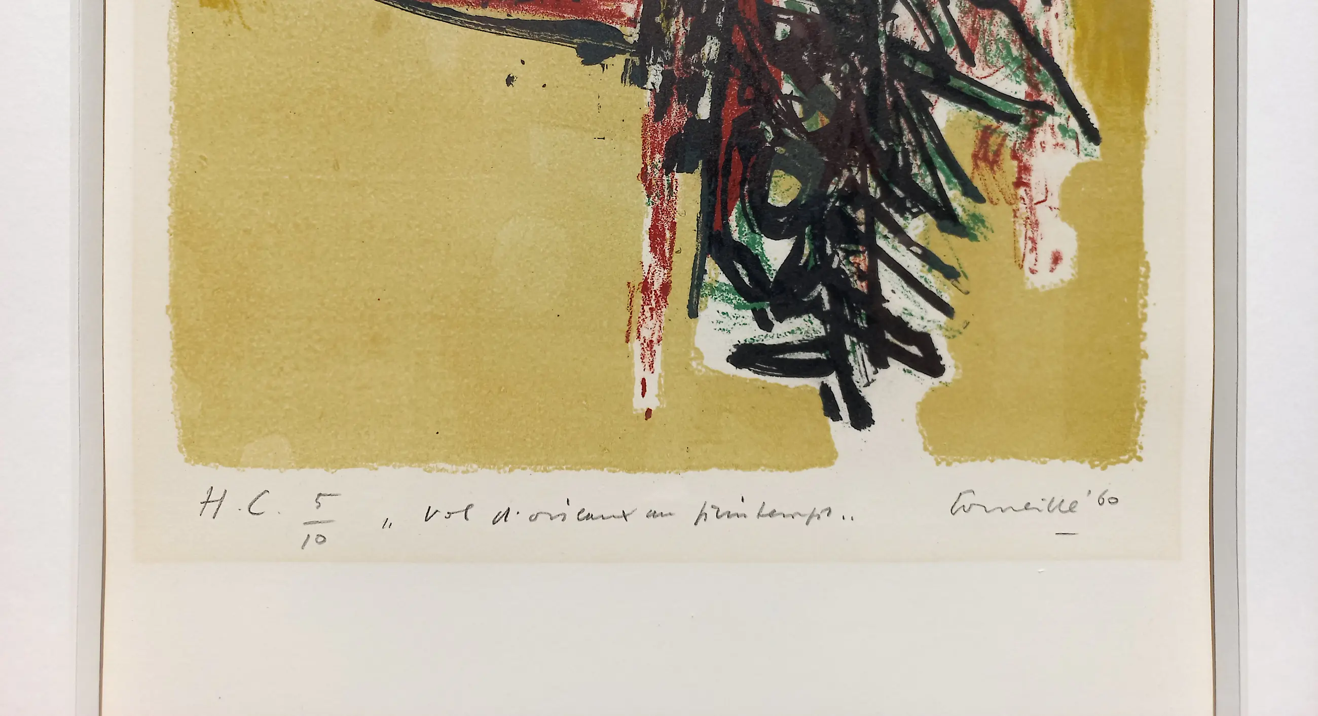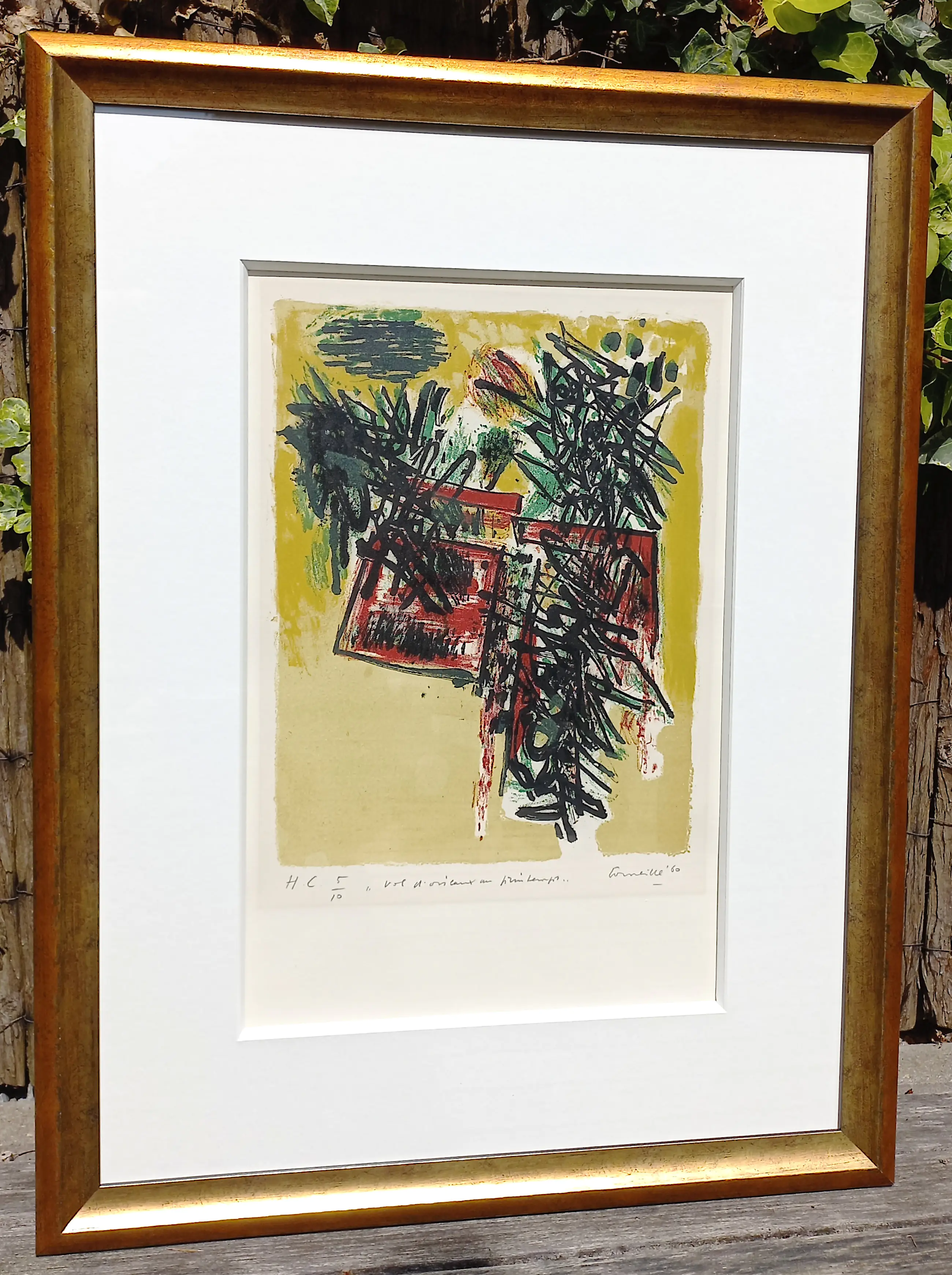Zeer mooie compositie van Corneille uit de uitgave Vol d’oiseaux. Litho op Rives papier, met potlood gesigneerd, gedateerd (‘60), getiteld en genummerd (H.C. 5/10). Zeer mooi, professioneel ingelijst, achter glas en met luxueus, zuurvrij passe-partout. Litho in goede conditie, lijst en passe-partout in uitstekende conditie. Literatuur: Donkersloot 81. Herkomst: Tom Okker Art.