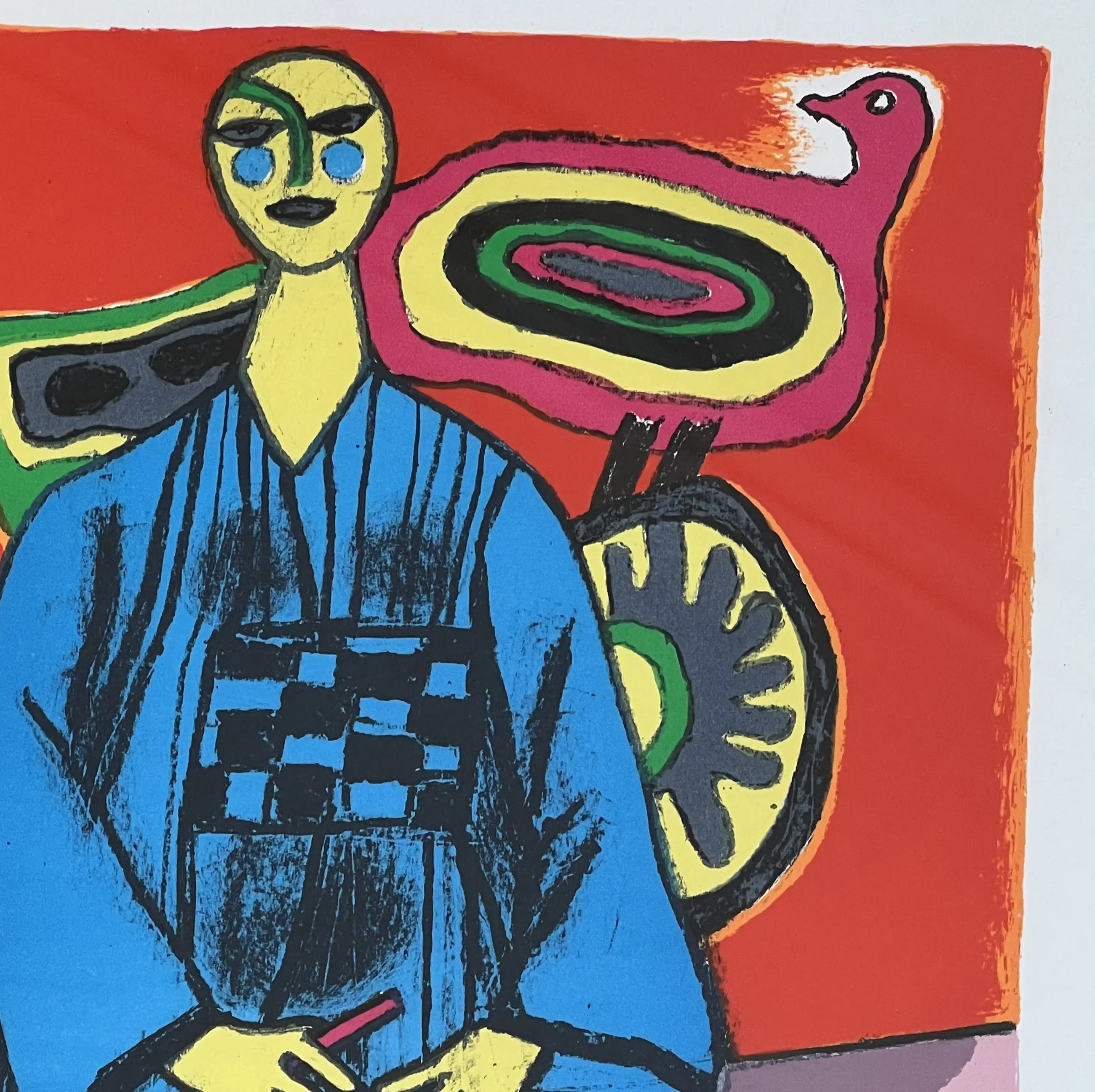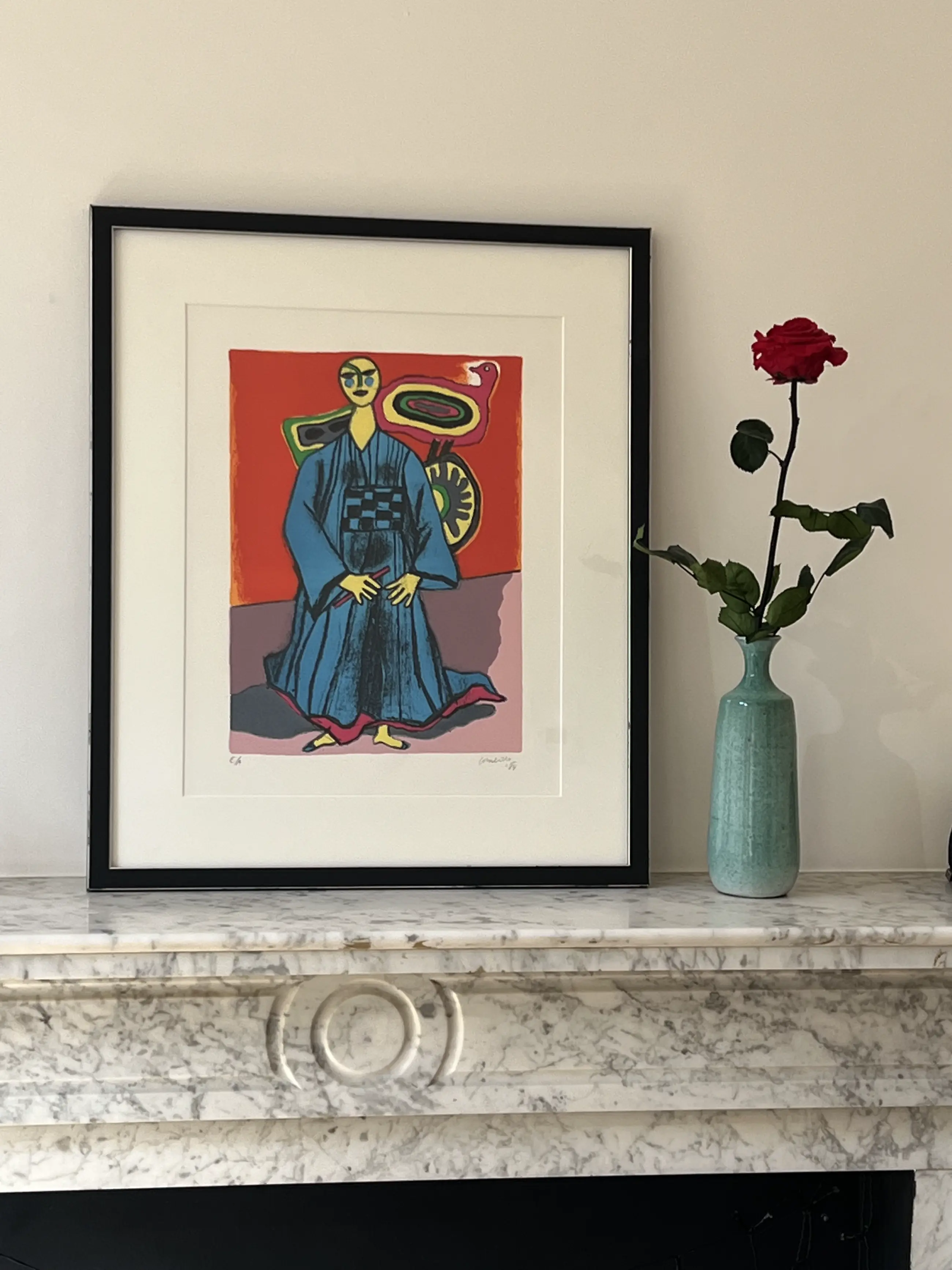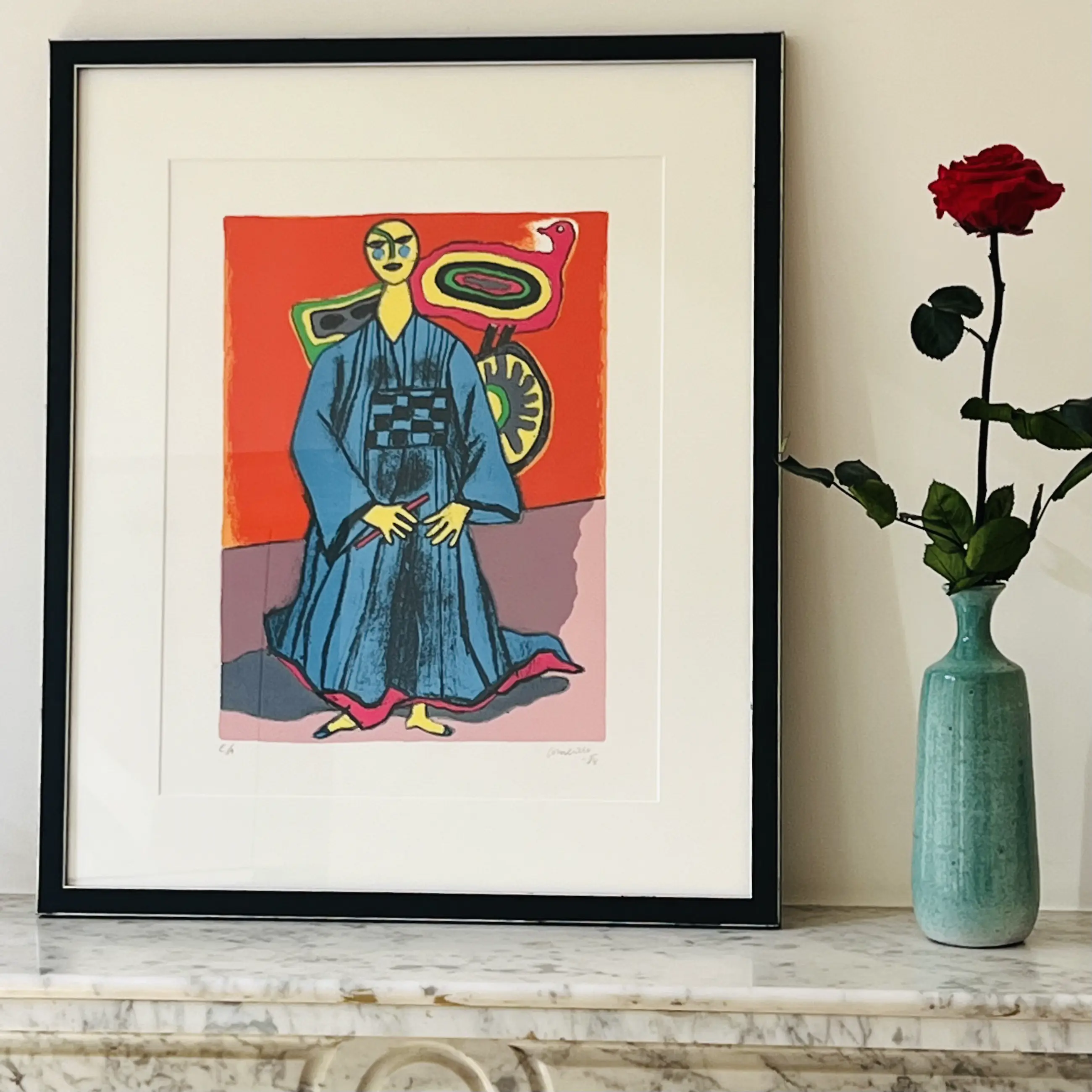 Vrouw en kimono en vliegers - Herinnering aan Japan Prachtig werk van 1984, met een mooie beheersing van kleuren en joviaal. Perfecte staat 46 x 3§ cm & 63 x 53 cm met lijst.