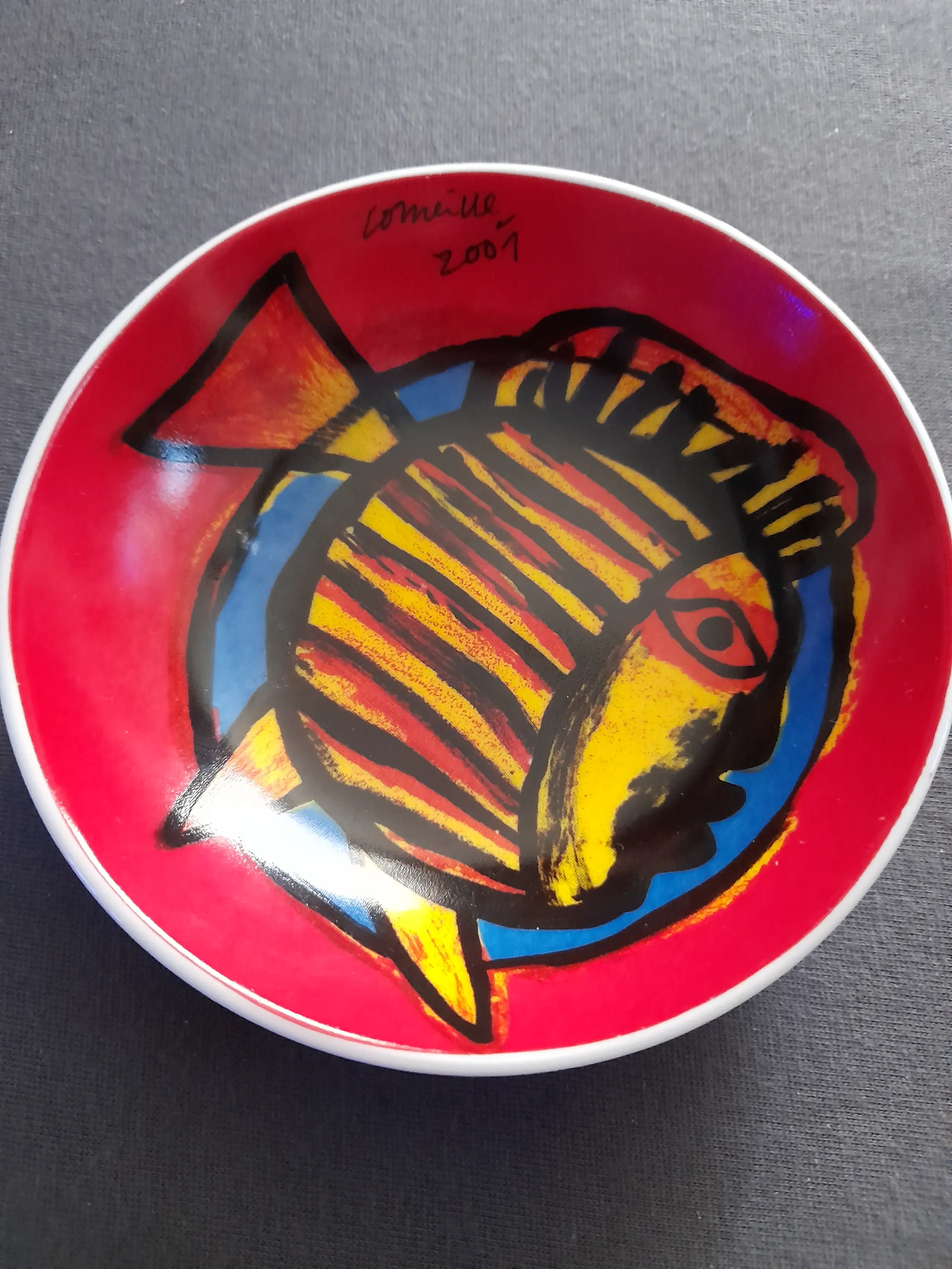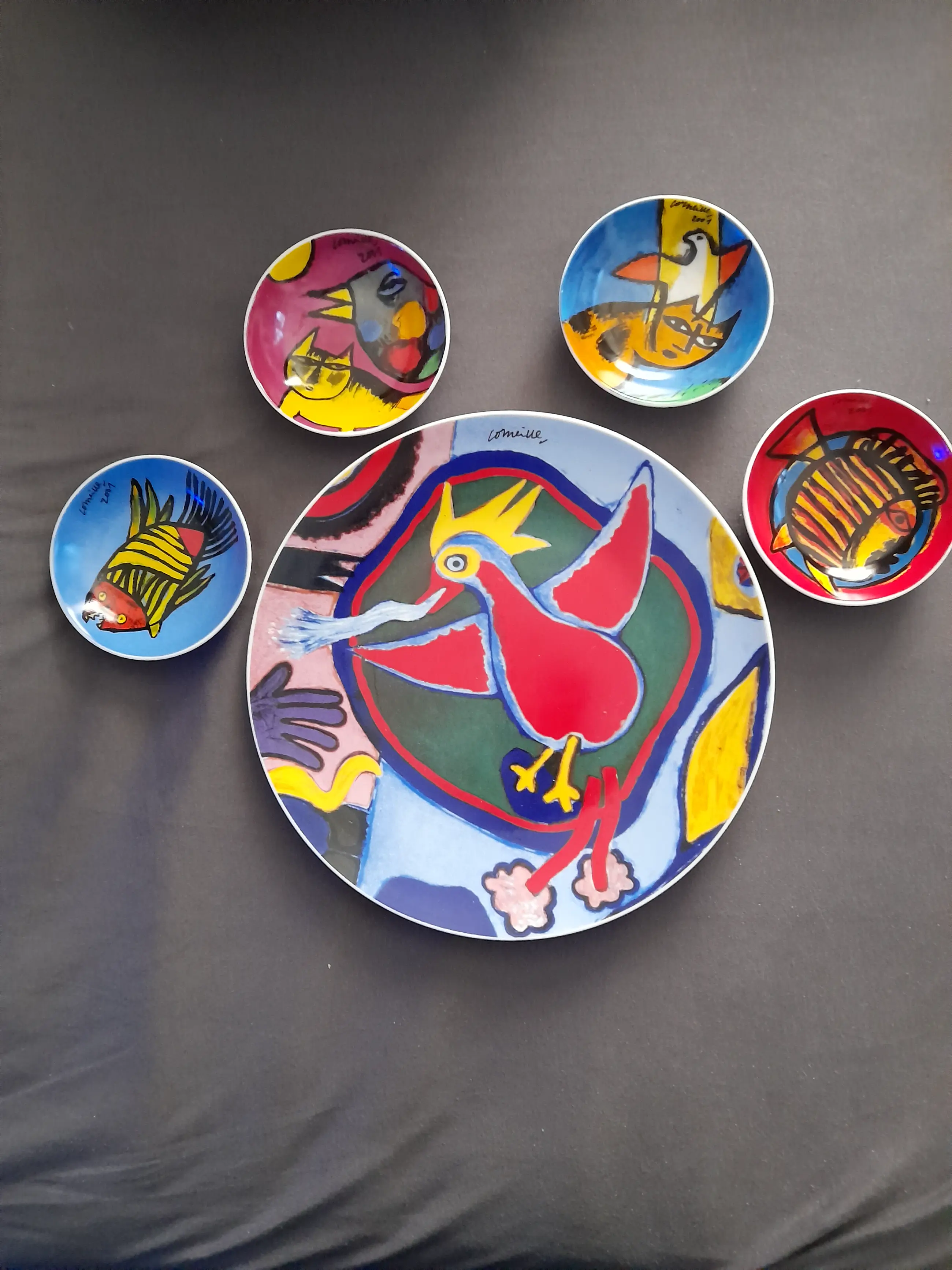 Bord genaamd de Vuurvogel één maal Twee komen met de vis als afbeelding uit 2001 Twee komen met de een kat en vogel uit 2001 De komen zijn 3 cm hoog en 12 cm breed