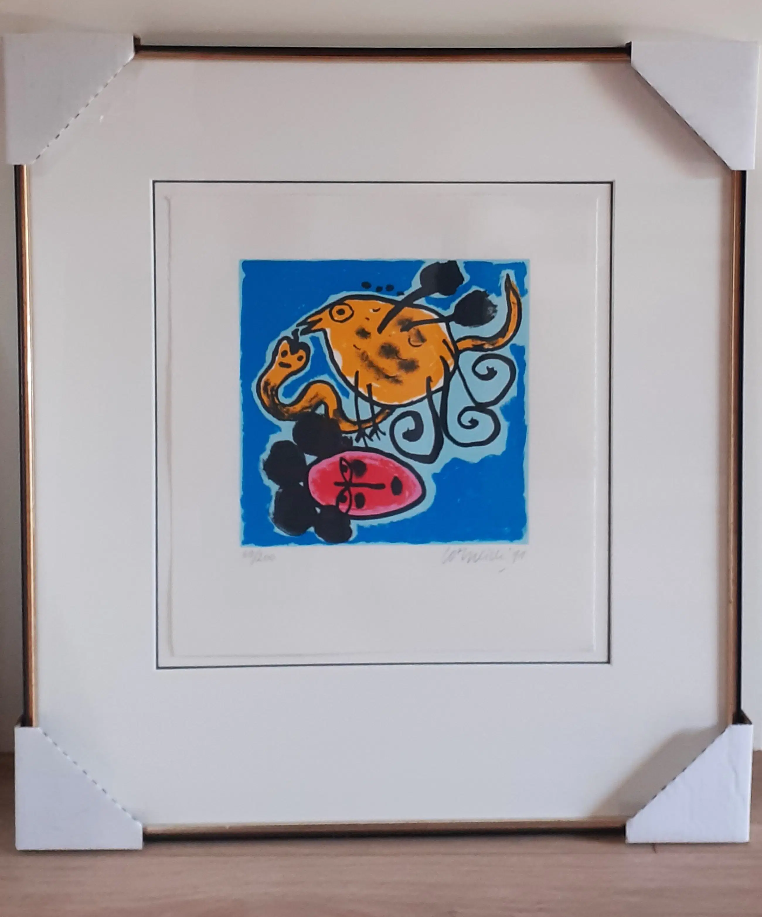 Fraaie zeefdruk van Corneille 'Vrouw, vogel, slang' uit 1991 in prachtige, heldere kleuren
