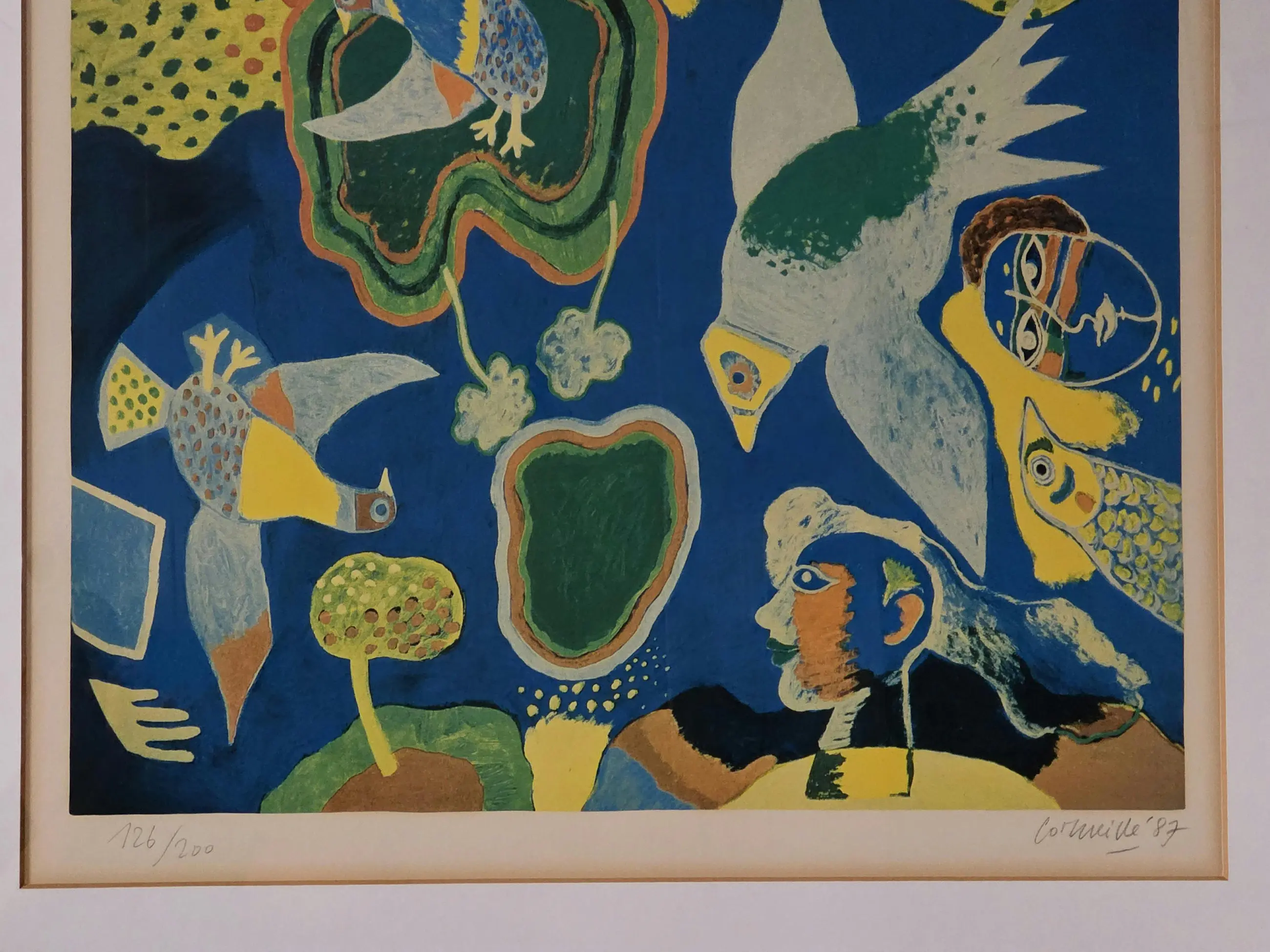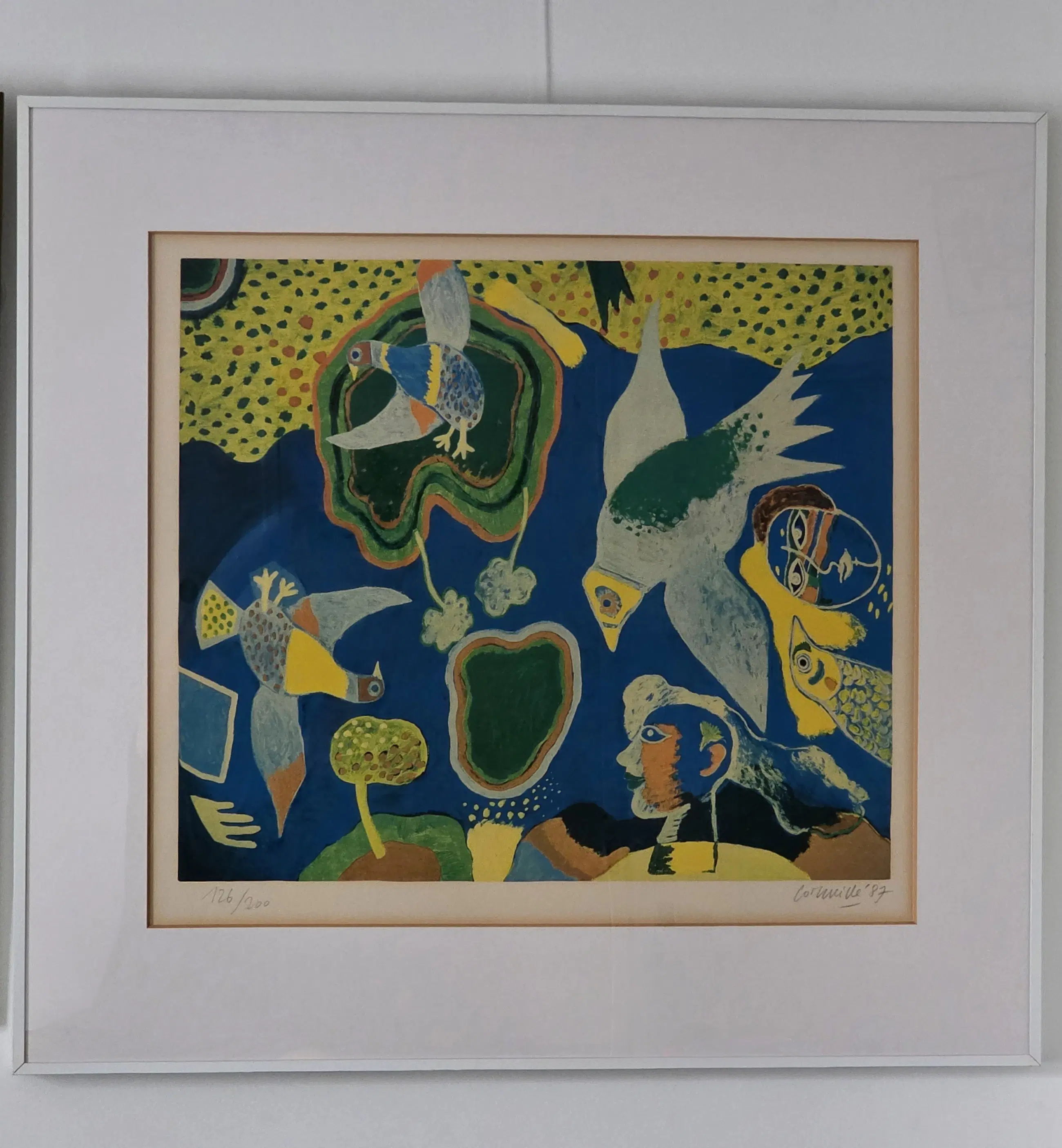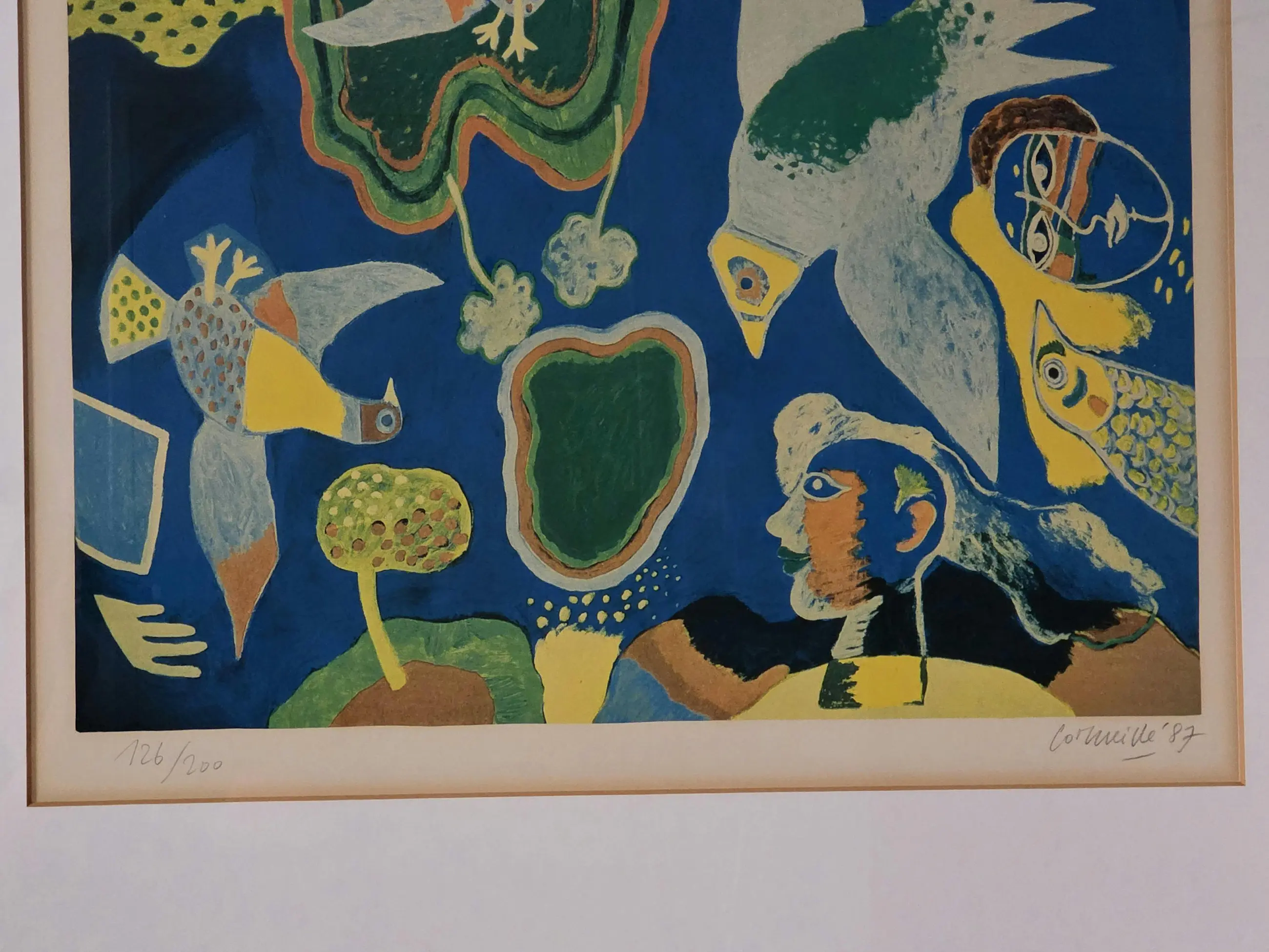 Word geleverd met echtheidscertificaat. Origineel en gelimiteerd werk. Mooie lijst en Passe-partout Handgesigneerd, Genummerd en gedateerd door Corneille. Oplage 126/200. Jaartal 1987.