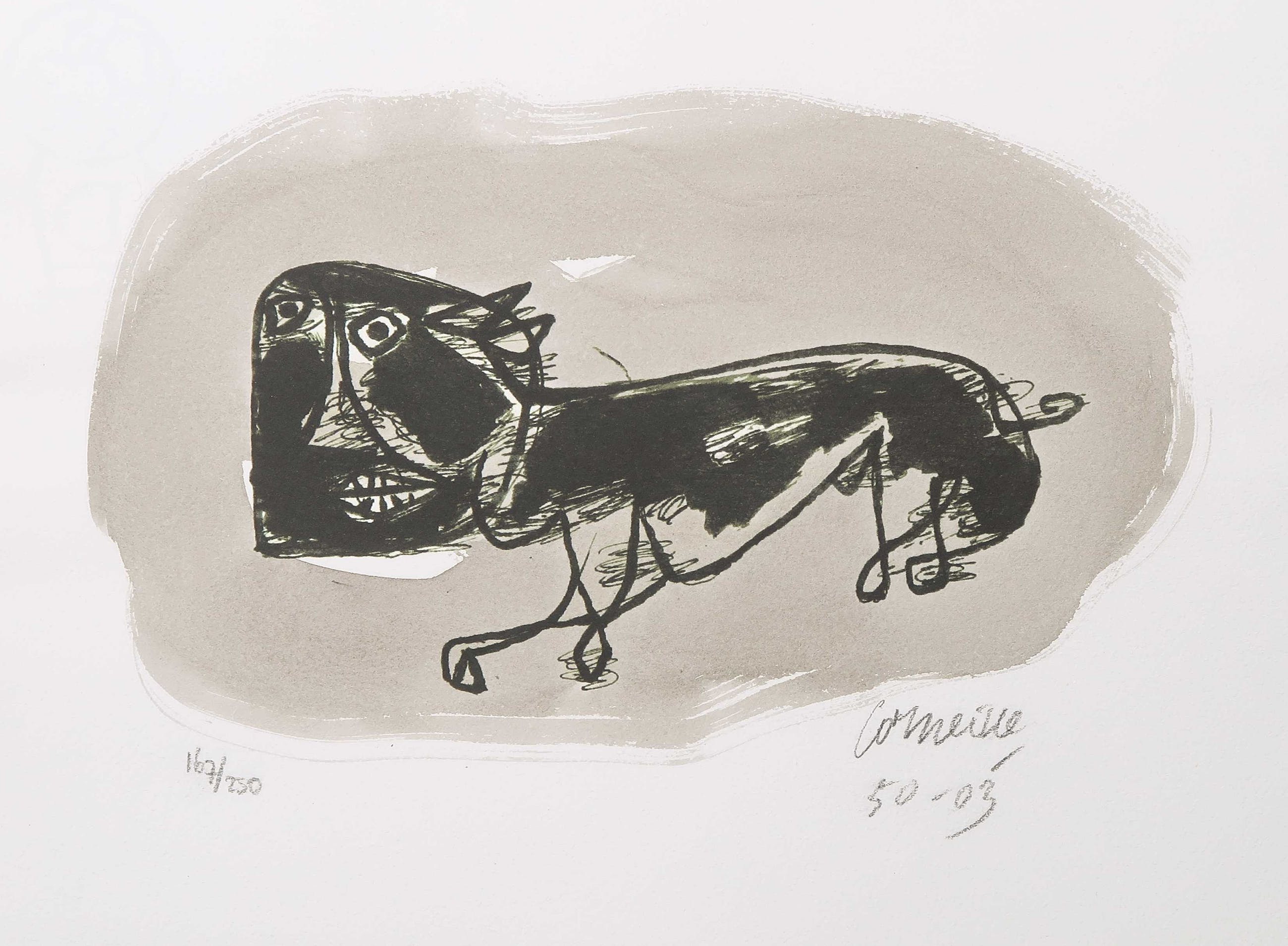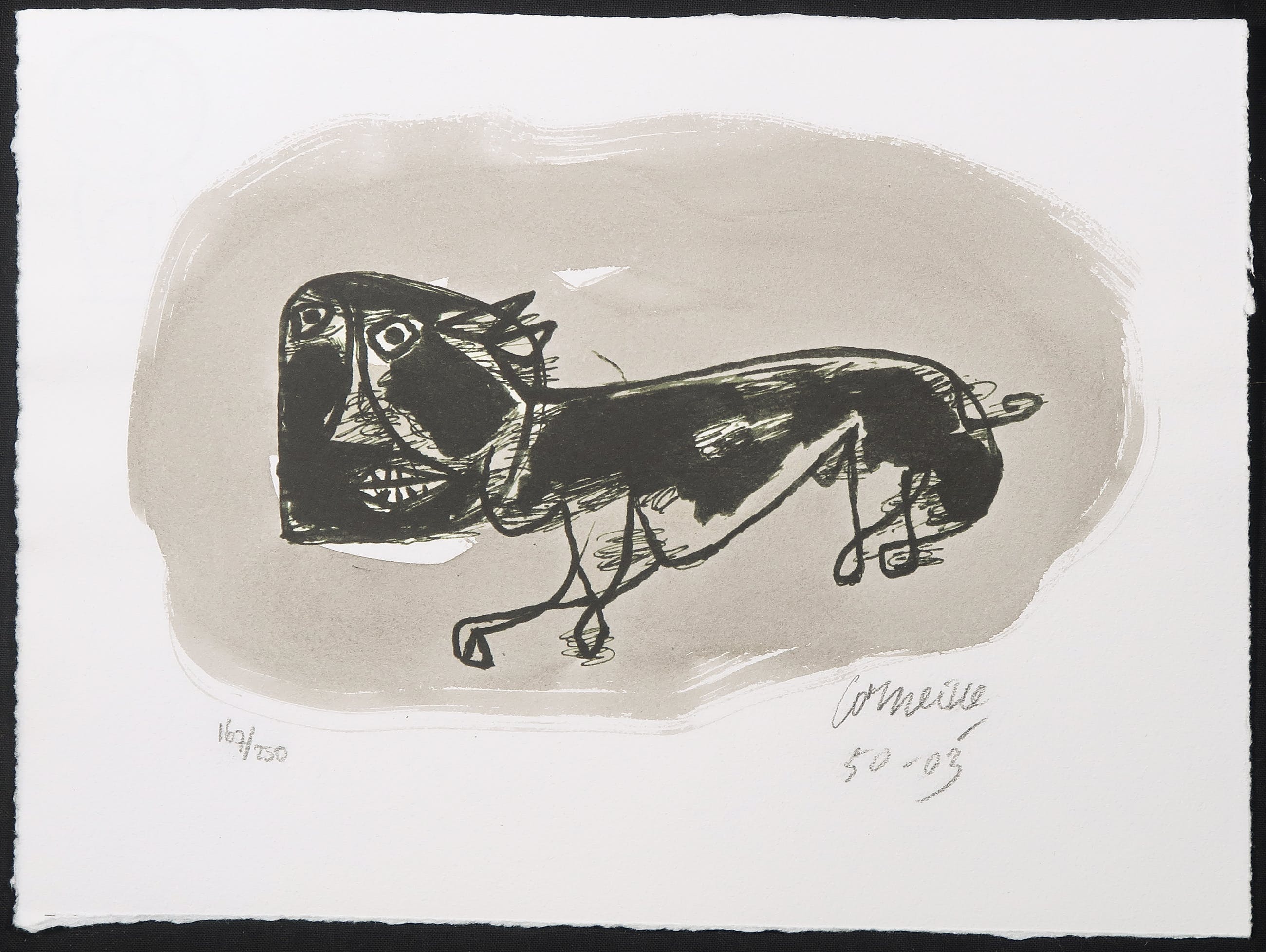 De grijze achtergrond is door Corneille geschilderd en is bij ieder exemplaar van deze oplage net iets anders.