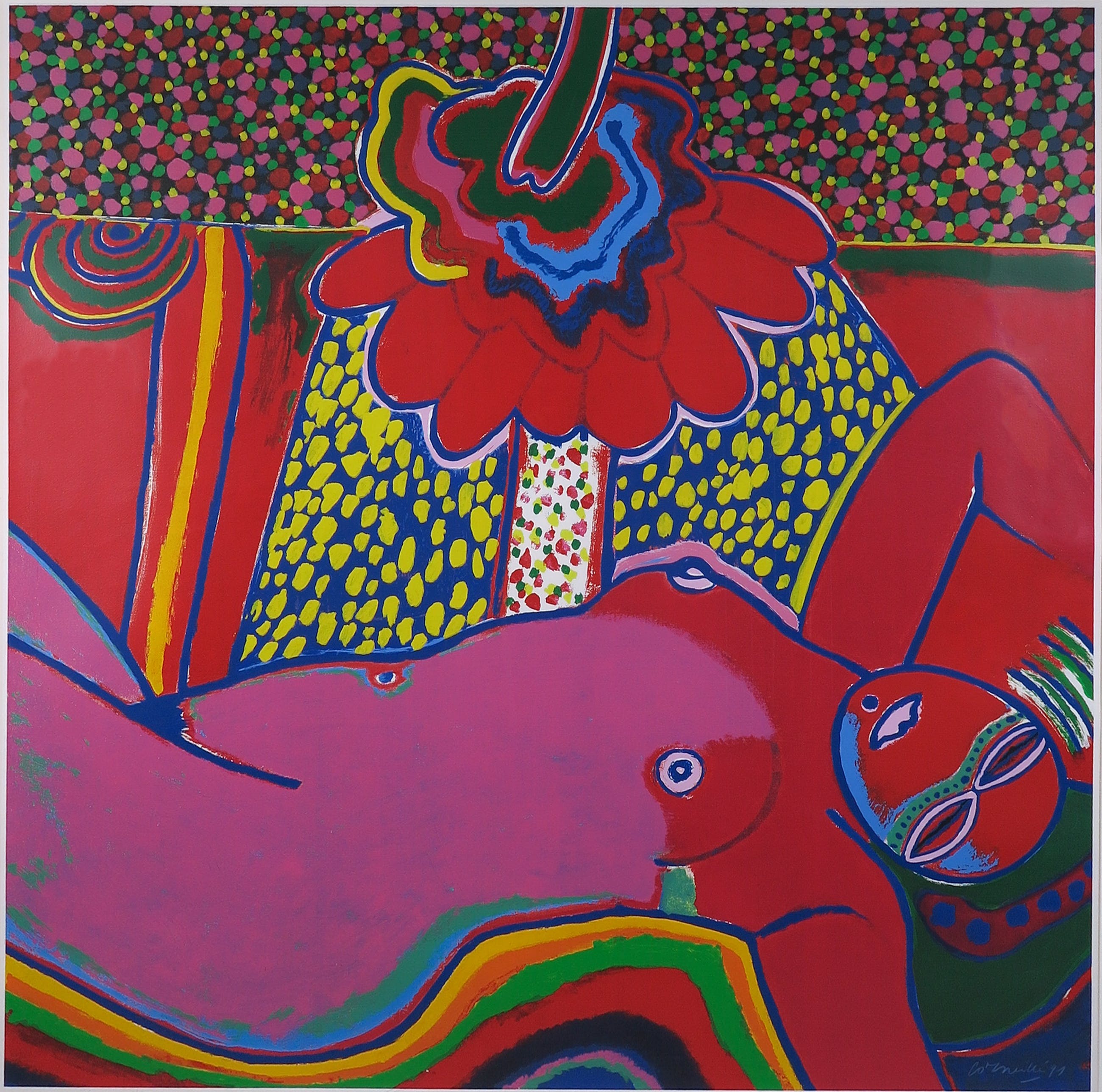 Prachtig ingelijste en grote zeefdruk van Corneille met een van zijn welbekende thema's.