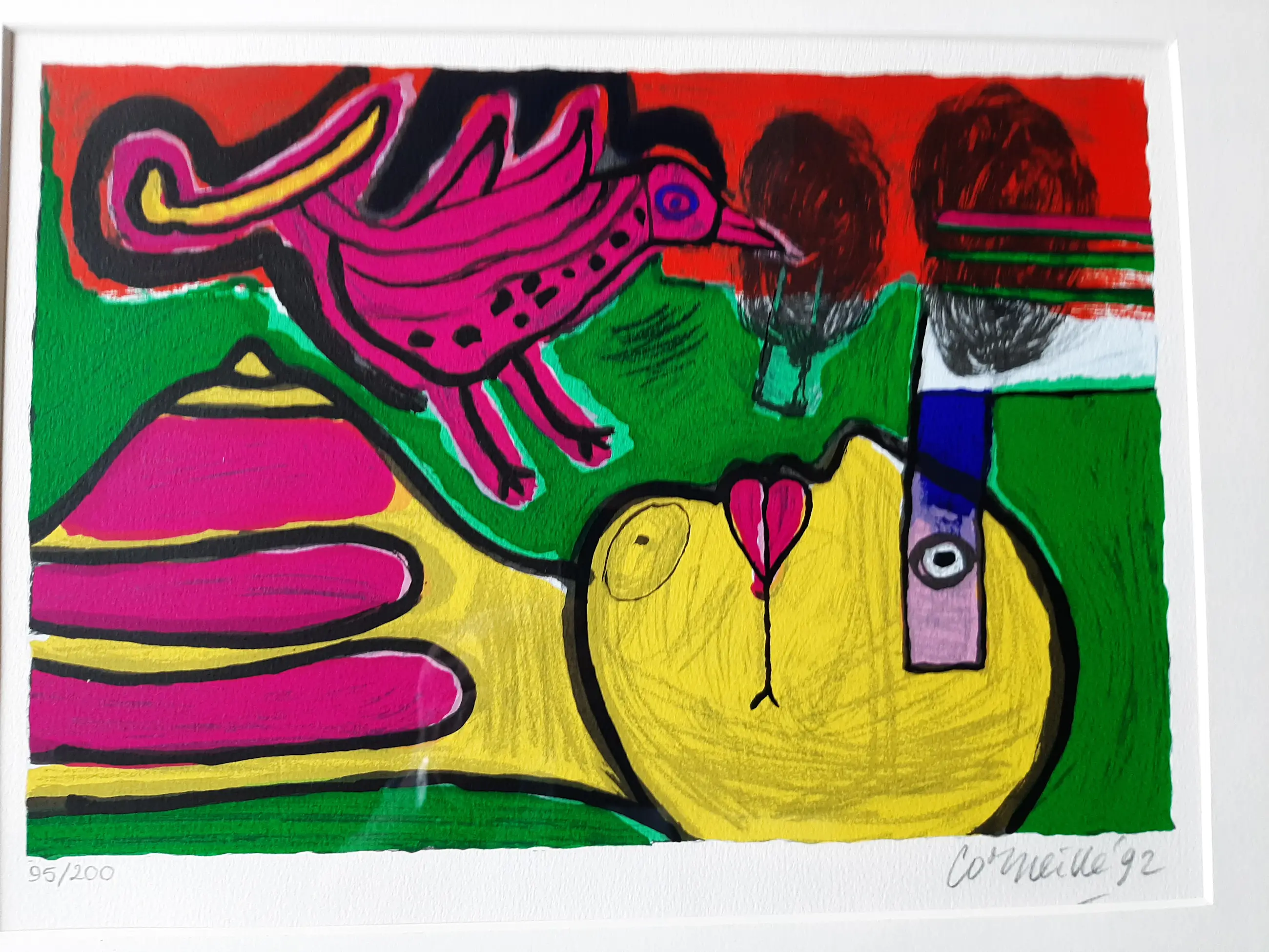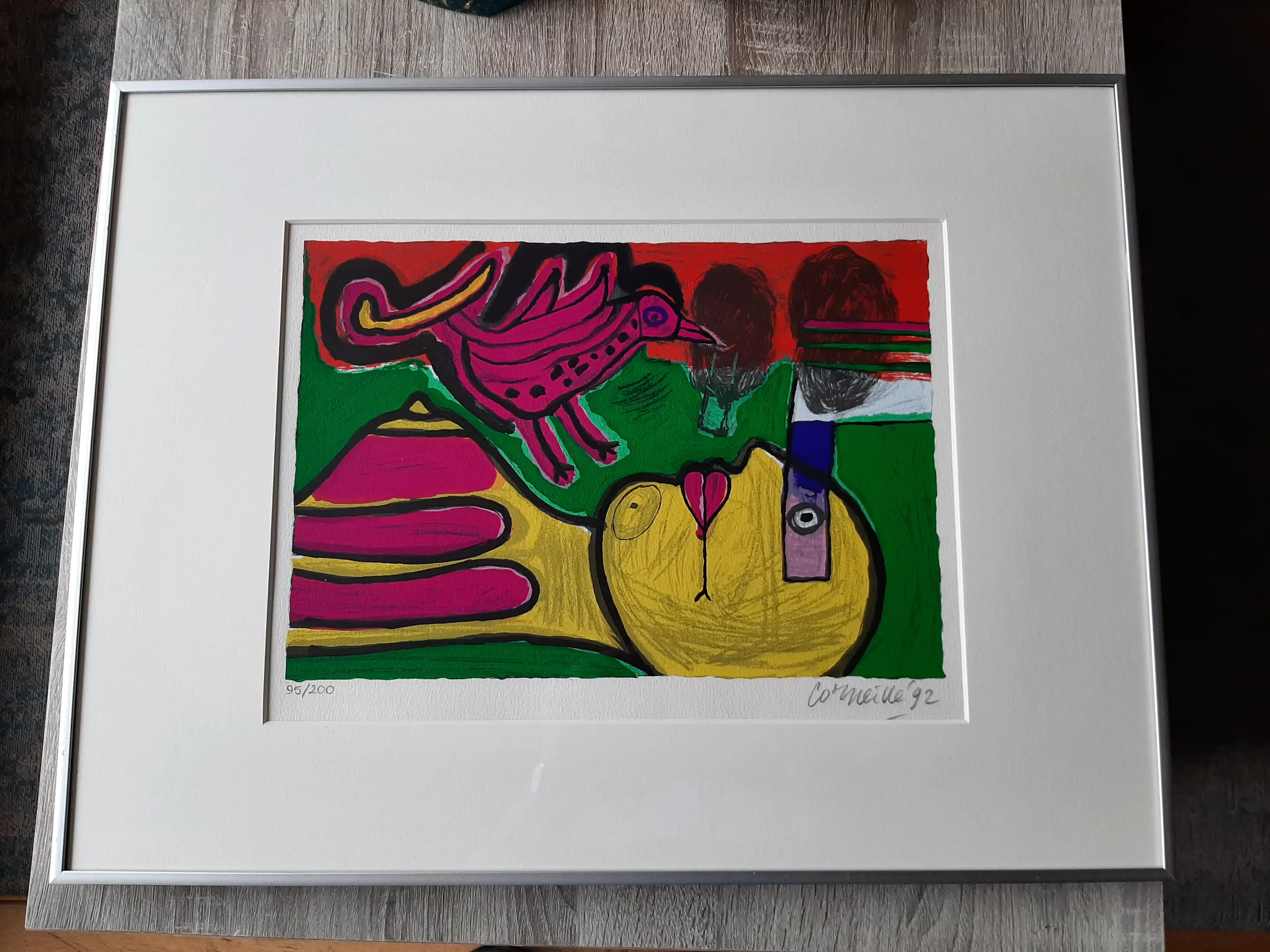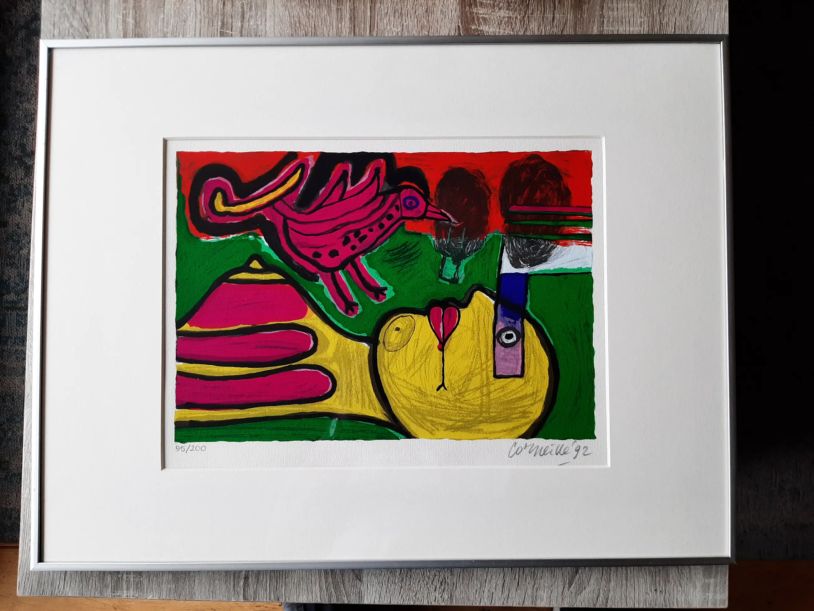 Zeefdruk van Corneille Femme et oiseau . Het werk is rechtsonder, met potlood, gesigneerd door de kunstenaar. Oplage 95/200