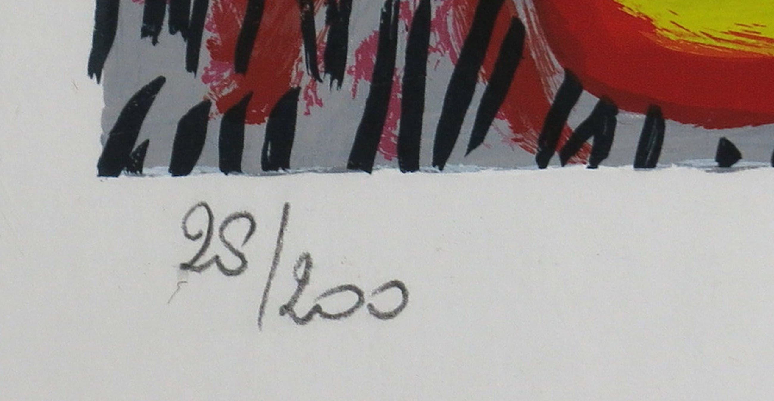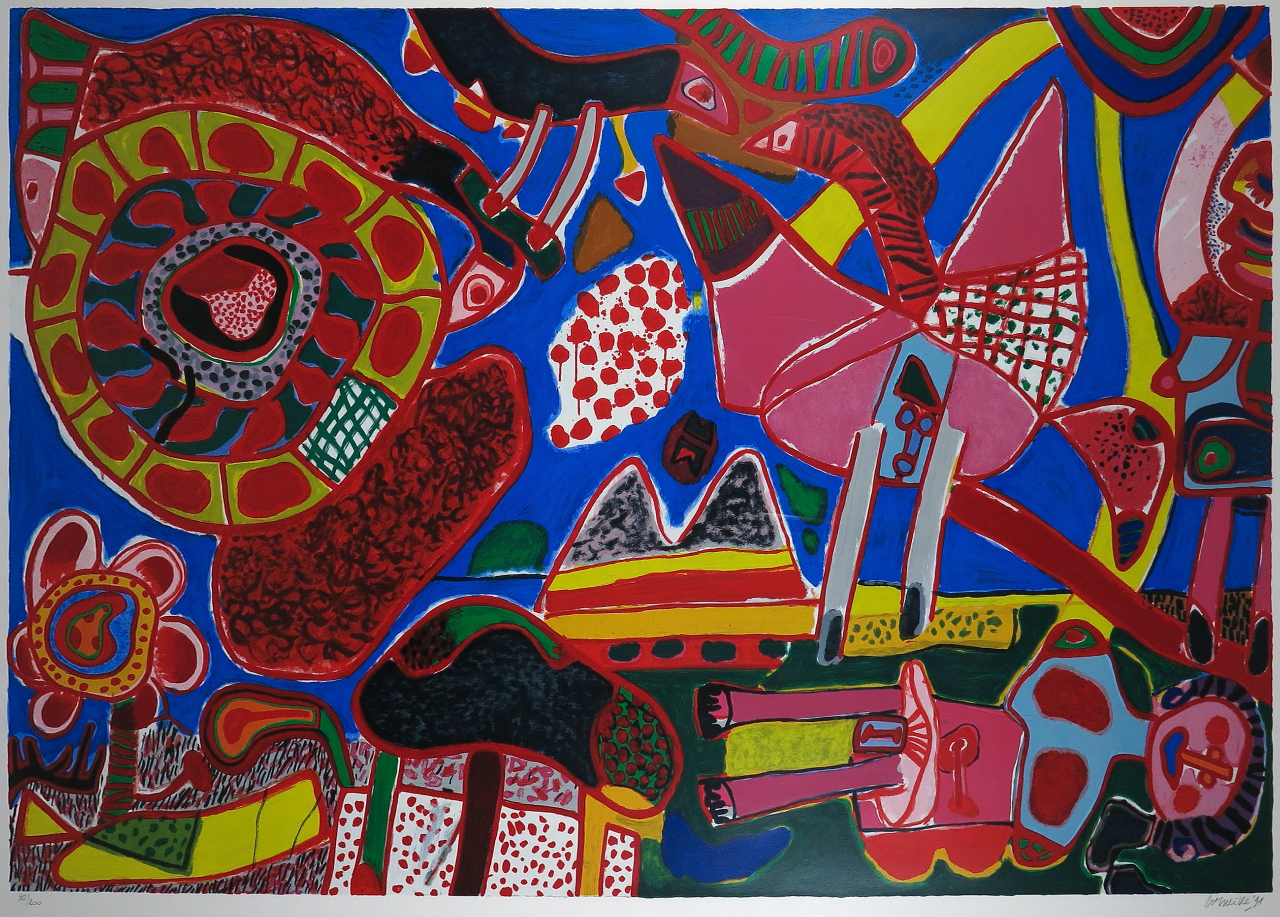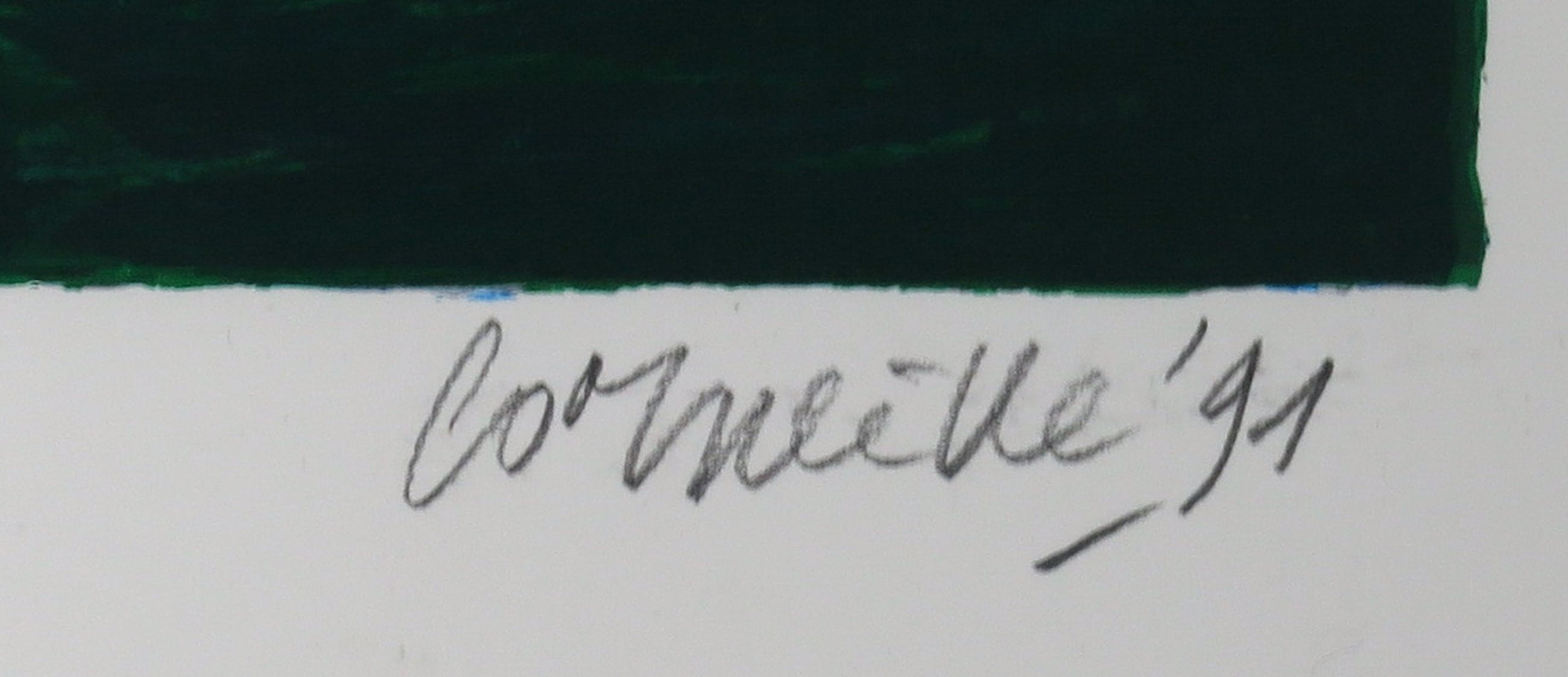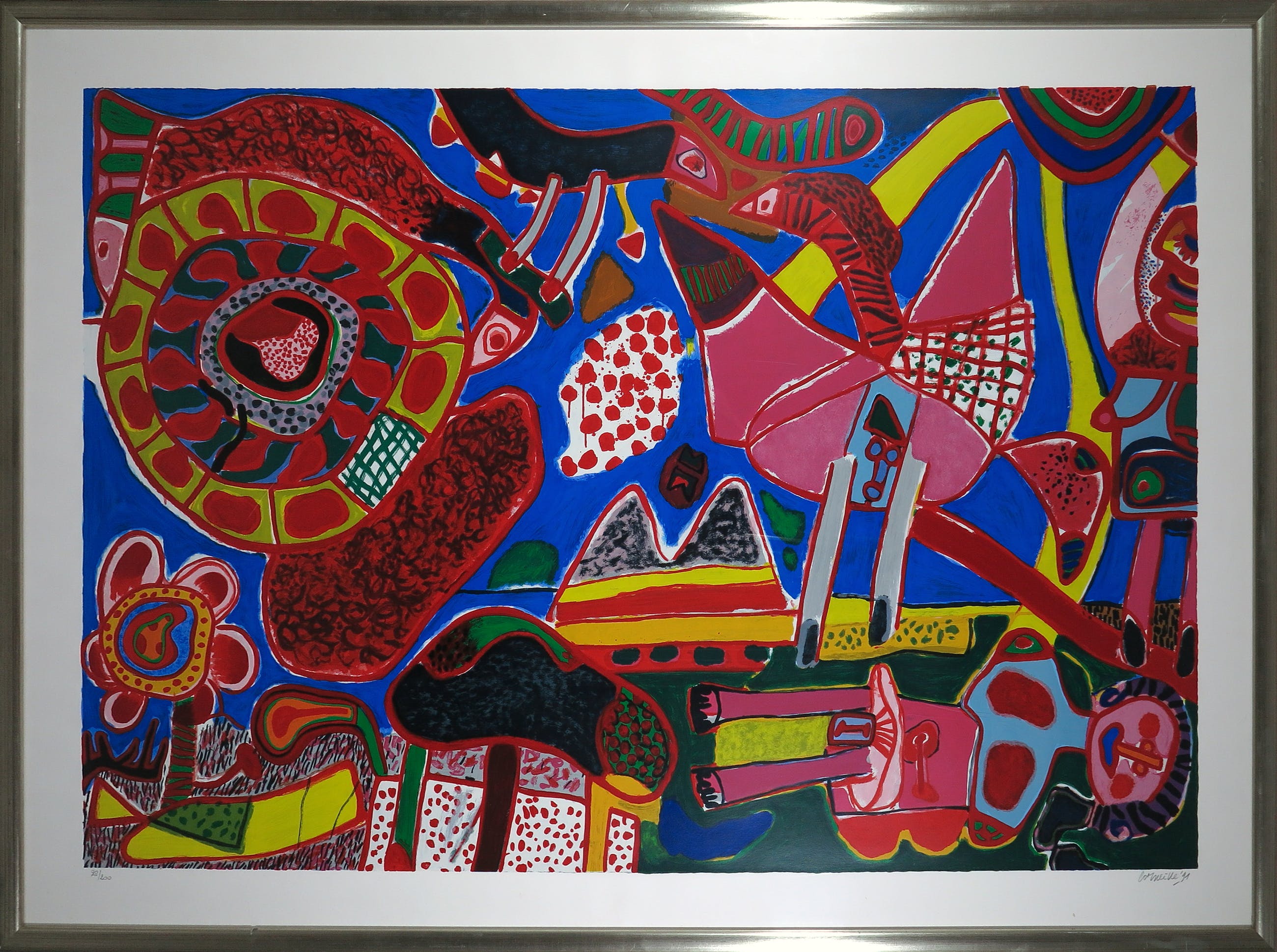 Uitzonderlijk grote en prachtige zeefdruk van Corneille, getiteld Jardin des délices. Rechtsonder in potlood gesigneerd, linksonder in potlood genummerd. Het werk is ingelijst zonder passe-partout.