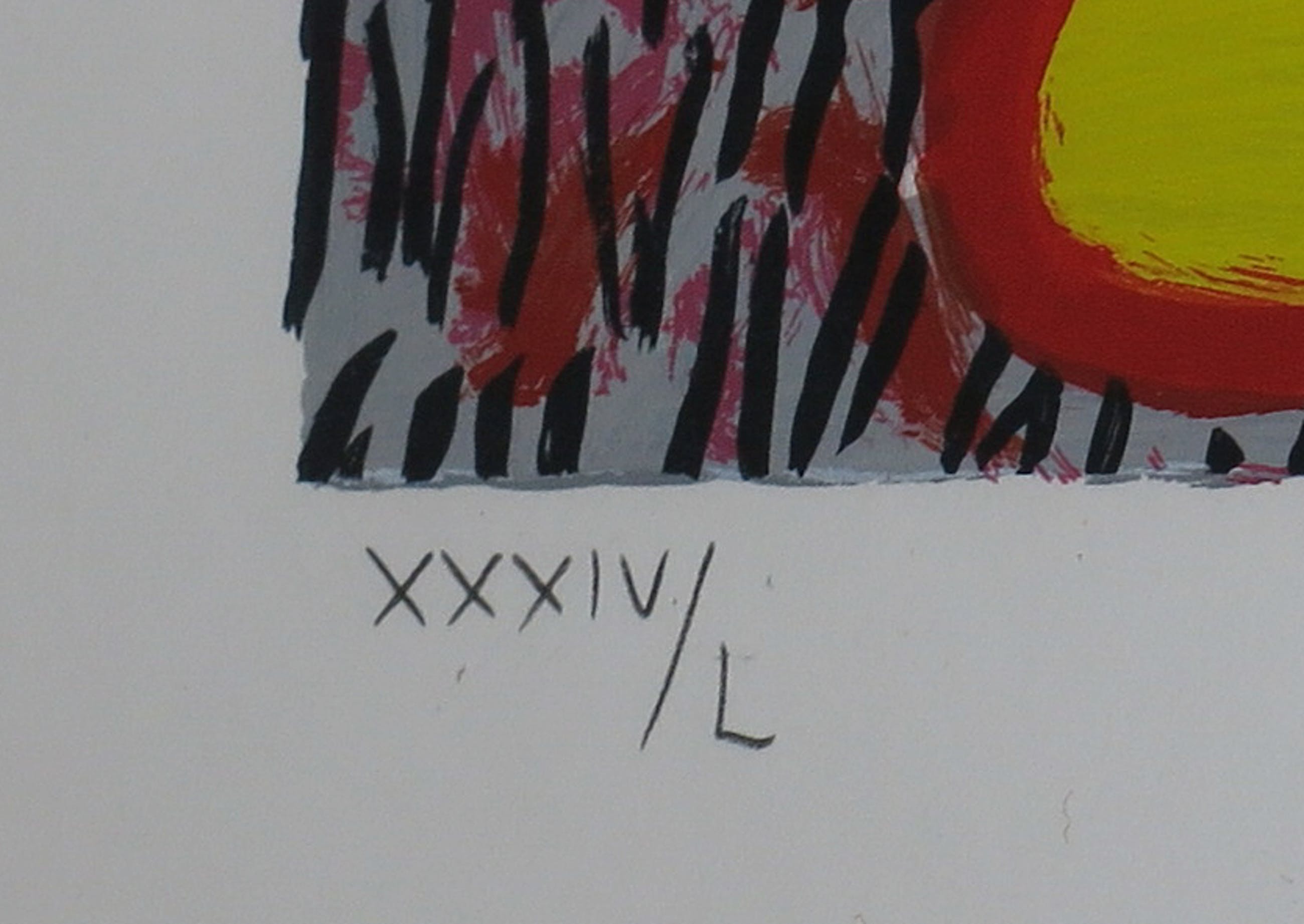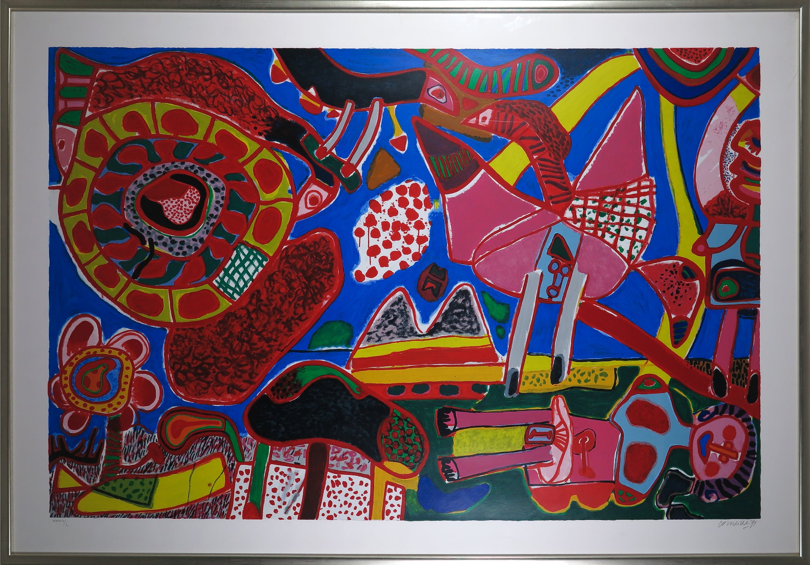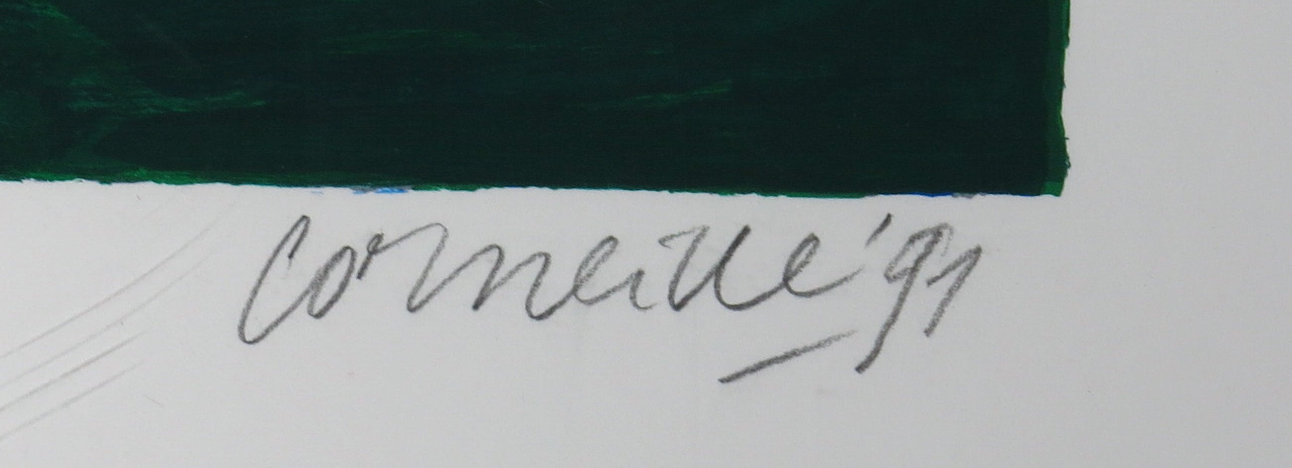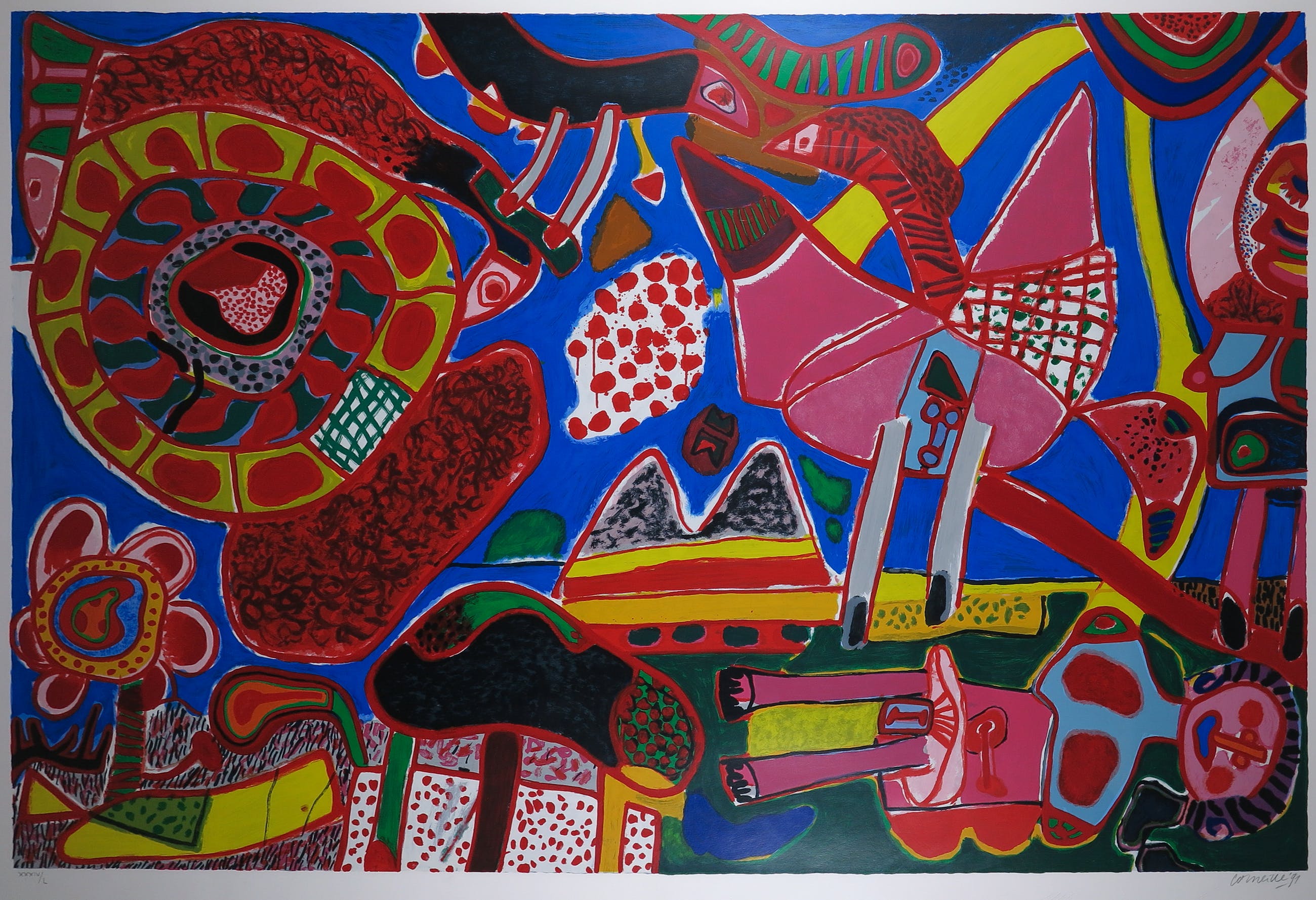 Uitzonderlijk grote en prachtige zeefdruk van Corneille, getiteld Jardin des délices. Rechtsonder in potlood gesigneerd, linksonder in potlood genummerd. Het werk is ingelijst zonder passe-partout.
