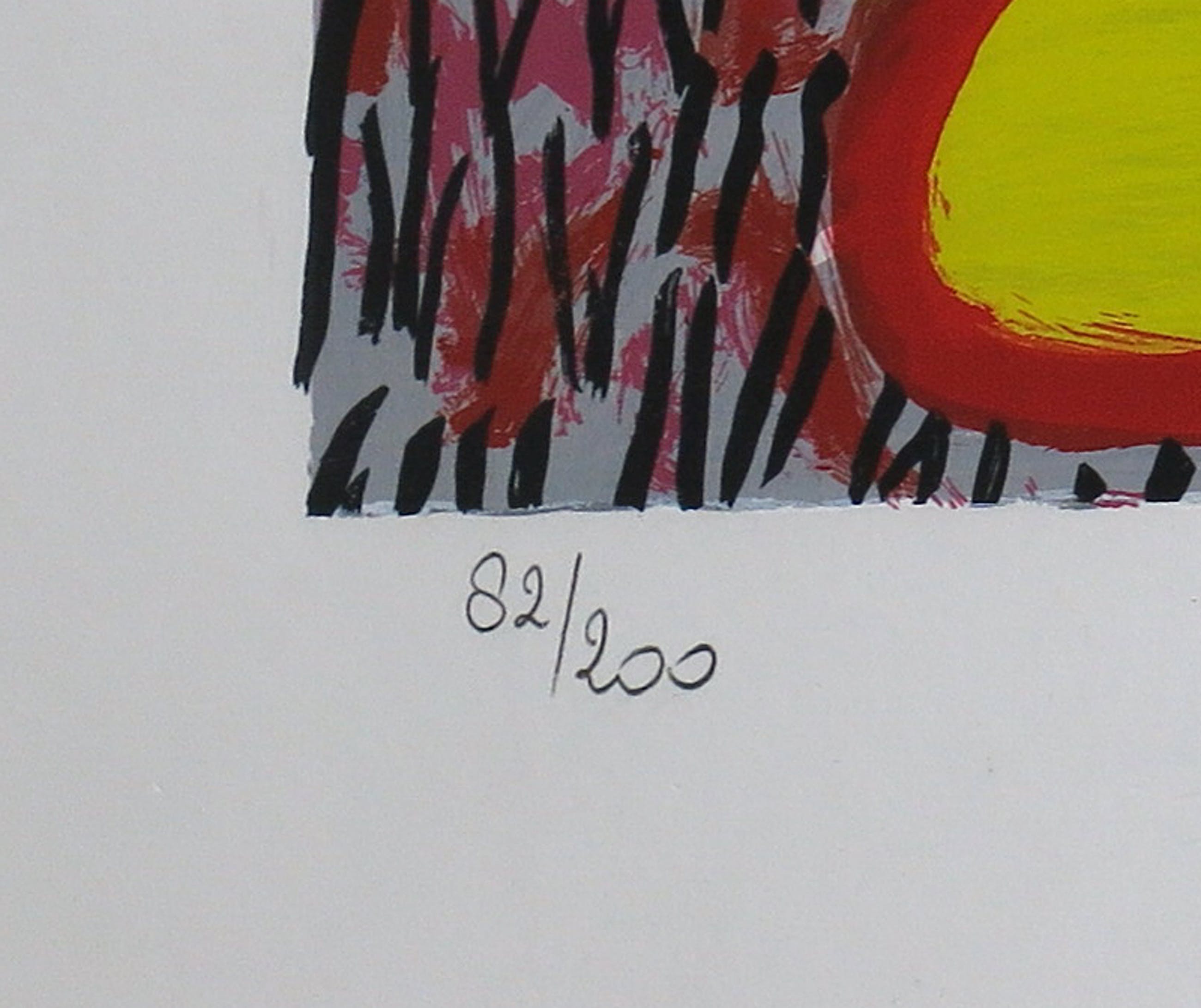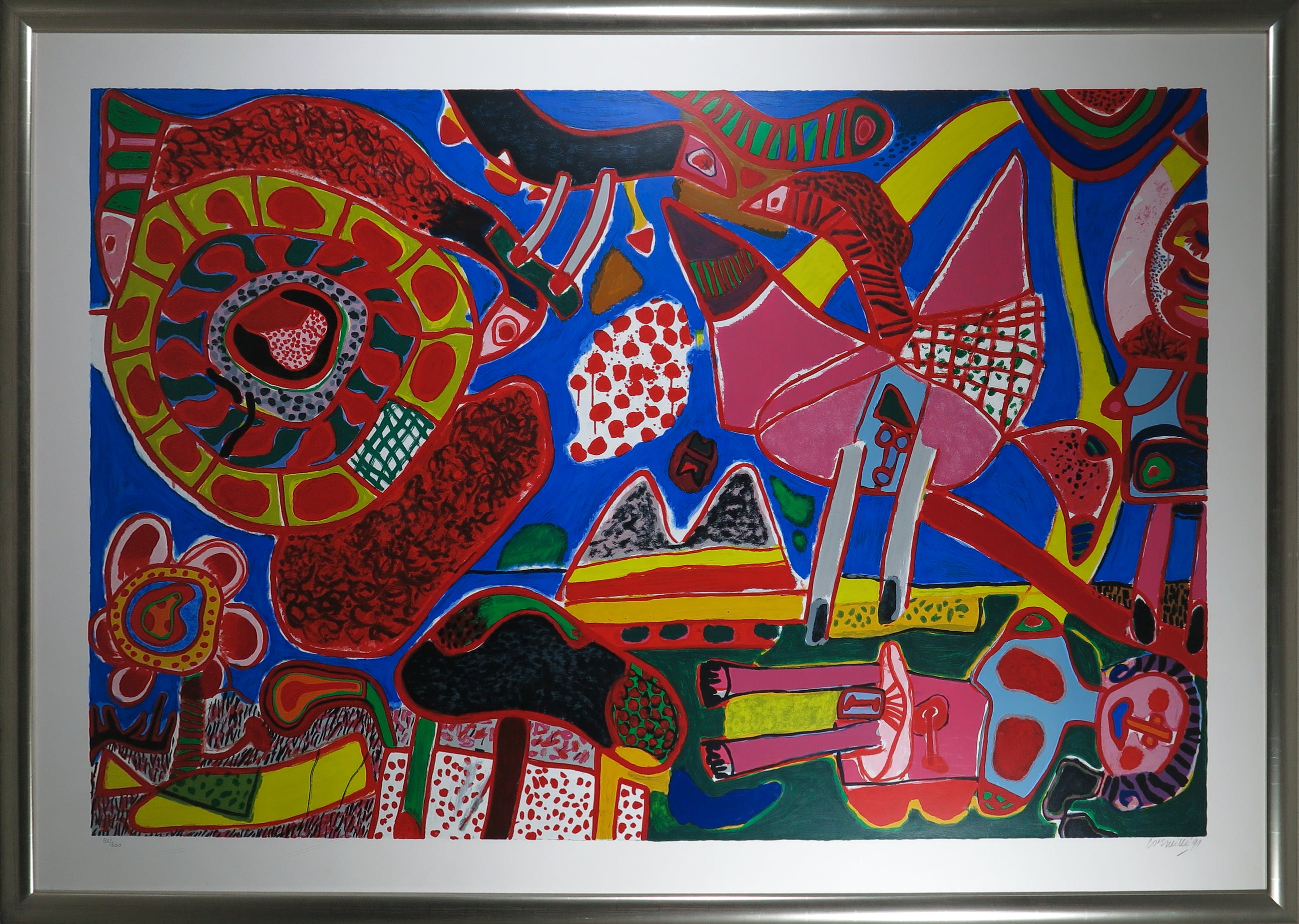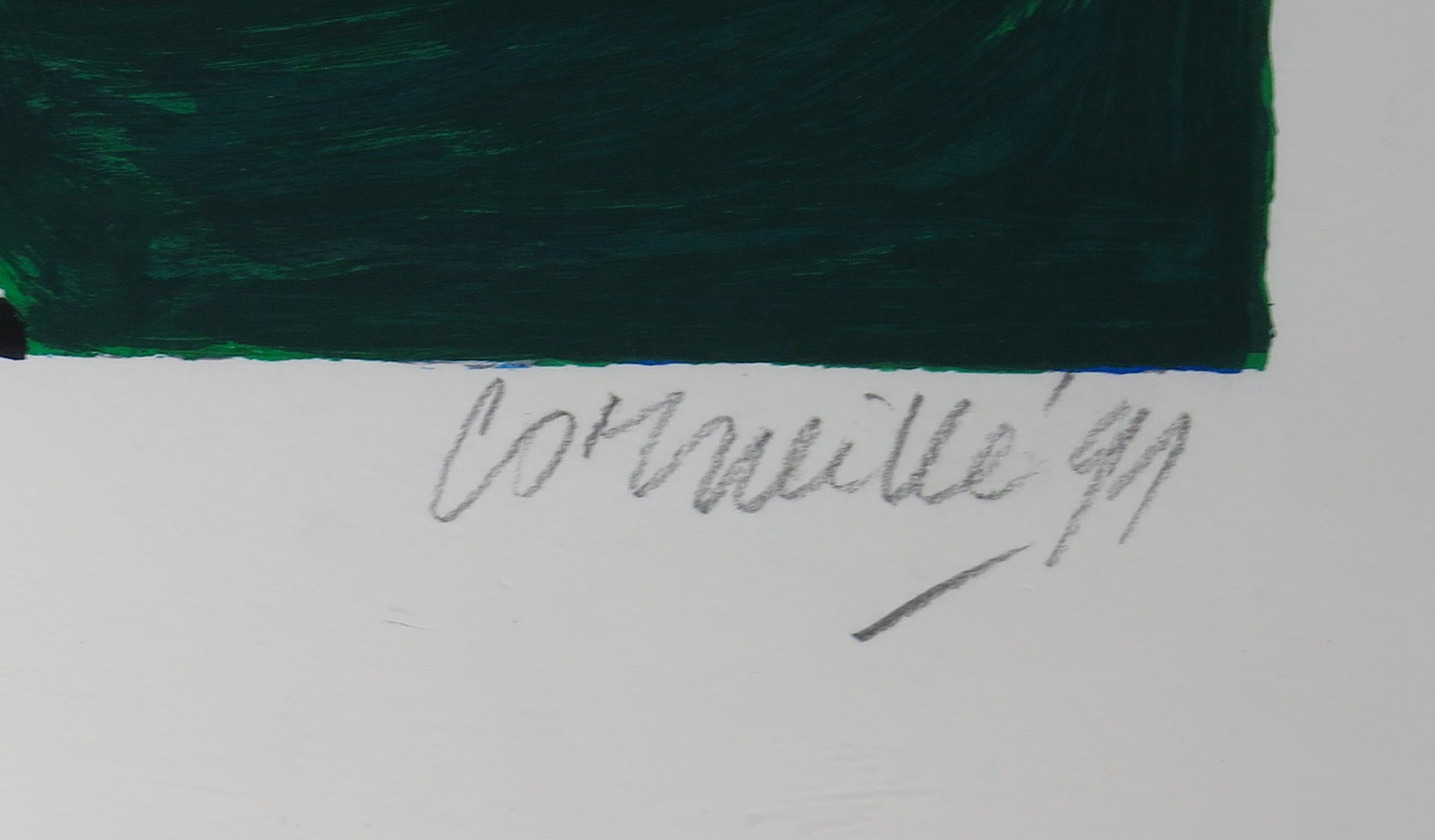 Uitzonderlijk grote en prachtige zeefdruk van Corneille, getiteld Jardin des délices. Rechtsonder in potlood gesigneerd, linksonder in potlood genummerd. Het werk is ingelijst zonder passe-partout.