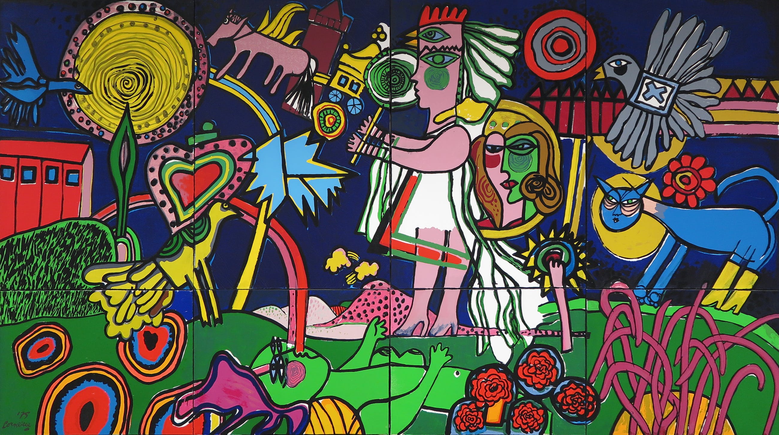De grootste zeefdruk door Corneille ooit gemaakt, op doek en bestaande uit acht losse delen die samen deze fabelachtige voorstelling vormen. Met een breedte van meer dan 280 centimeter is dit de ultieme blikvanger!