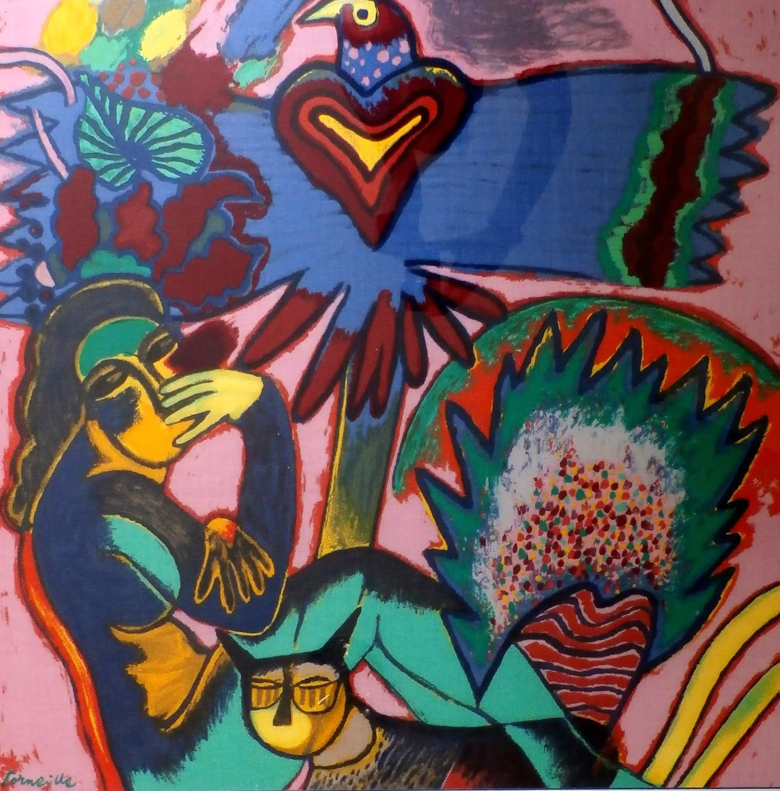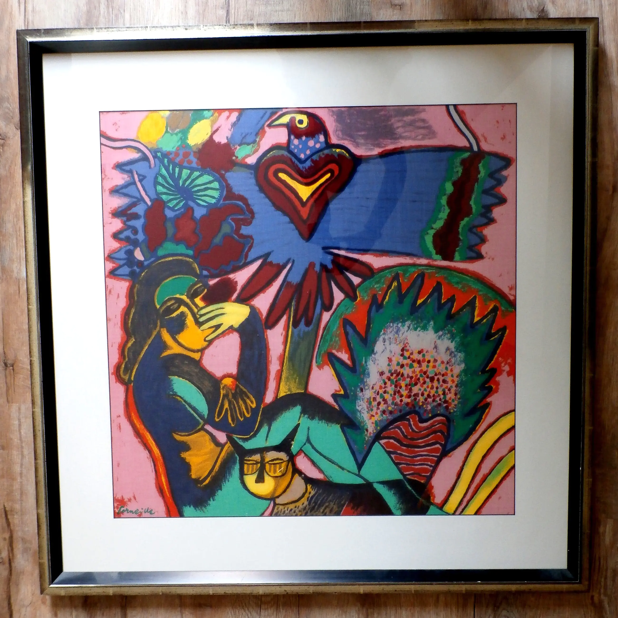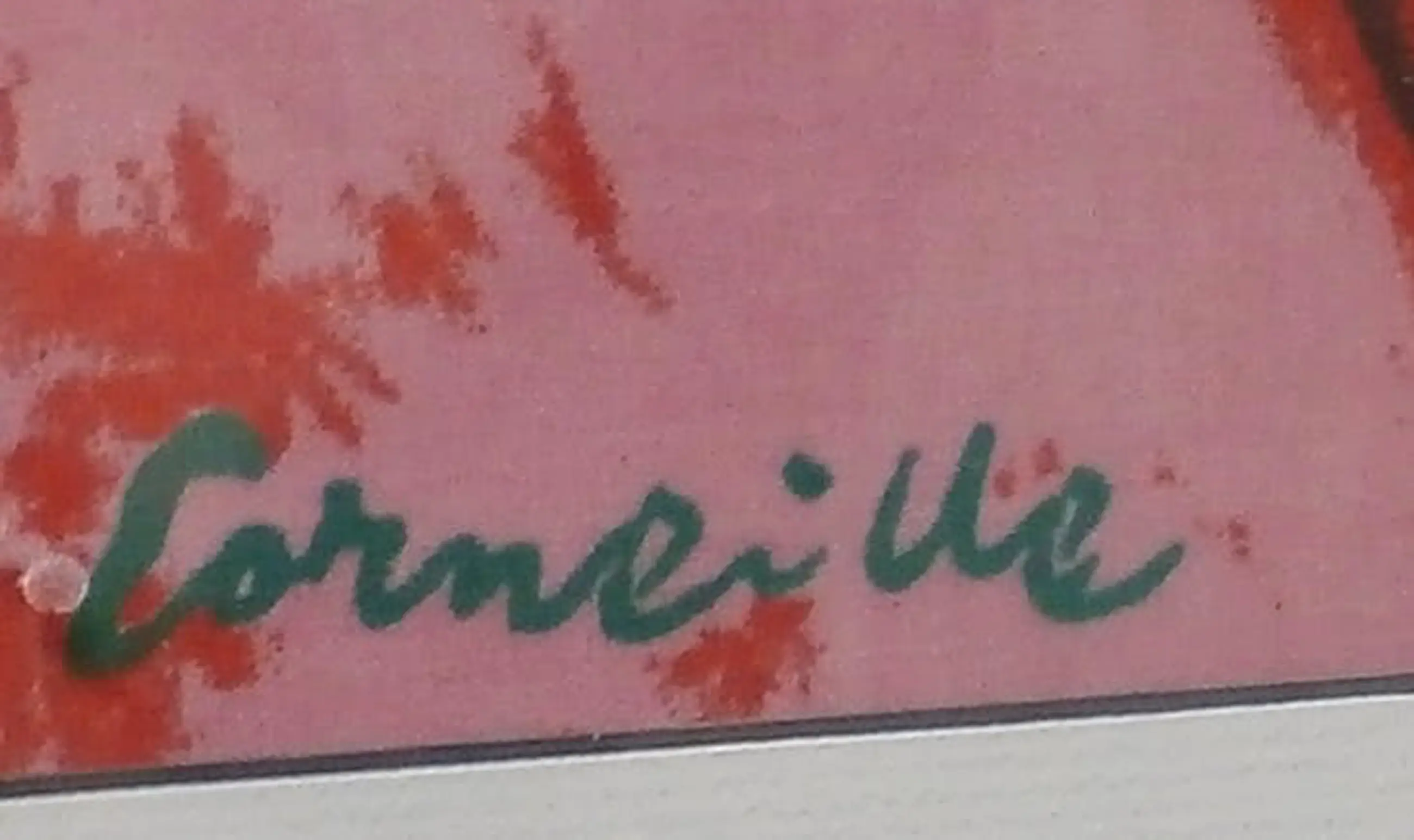Zeefdruk op katoenzijde van Corneille. Texoprint bv vroeg jaarlijks een kunstenaar voor de vervaardiging van een zeefdruk op textiel, welke werd uitgebracht in een gelimiteerde oplage. Afmetingen werk: H95.5 x b95.5 cm. Afmetingen voorstelling: H69 x b69cm. Het werk is rechtsonder gesigneerd. De authenticiteit van dit werk wordt voor 100% gegarandeerd. Een certificaat van echtheid kan, op aanvraag, worden meegeleverd. Conditie: In goede staat.