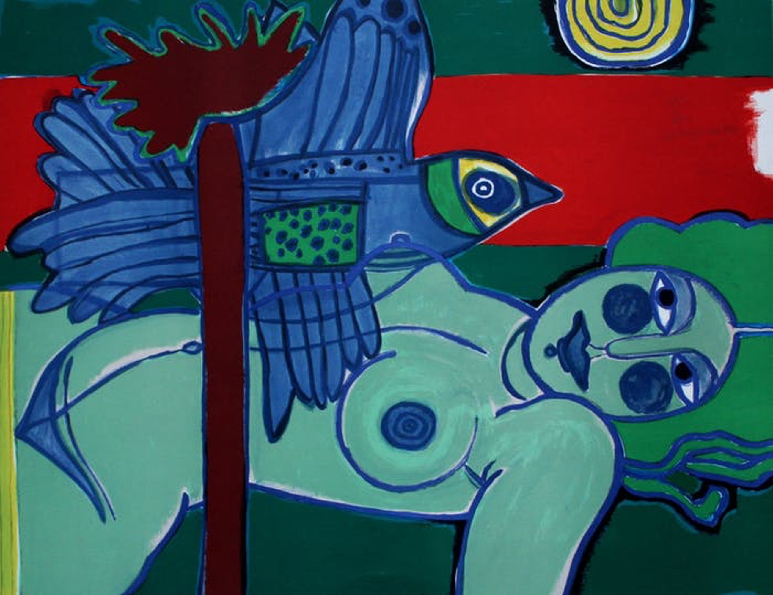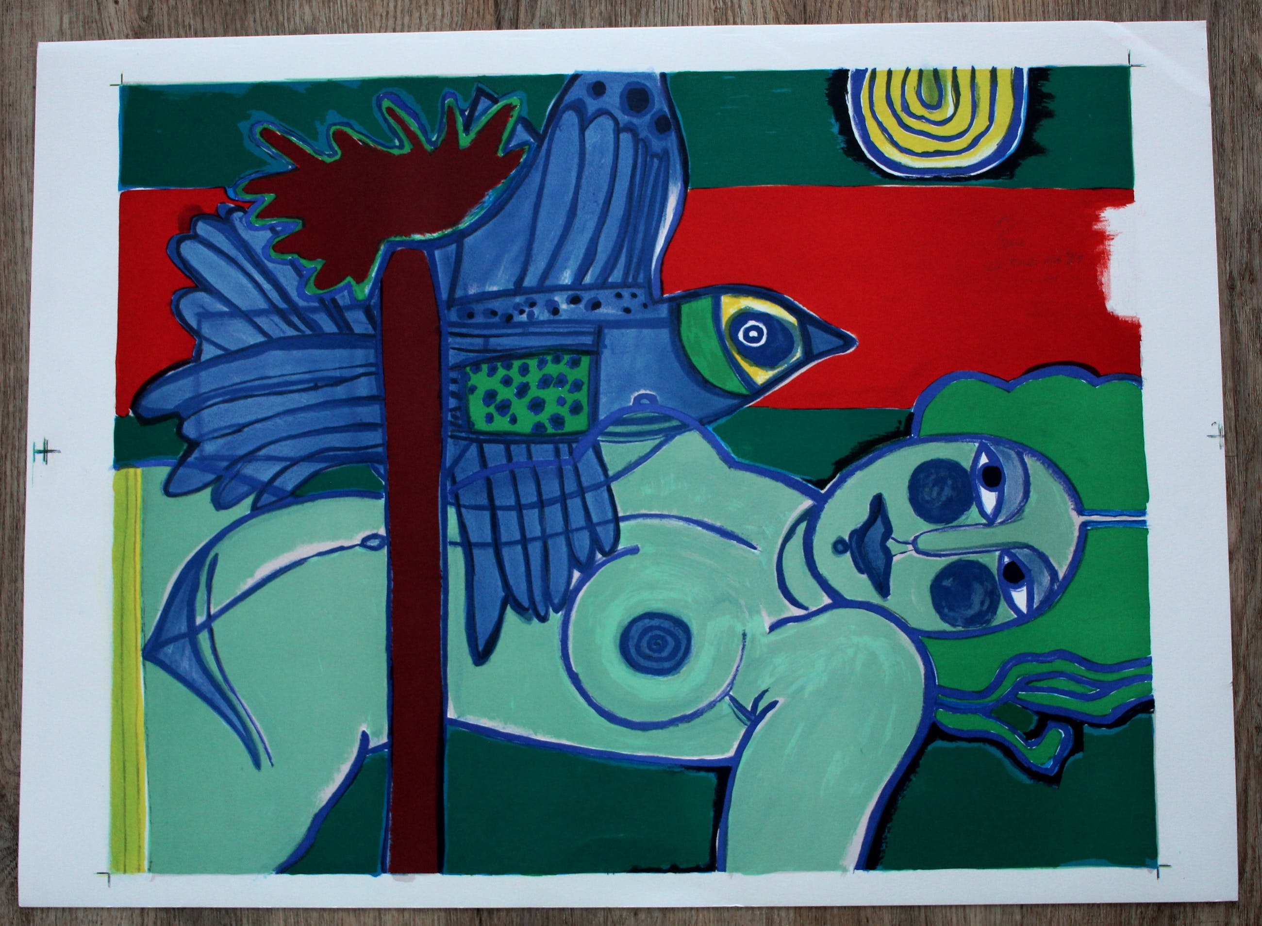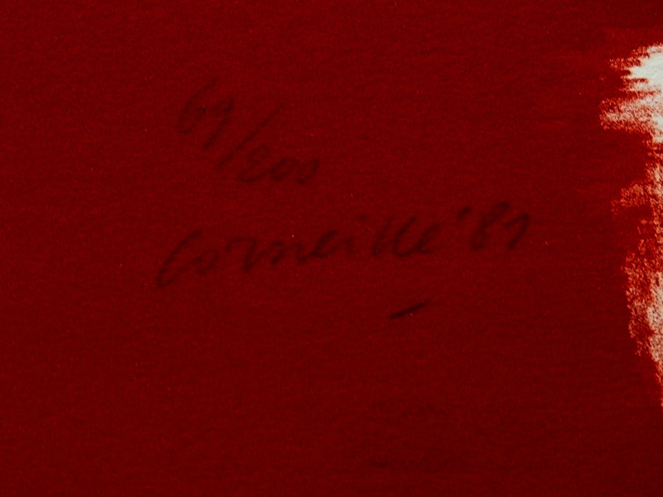 Corneille - zeefdruk: Overture Sur L'ete. Jaar: 1981. Afm. blad: h56 x b76 cm. Afmetingen voorstelling: H50 x b65cm. Nummer: 70/200 (het nummer kan afwijken i.v.m. het in bezit hebben van meerdere exemplaren); het werk is rechtsboven, in het rode vlak, door de kunstenaar, met potlood, gesigneerd. De authenticiteit van dit werk wordt volledig gegarandeerd. Een certificaat van echtheid kan, op aanvraag, worden gemaild.