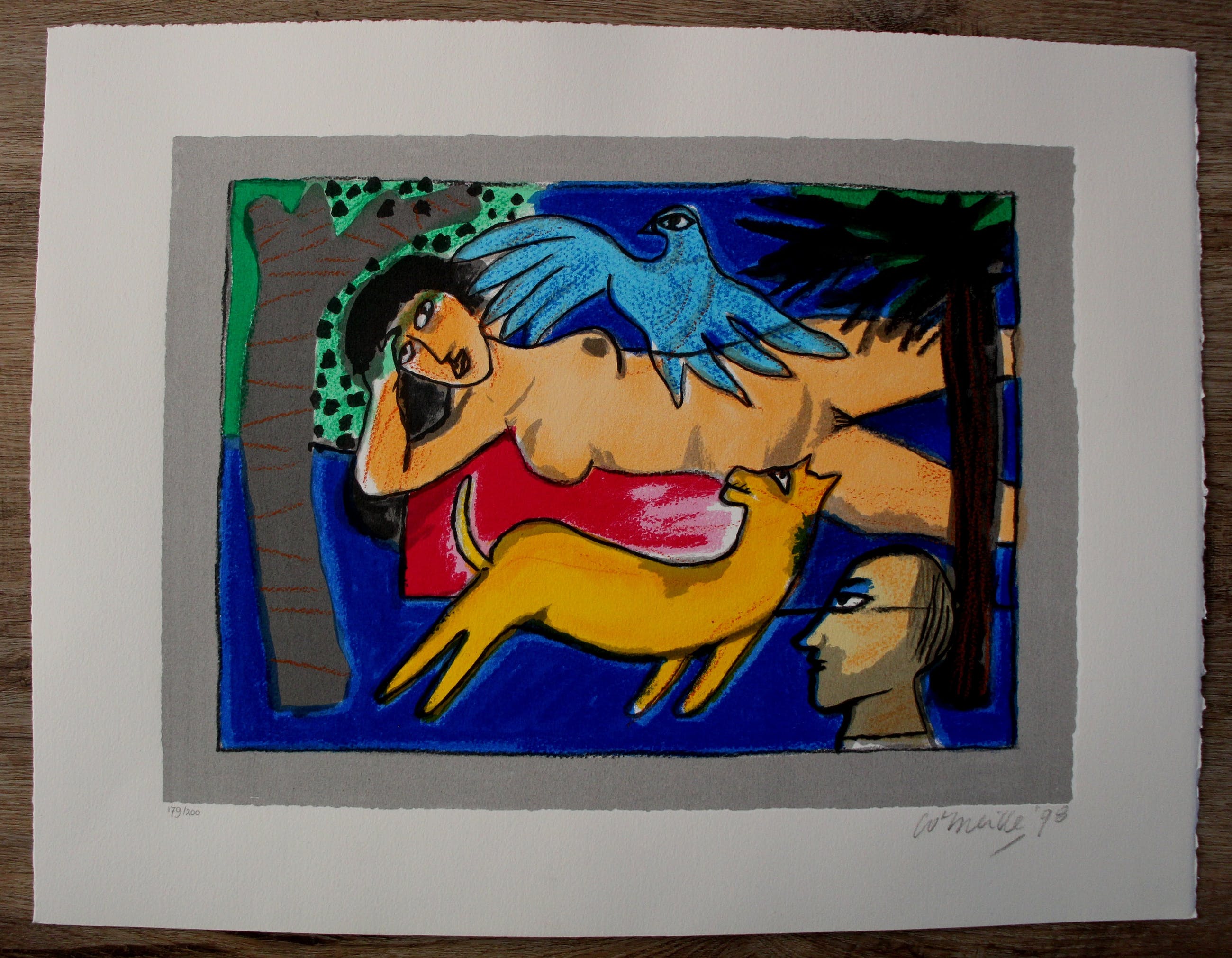 Zeefdruk van Corneille. Titel: Scènes Champêtre. Jaar: 1998. Nummer: 199/200. Afmetingen blad: 46 x 60 cm. Afmetingen voorstelling: H35 x b47cm. Het werk is rechts onderin, met potlood, gesigneerd door de kunstenaar. De authenticiteit van het werk wordt volledig gegarandeerd. Een certificaat van echtheid kan, op aanvraag, worden gemaild.