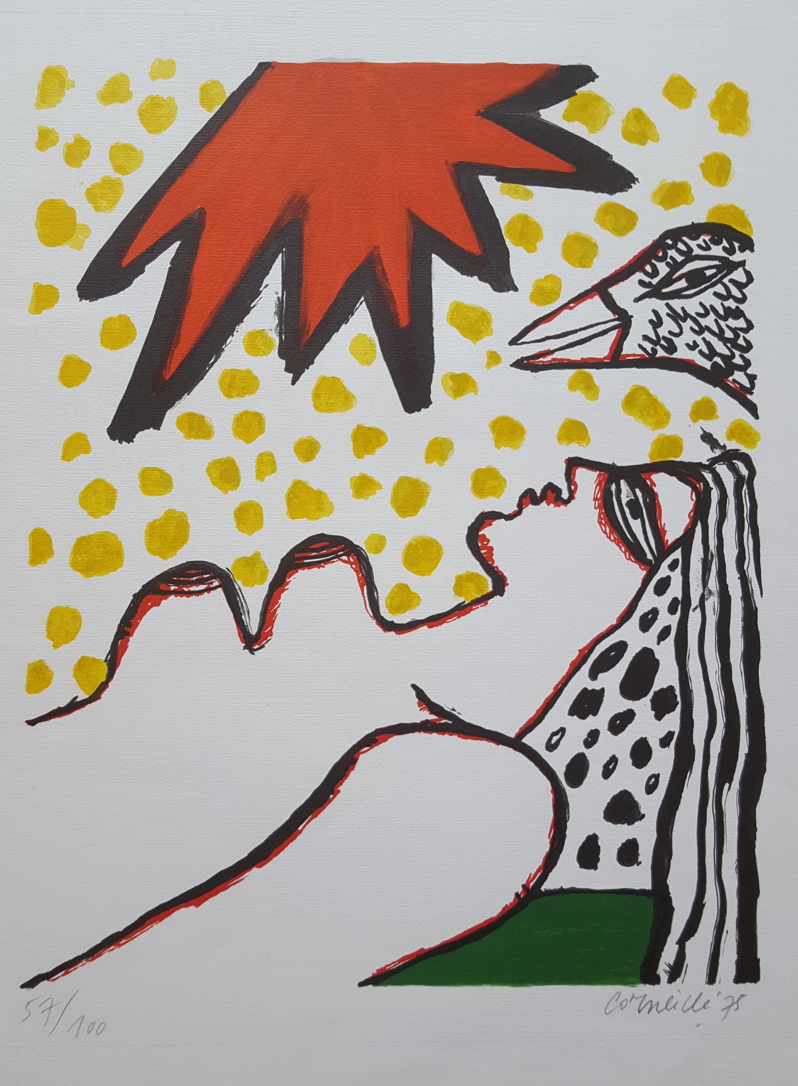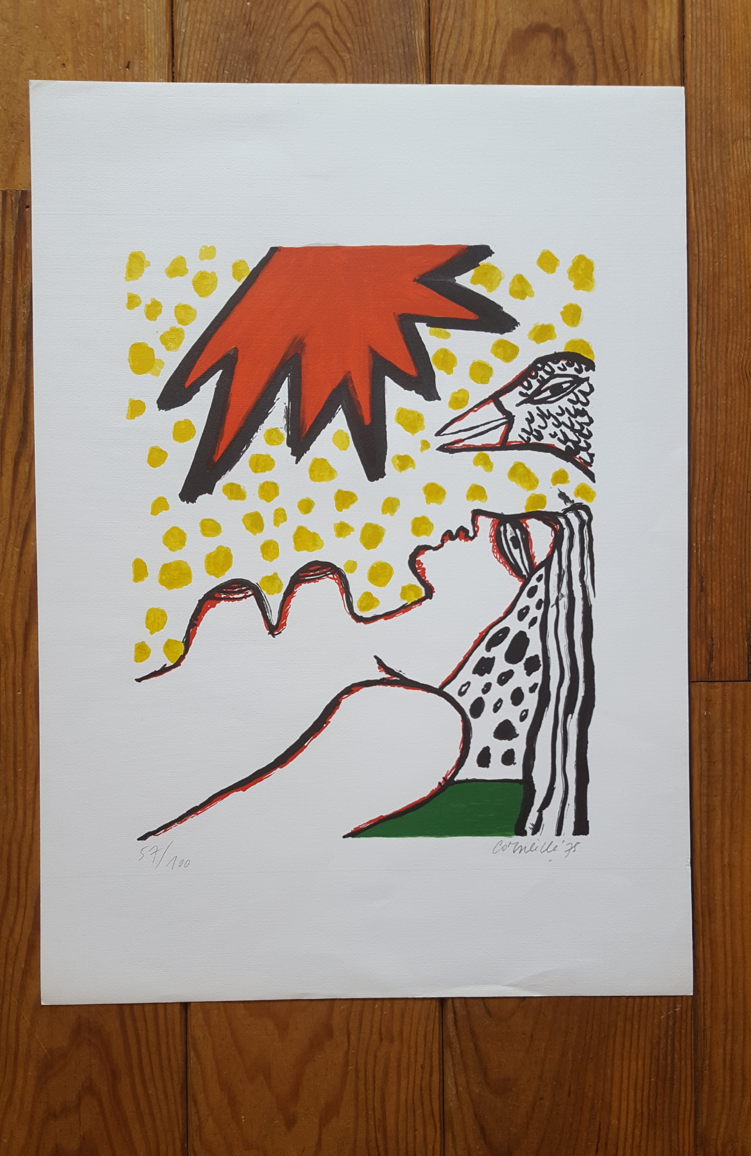 Zeefdruk van Corneille uit 1975.Titel : L'étoile / La Stella. Afmeting: 70 x 50 cm. Oplage 100 exemplaren Nr: 57/100.Handgesigneerd en geannoteerd in potlood. Uitgegeven en gedrukt door La Nuova Foglio, Macerata, Italie. Literatuur: Corneille Het complete grafische werk 1948 -1975 ( Donkersloot). Nr: 387 pagina 285. Werk verkeert in goede conditie. Frisse kleuren.