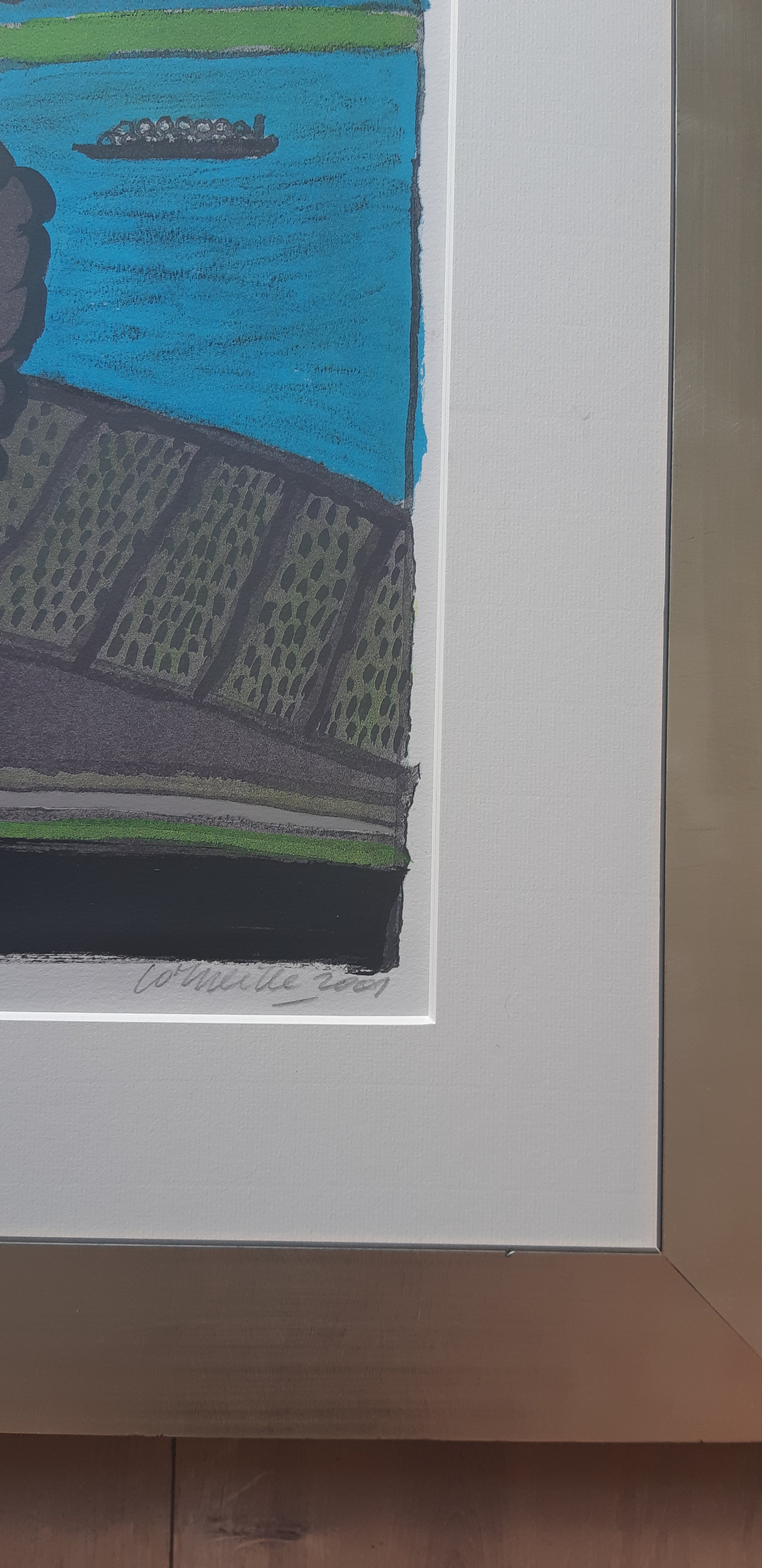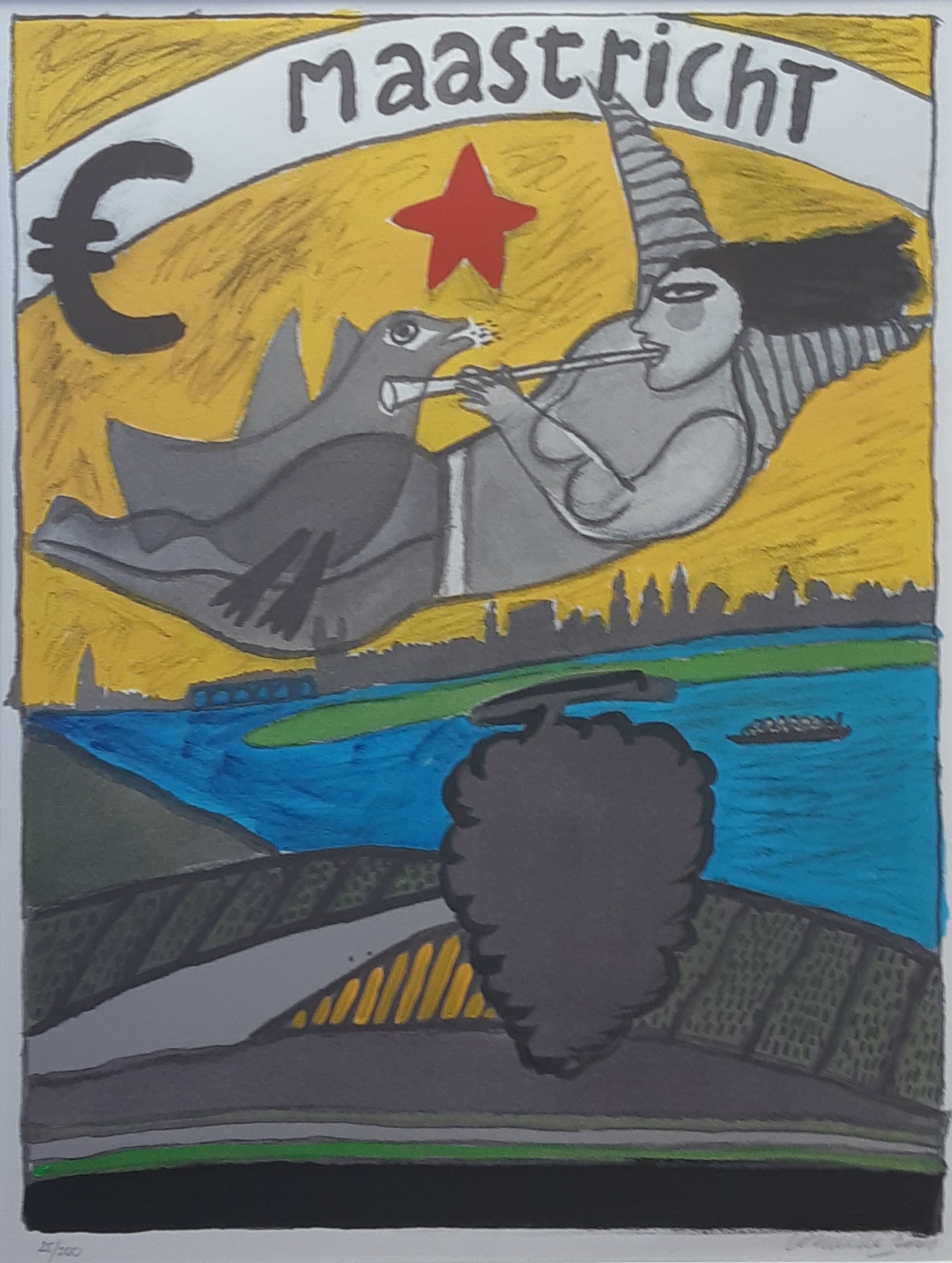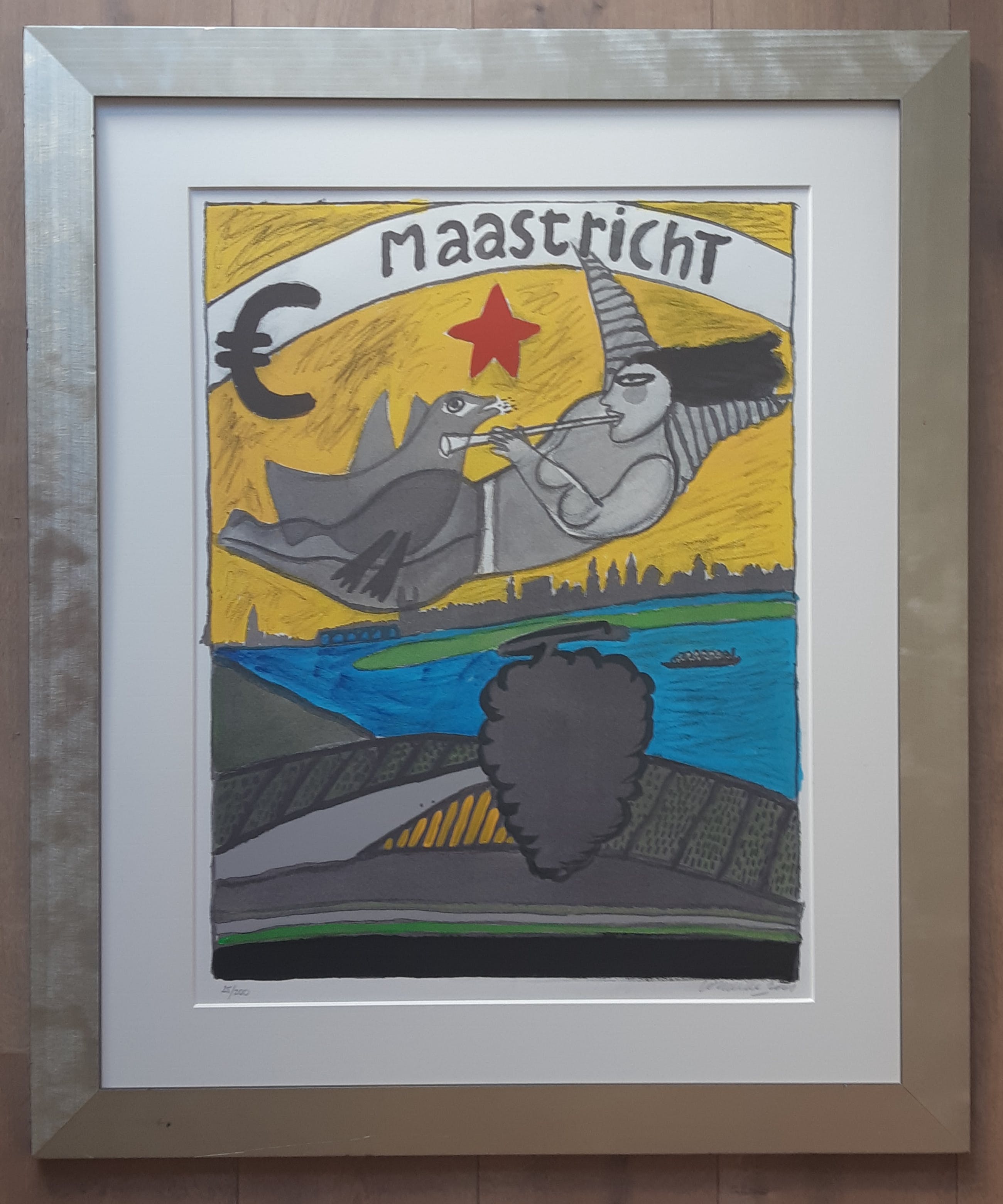 Zeefdruk uitgegeven bij de introductie van de euro in Maastricht. Gesigneerd, gedateerd en genummerd in potlood door de kunstenaar. Dit is nummer 25 uit een serie van 200 exemplaren. Ingelijst in een houten zilverkleurige lijst en voorzien van een Passe-partout. De glasplaat ontbreekt, maar lijkt niet noodzakelijk om het een mooi geheel voor aan de muur te laten zijn.