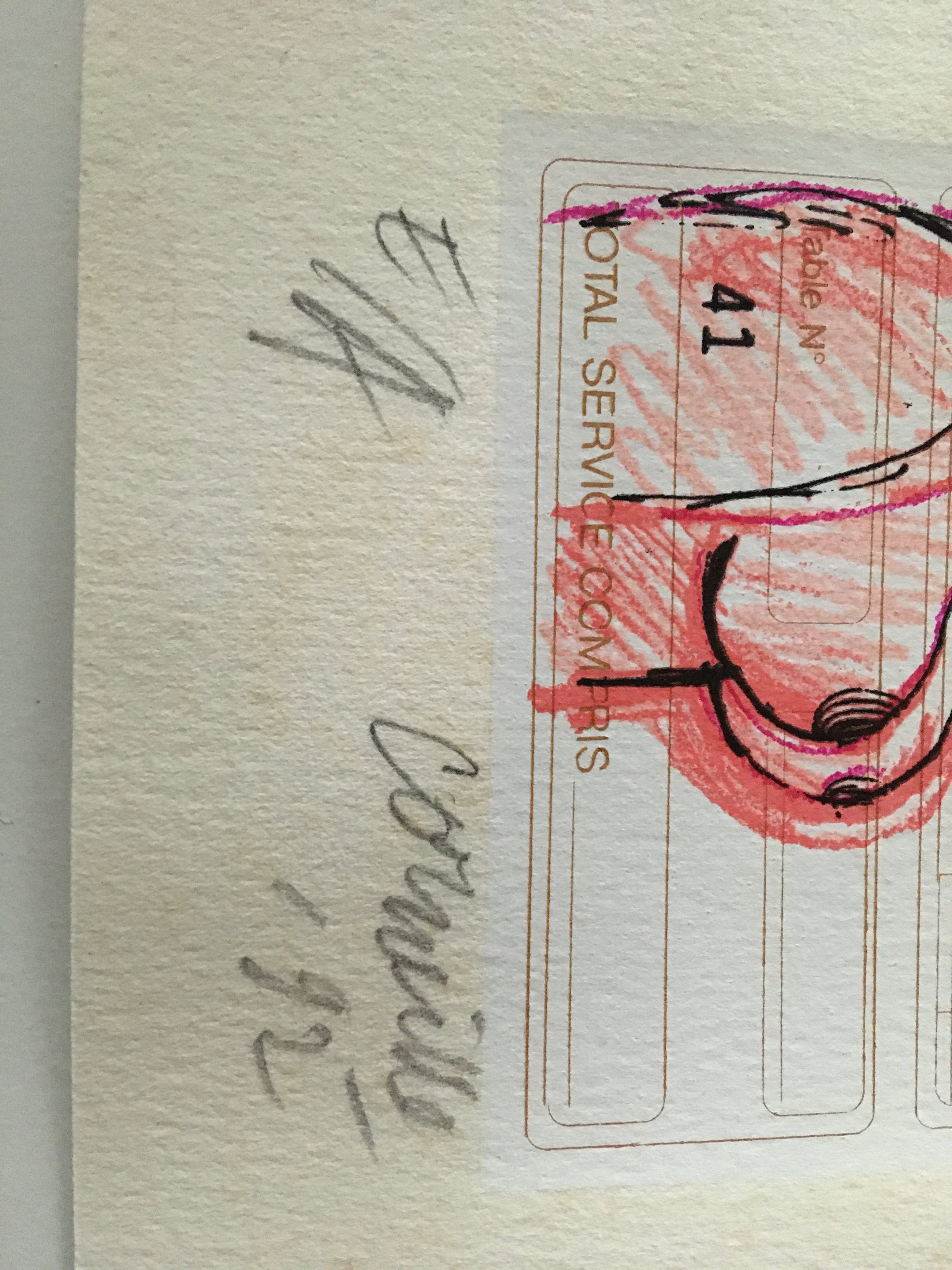 Een heel bijzondere zeefdruk uit 1992 . Corneille maakte het ontwerp hiervoor op een restaurantbon, als dank voor de eigenaar van het etablissement. Het werk is gesigneerd en gedateerd in potlood door de meester. Dit exemplaar is nooit ingelijst geweest en dit werk komt zelden op de markt.