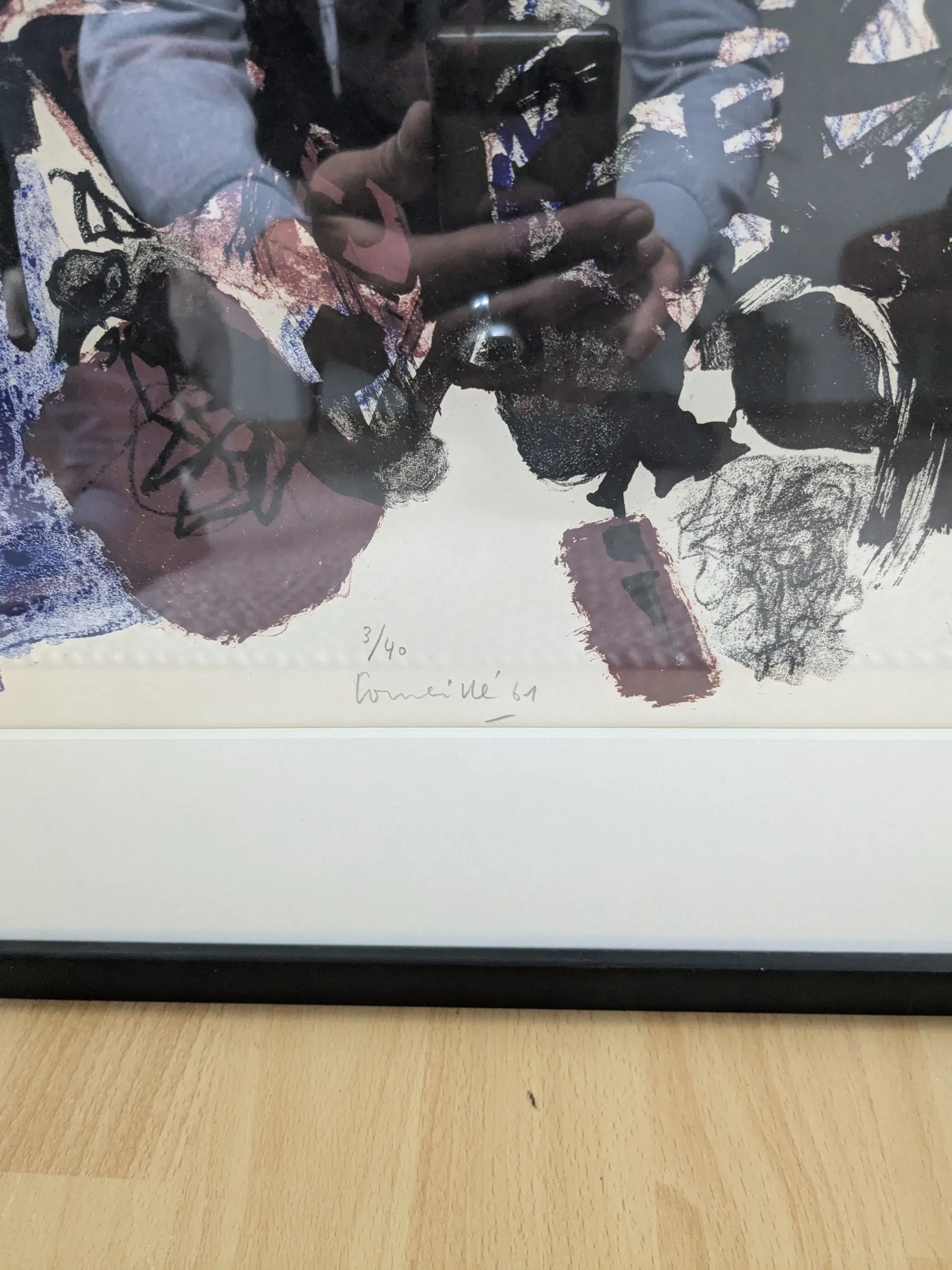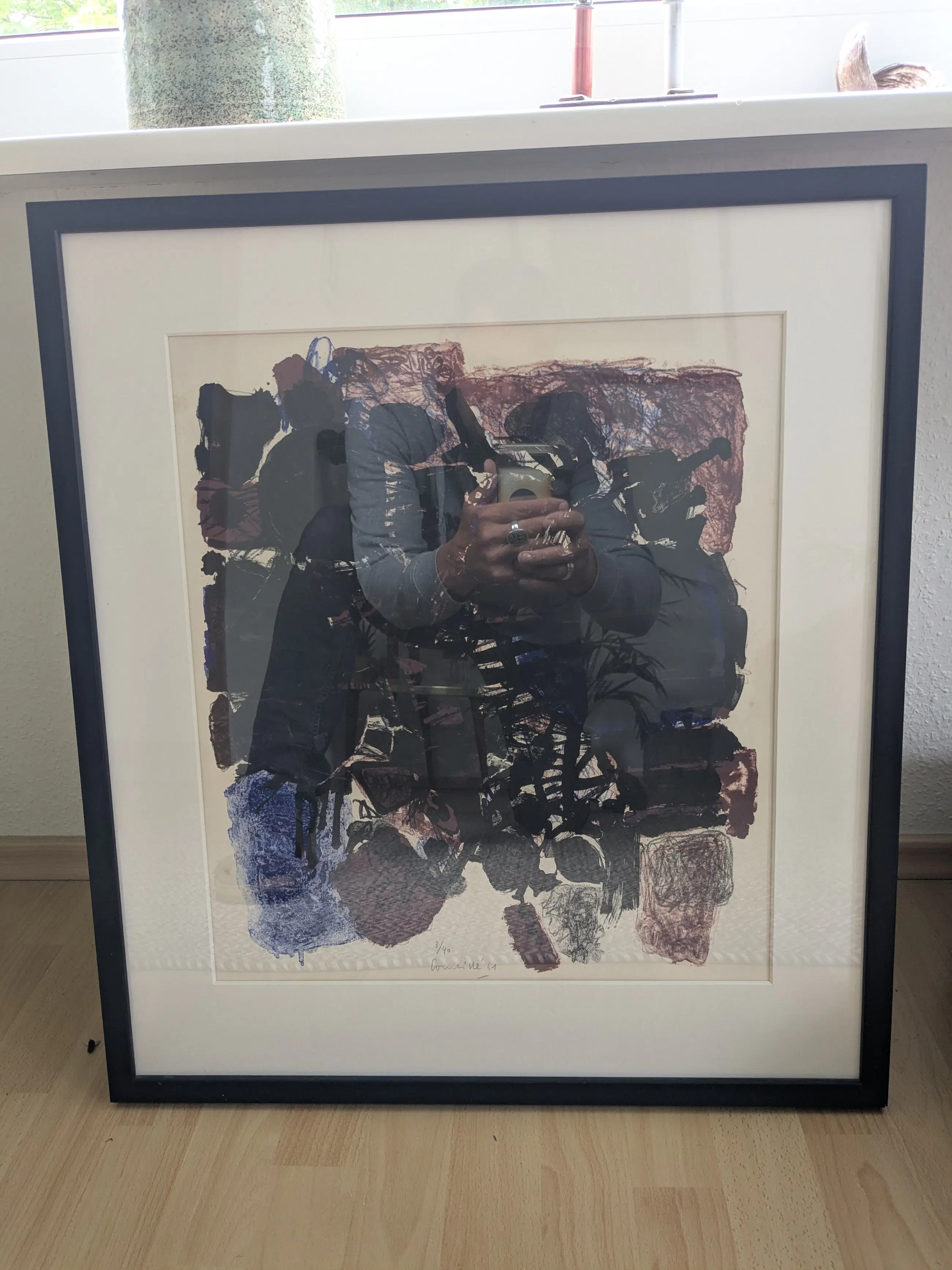 Nummer 3/40 in op maat gemaakte lijst. 2022 bij het grootste Deense veilinghuis geveild voor 335 €. Werd op een ander platform verkocht voor €460. Werd gebruikt voor een tentoonstellingsposter en is gelegen in Australië Qayoma-collectie Om glasschade tijdens de verzending te voorkomen Er werd gebruik gemaakt van plexiglas.