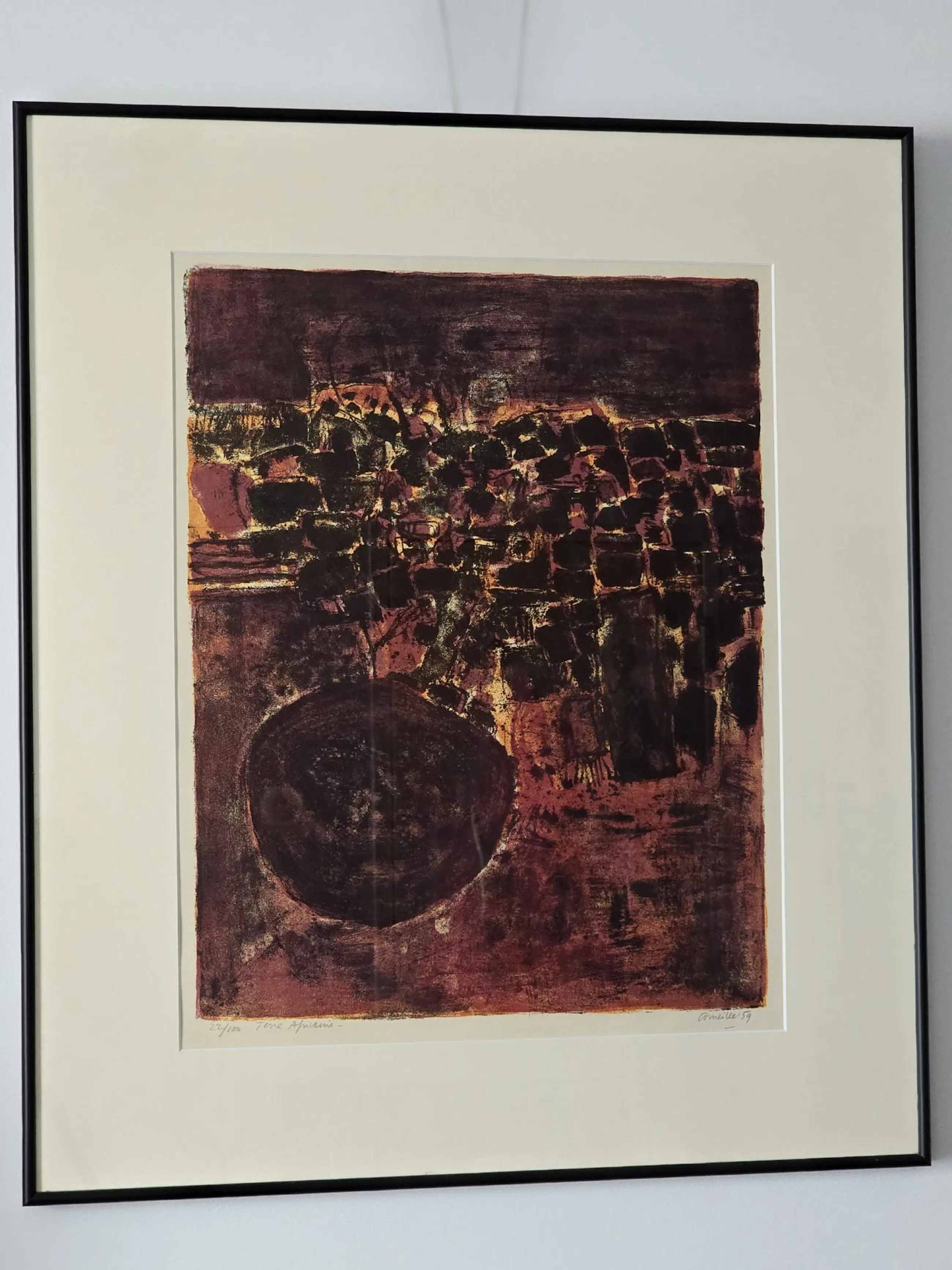 Word geleverd met echtheidscertificaat Origineel en gelimiteerd werk. Mooie lijst en Passe-partout Handgesigneerd, Genummerd en gedateerd door Corneille. Oplage 22/100. Jaartal 1959.