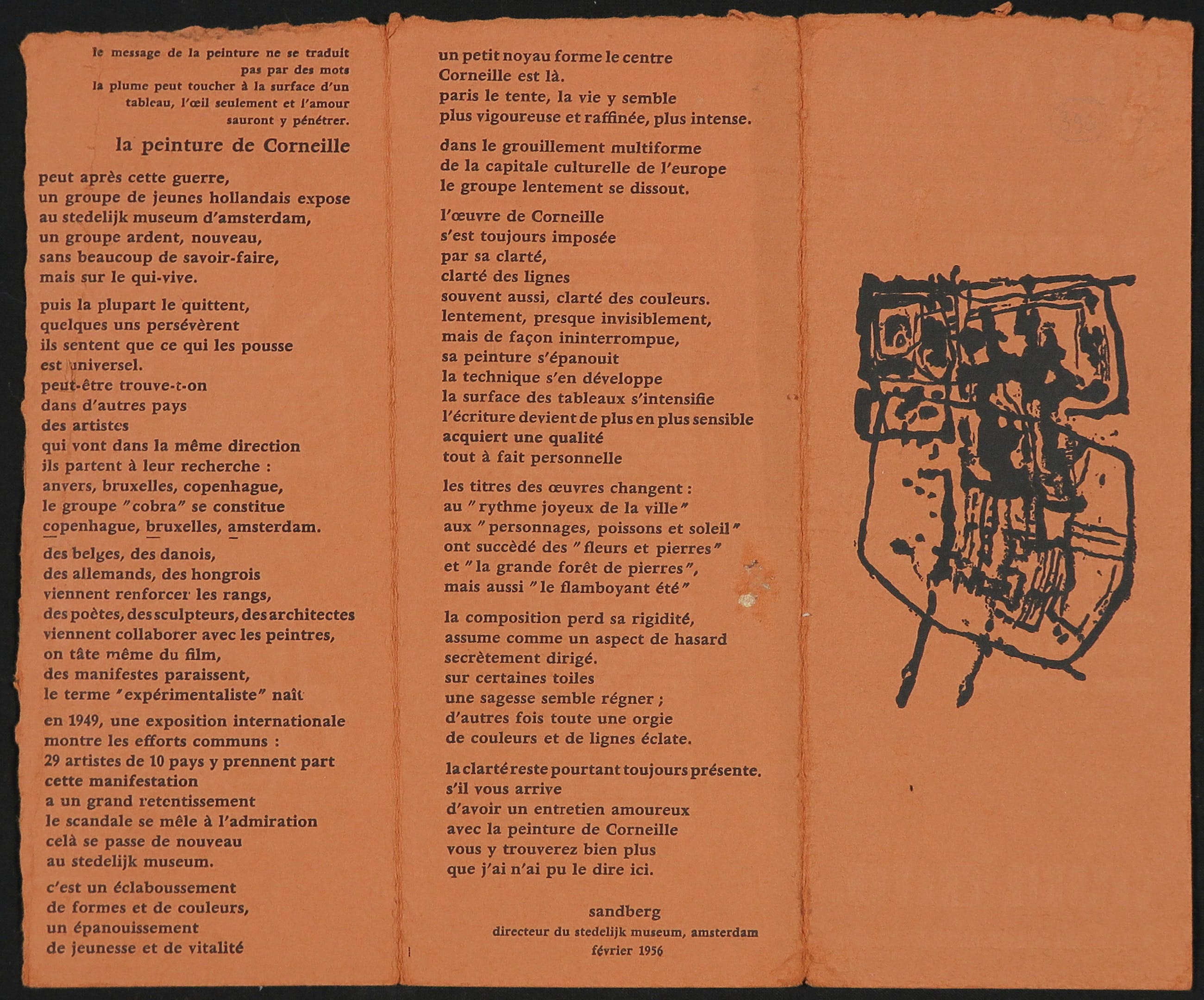 De uitnodiging met een uiteenzetting door Willem Sandberg (directeur van het Stedelijk Museum Amsterdam), bedoeld voor een van de voornaamste solo-exposities van Corneille, was destijds bedoeld voor intimi, en zodoende in lage oplage gedrukt en uitgegeven.