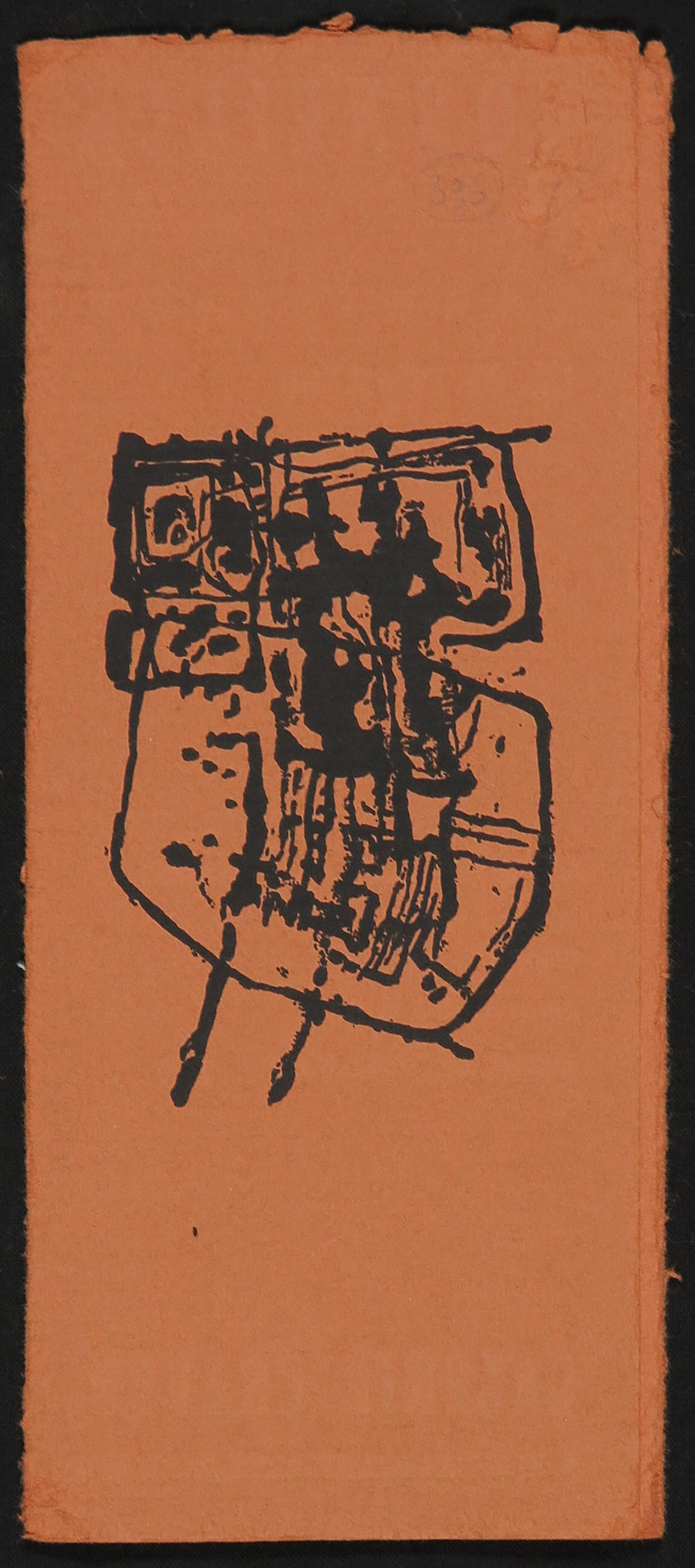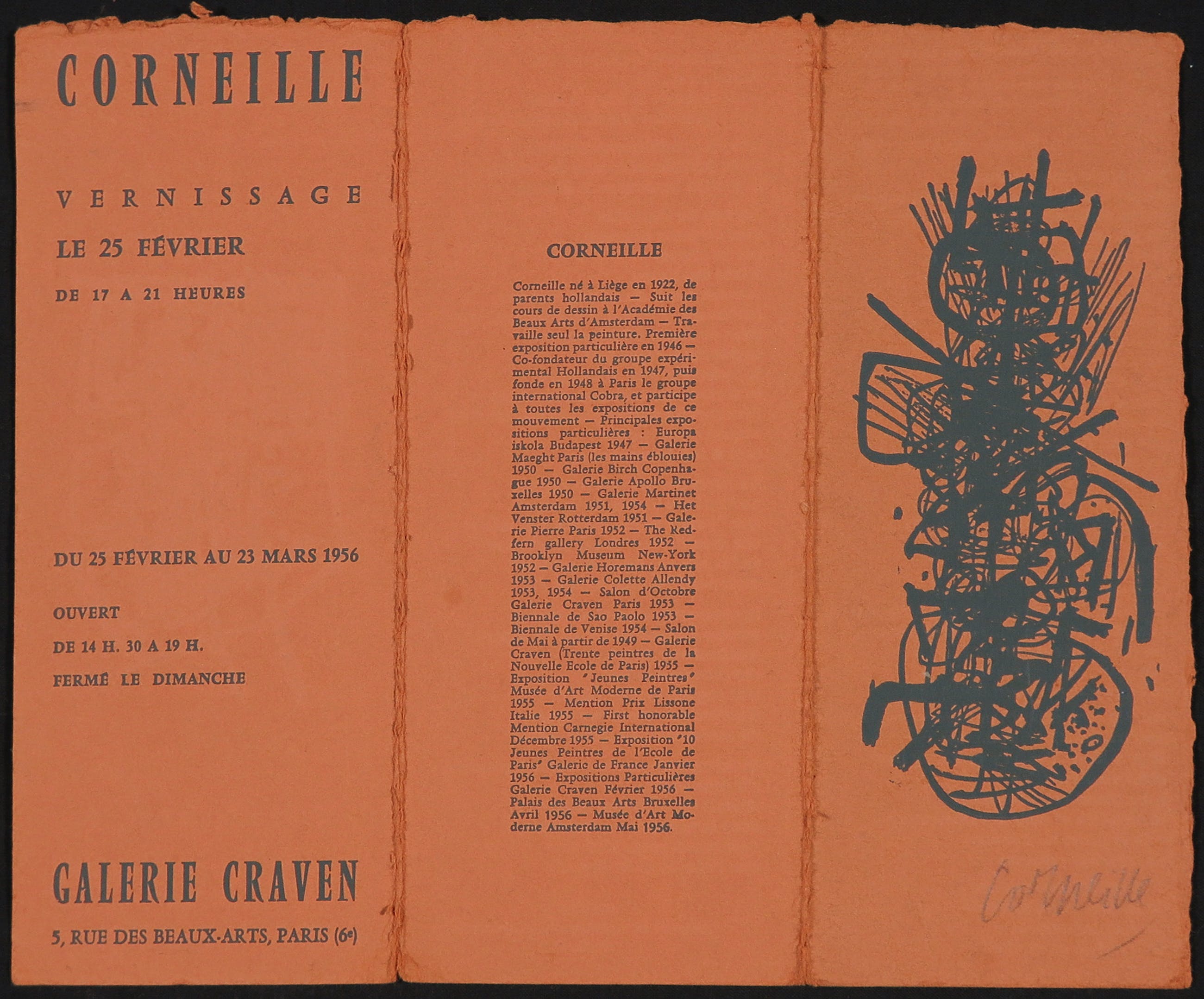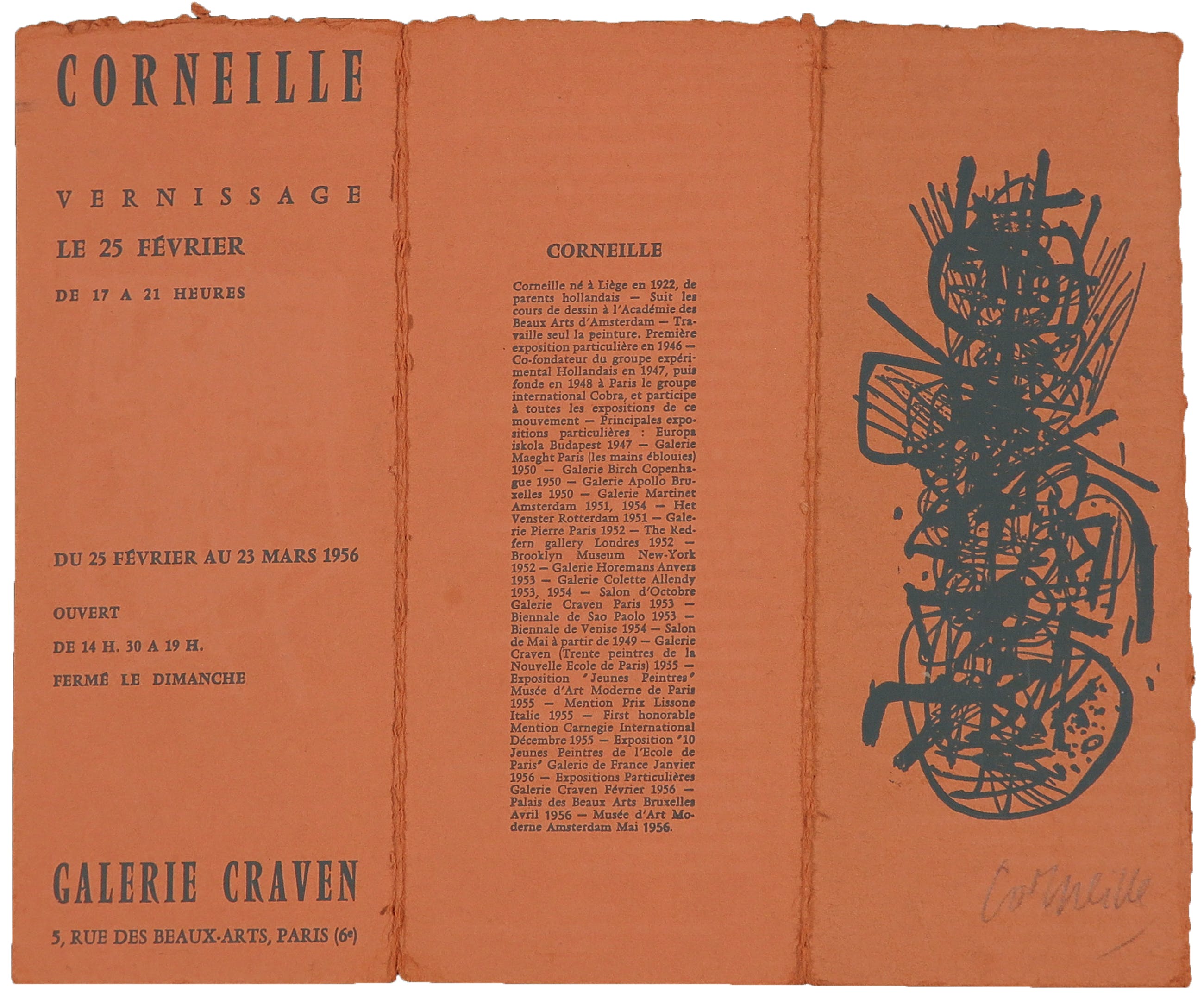 Zeldzame vroege uitnodiging en aankondiging voor een solo-expositie van Corneille in Galerie Craven te Parijs in 1956. Het roodbruine papier is reliëfgedrukt, met twee drukken van tekeningen. Met de hand gesigneerd door Corneille.