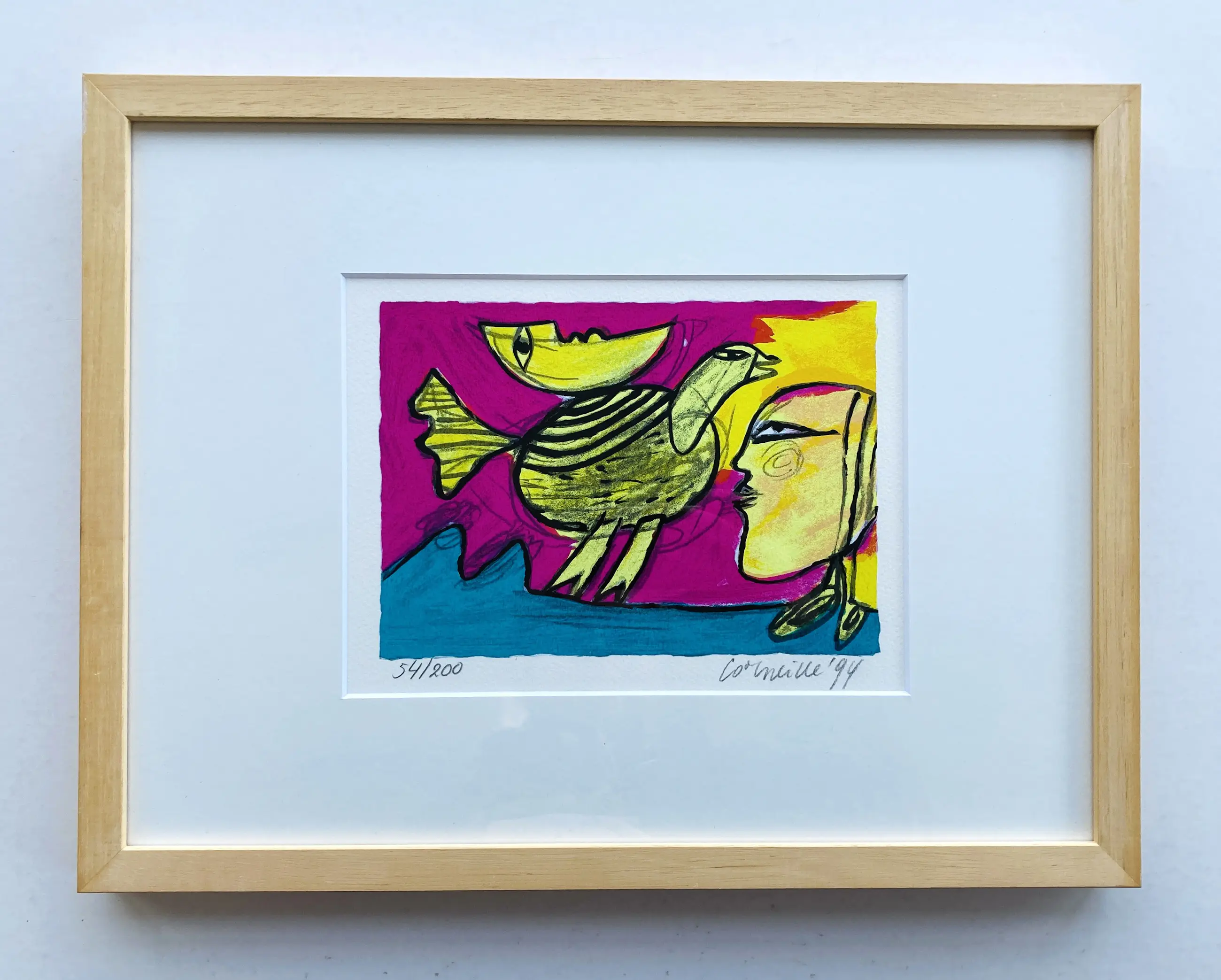Een kleurrijke lithografie van de Nederlandse kunstenaar Corneille (1922 - 2010). Het werk verkeert in uitstekende conditie en is handgesigneerd door de kunstenaar. De druk is ingelijst in een licht houten lijst en kan zo aan de wand worden gehangen.