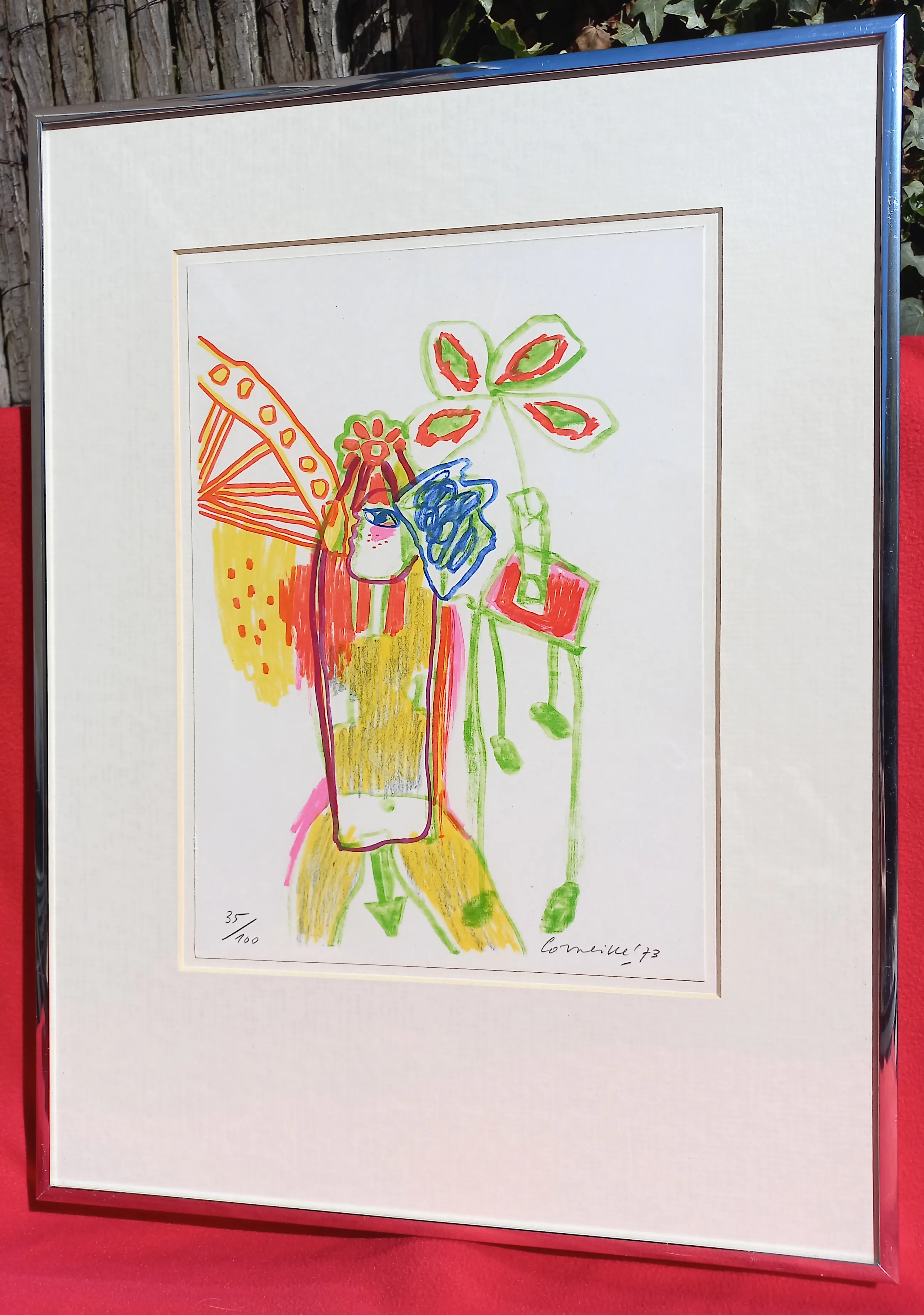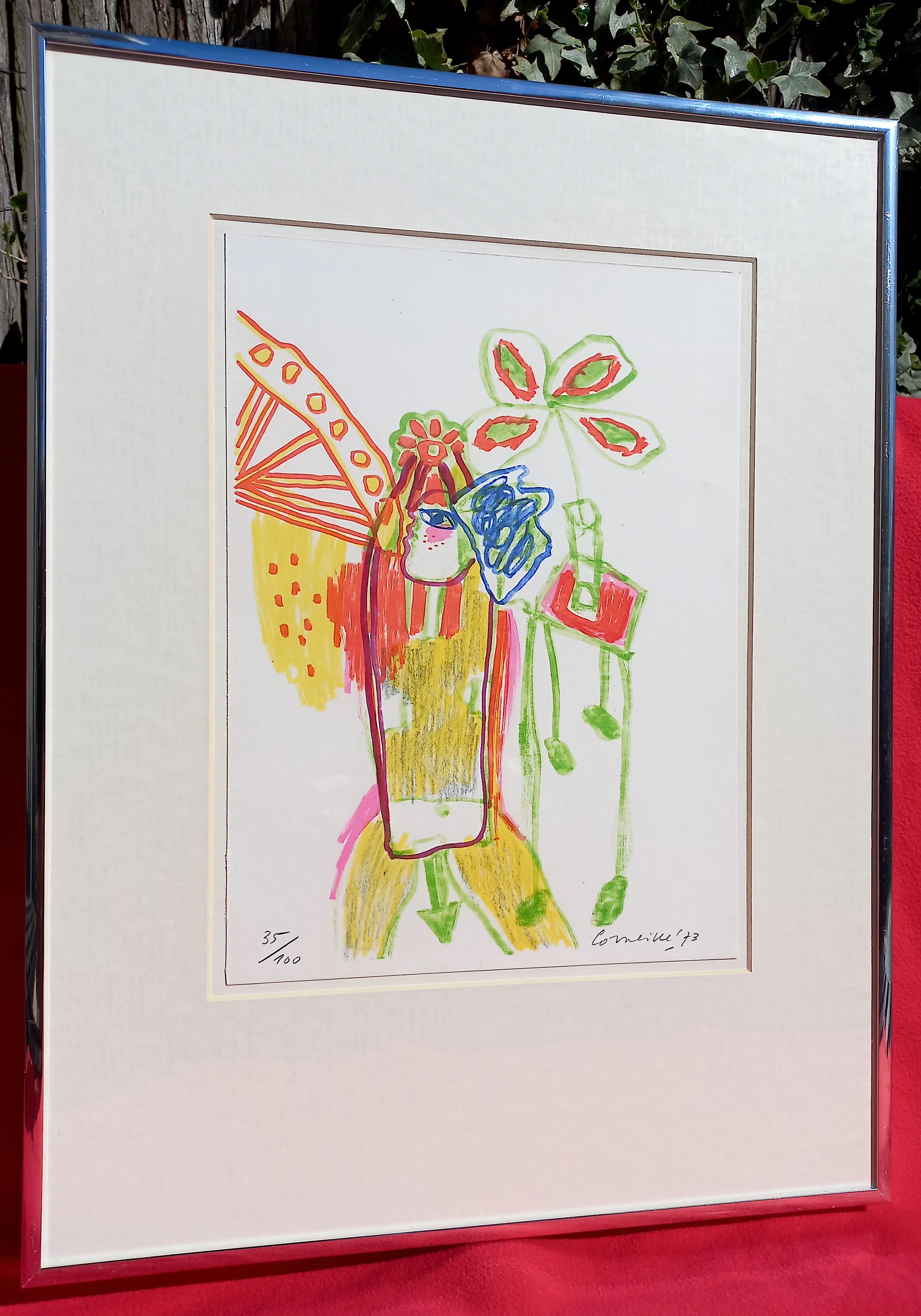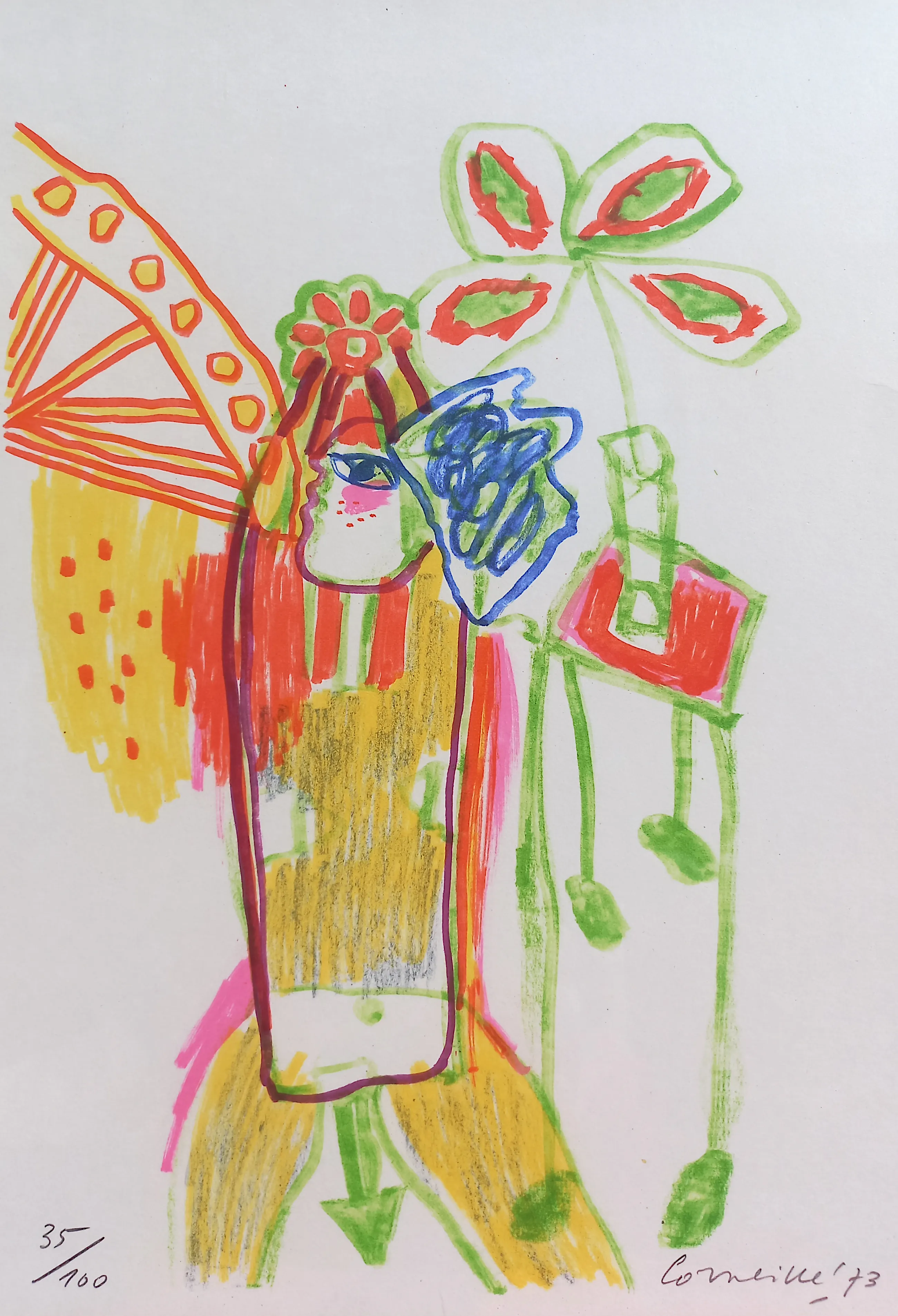 Karakteristieke compositie van Corneille uit de reeks “Cinquante ans de Poesie” (1973). Zeefdruk op papier, met potlood gesigneerd, gedateerd en genummerd (35/100). Het volledige blad ingelijst, achter glas en met passe-partout. In zeer goede conditie. Literatuur: Donkersloot 290.