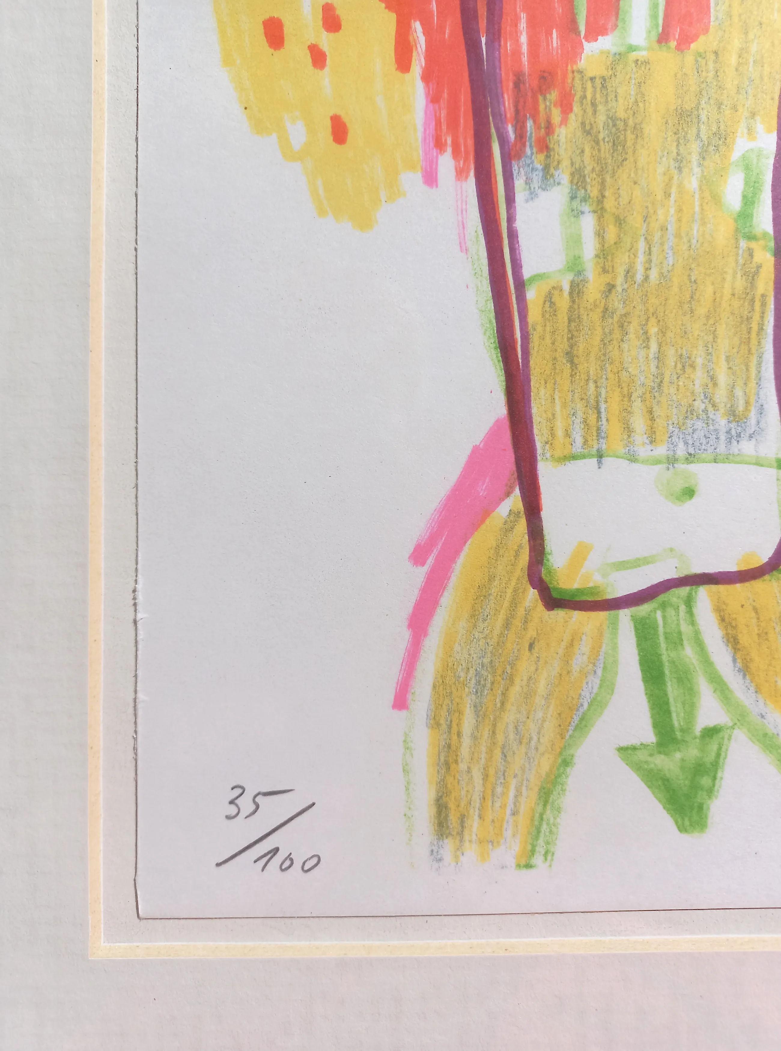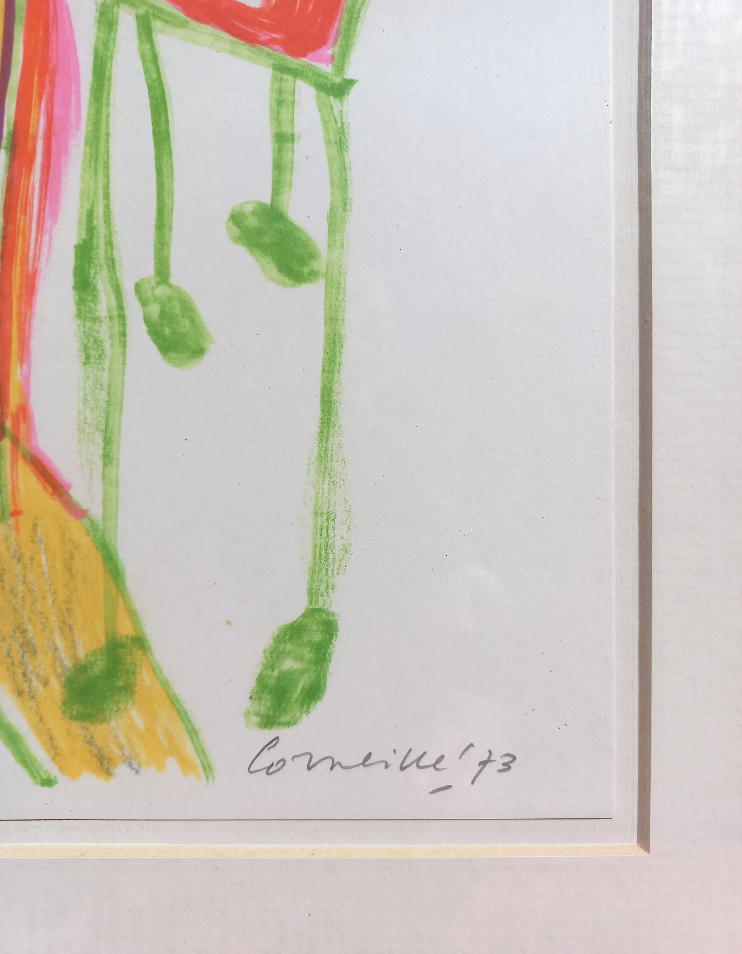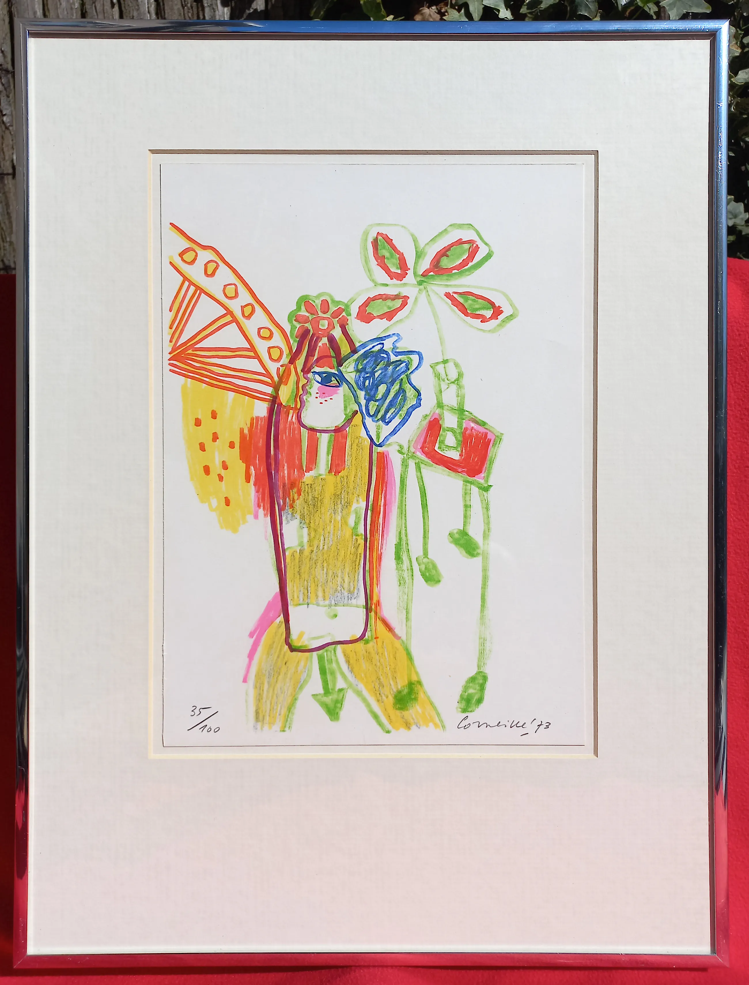 Karakteristieke compositie van Corneille uit de reeks “Cinquante ans de Poesie” (1973). Zeefdruk op papier, met potlood gesigneerd, gedateerd en genummerd (35/100). Het volledige blad ingelijst, achter glas en met passe-partout. In zeer goede conditie. Literatuur: Donkersloot 290.