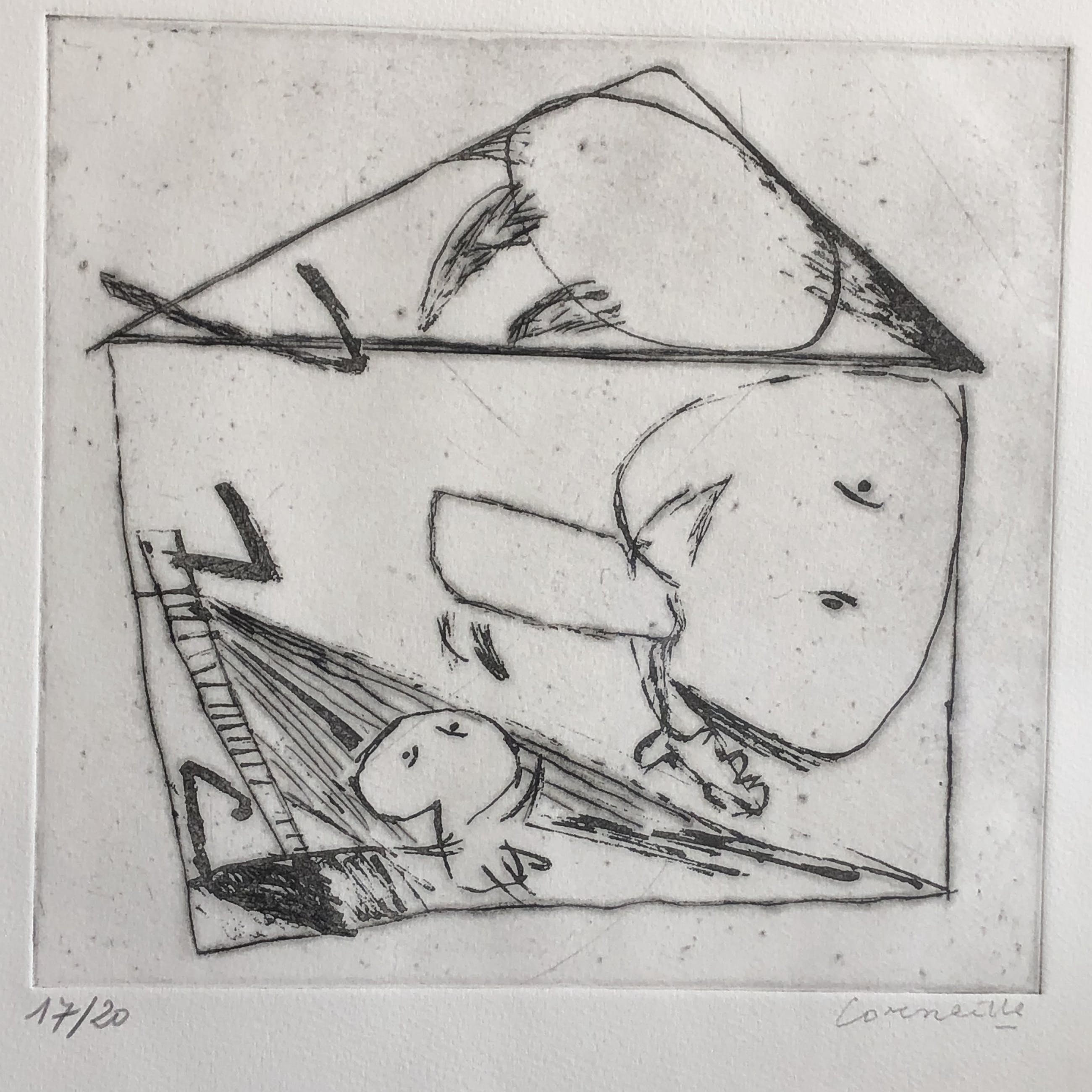 Kleine zwart wit ets van Corneille in prima staat. Het werk is ingelijst en kan zo worden opgehangen. Het werk kan worden bekeken of na aankoop worden opgehaald bij galerie Rotor in Gorcum. Het werk kan ook per koerier worden verzonden of voor risico (glasbreuk) van de koper per aangetekende post worden toegestuurd.