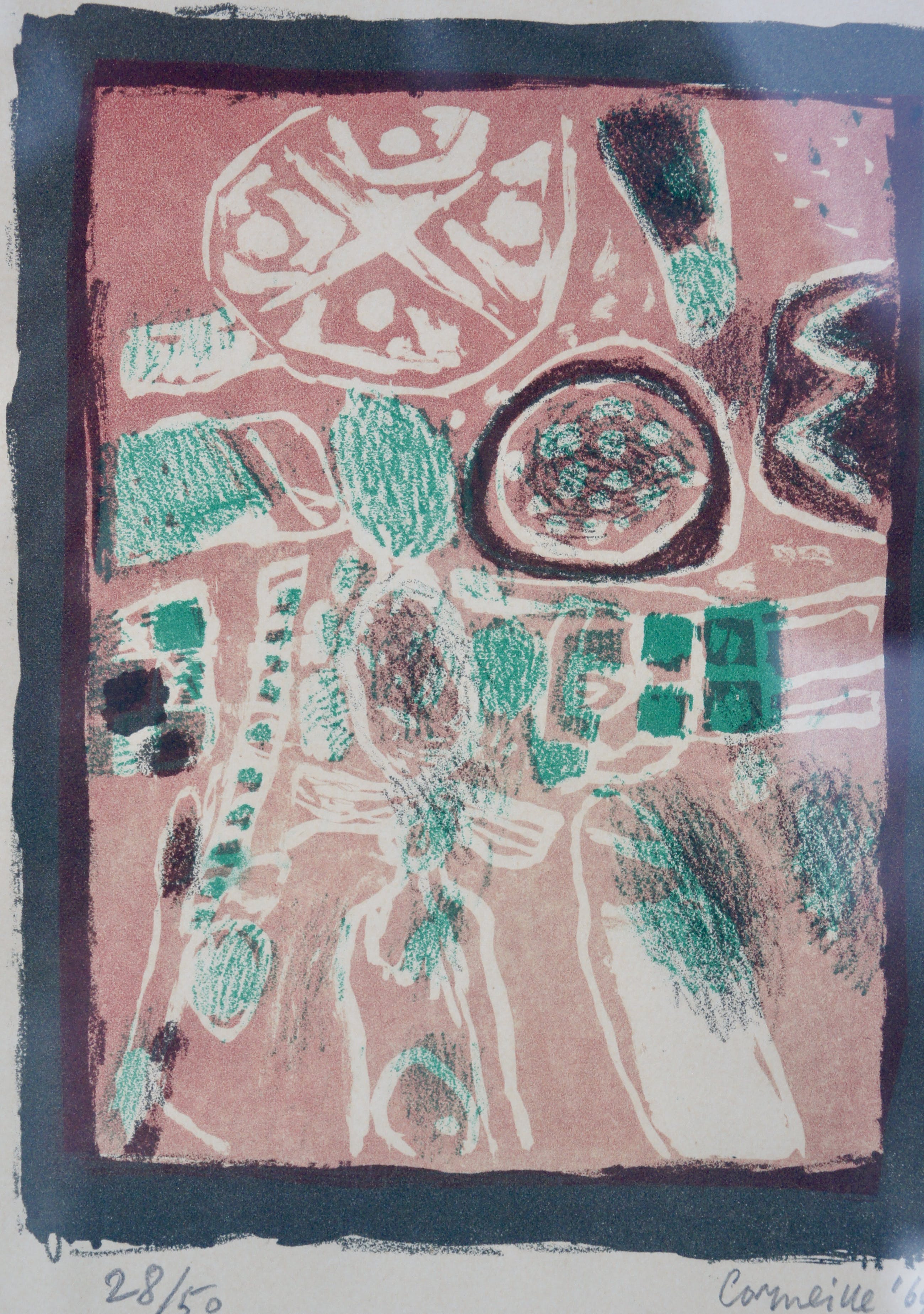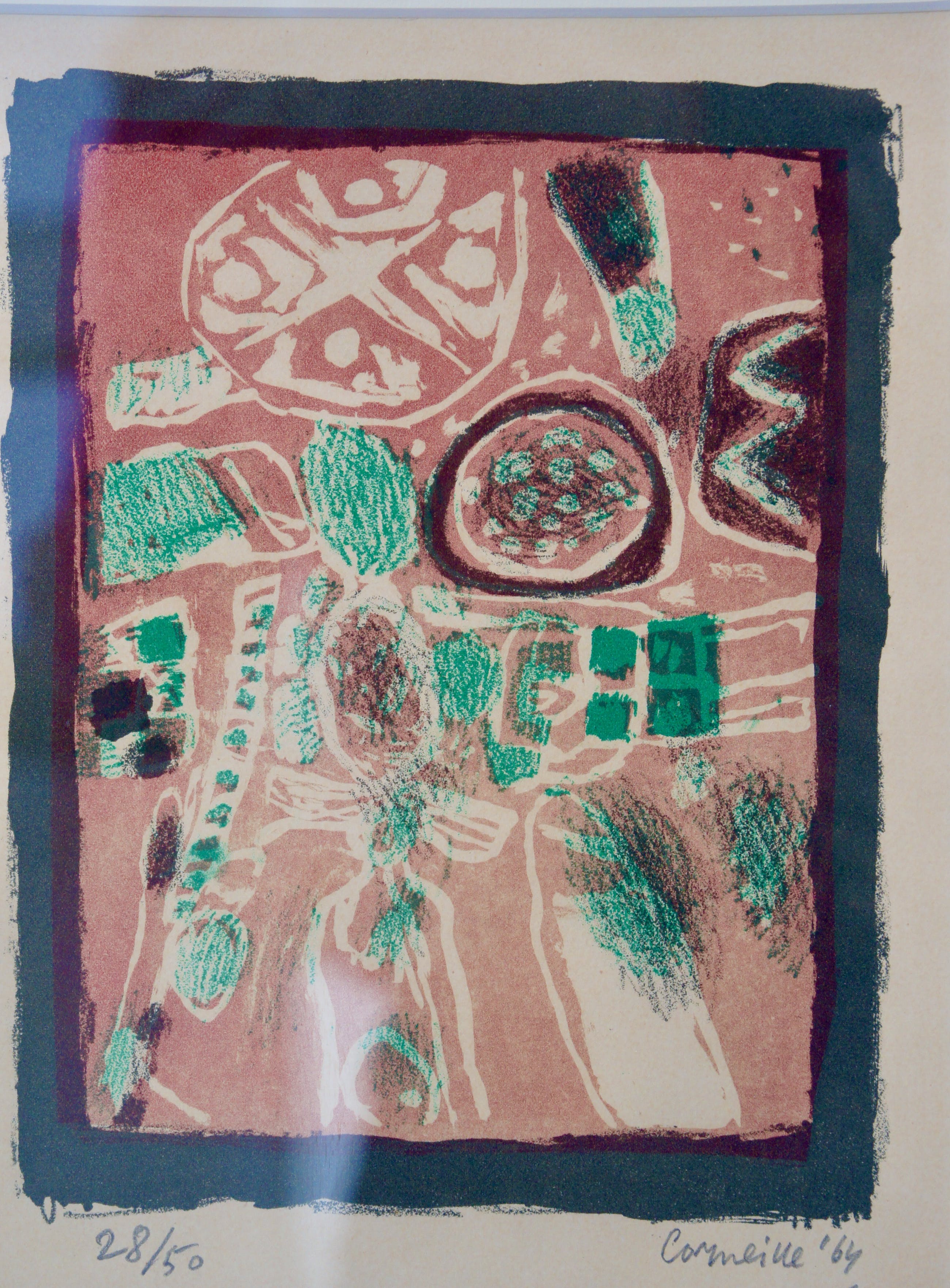 Typisch jaren 60 abstract vroeg werk van Corneille, qua uitvoering en kleurstelling. Zonder titel. Zeldzaam werk. (Foto's soms met weerschijn licht via het glas ) In licht bronskleurige lijst, achter glas, met fraai passe partout. ( ivoor kleur )