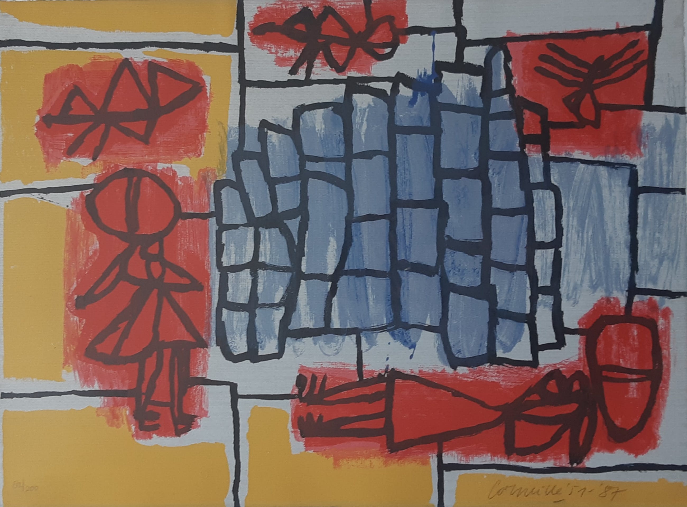Mooi ingelijst werk van Corneille. Dit is een werk uit de CoBrA periode dat in 1987 door de kunstenaar zelf als zeefdruk is uitgevoerd. Fraai ingelijst en voorzien van een Passe-partout. Extra mooi is dat het werk tot over de scheprand is bedrukt en zwevend in het Passe-partout is gelijst. Kan zo aan iedere muur!