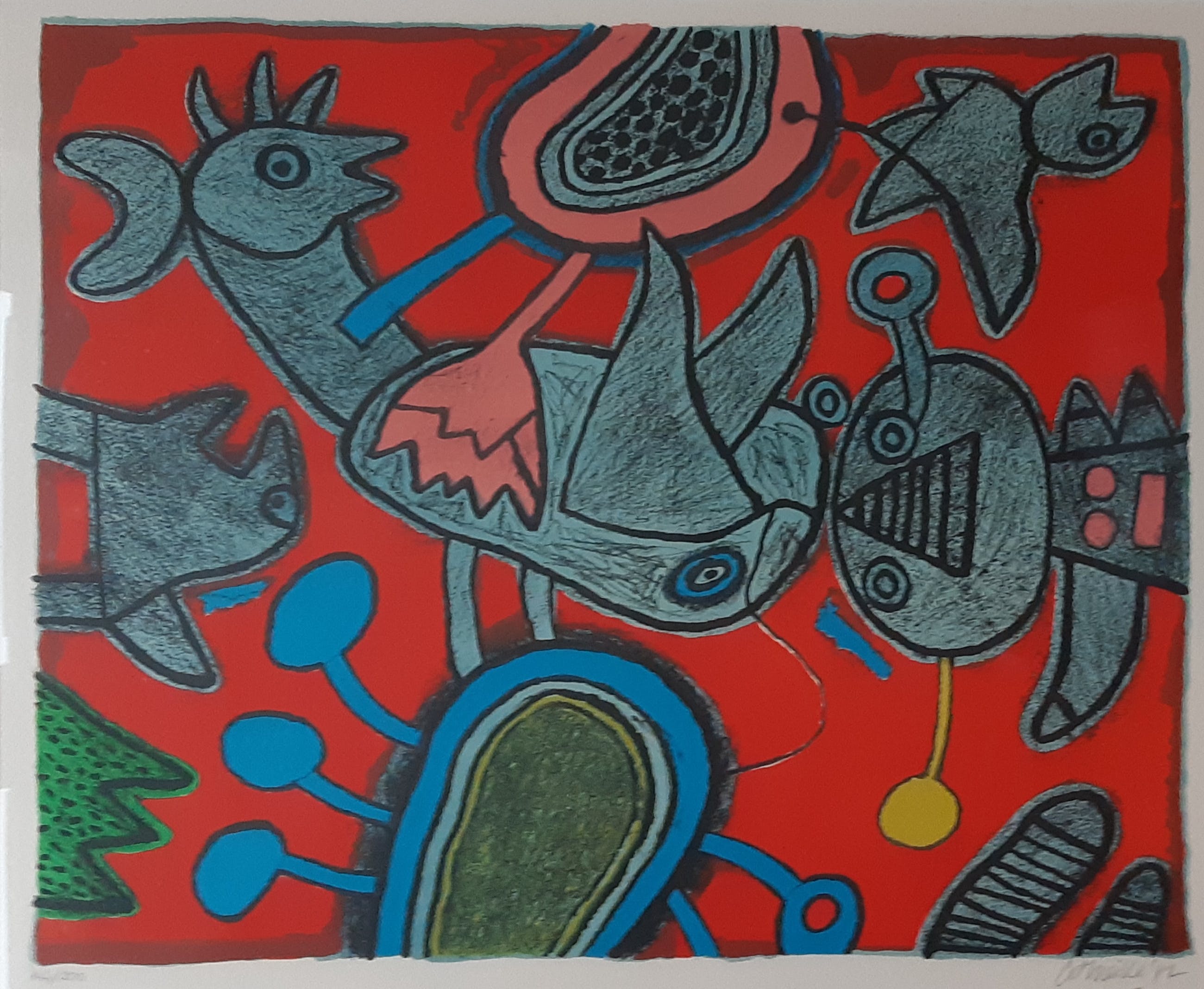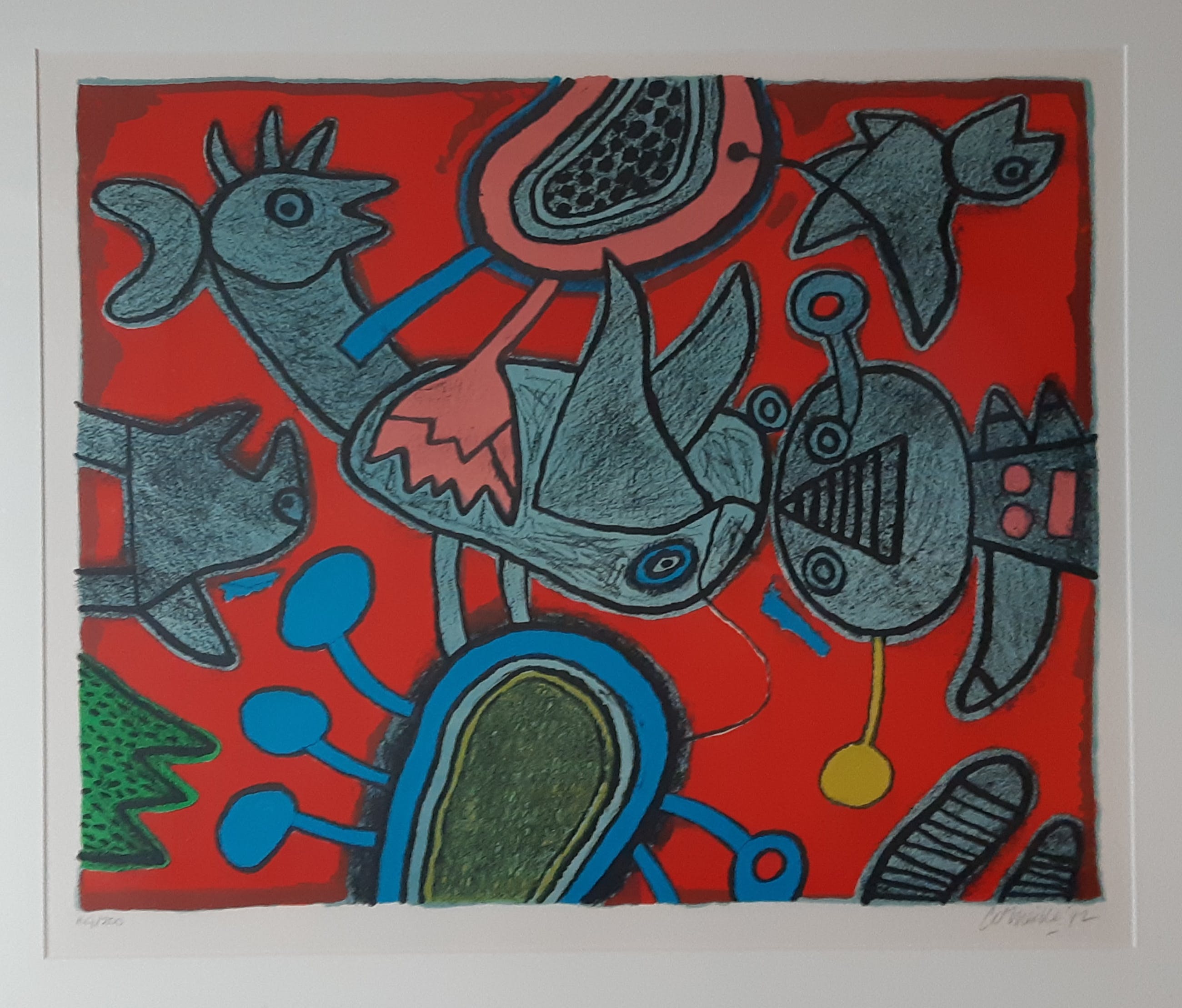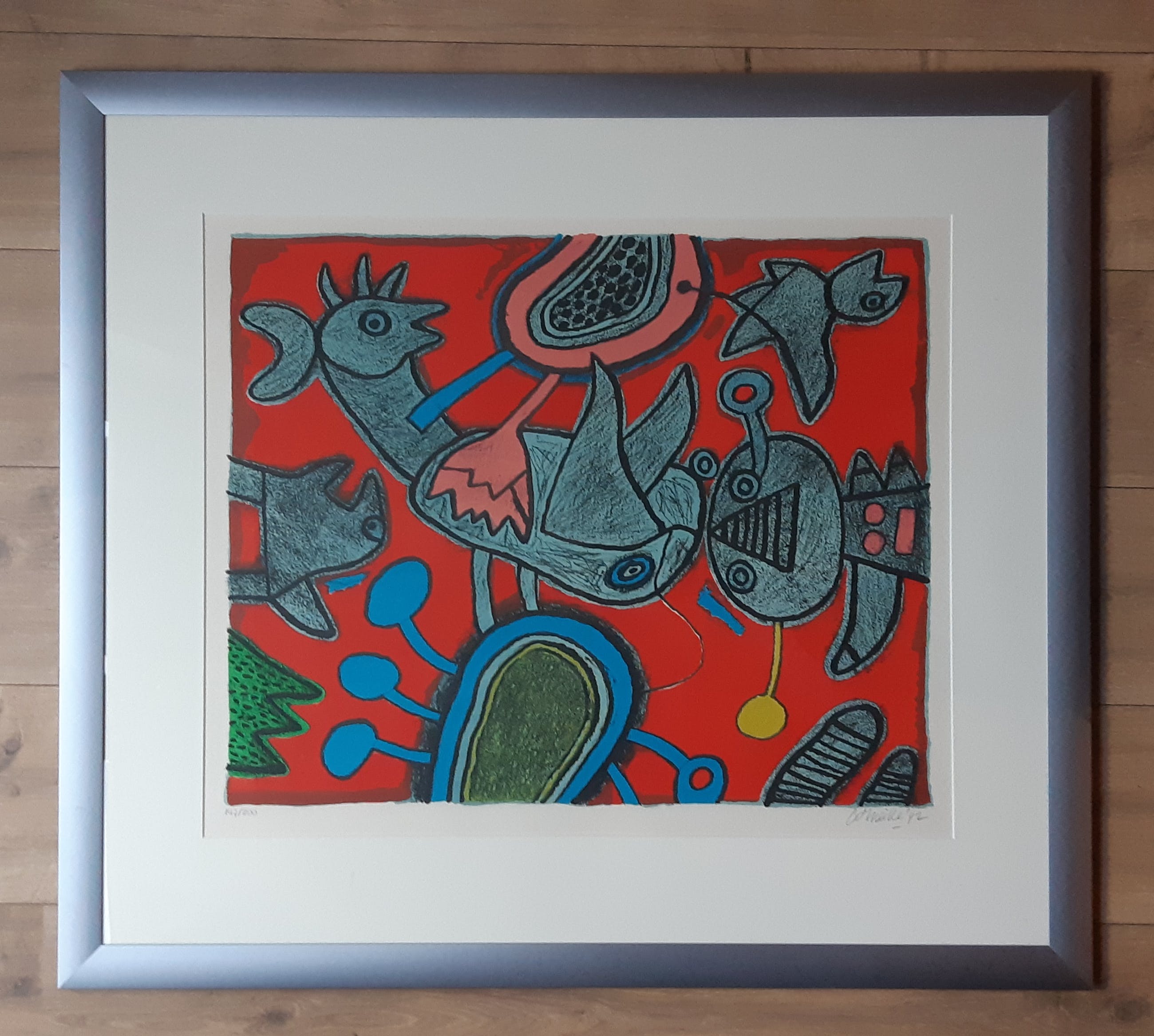 Erg mooie en kwalitatief zéér goed ingelijste zeefdruk van het CoBrA lid van het eerste uur Corneille. Gesigneerd en genummerd in potlood door de kunstenaar. Dit is nummer 247uit een serie van 200 exemplaren. Ingelijst in een solide metalen lijst en voorzien van een Passe-partout. Kan zo aan iedere muur!
