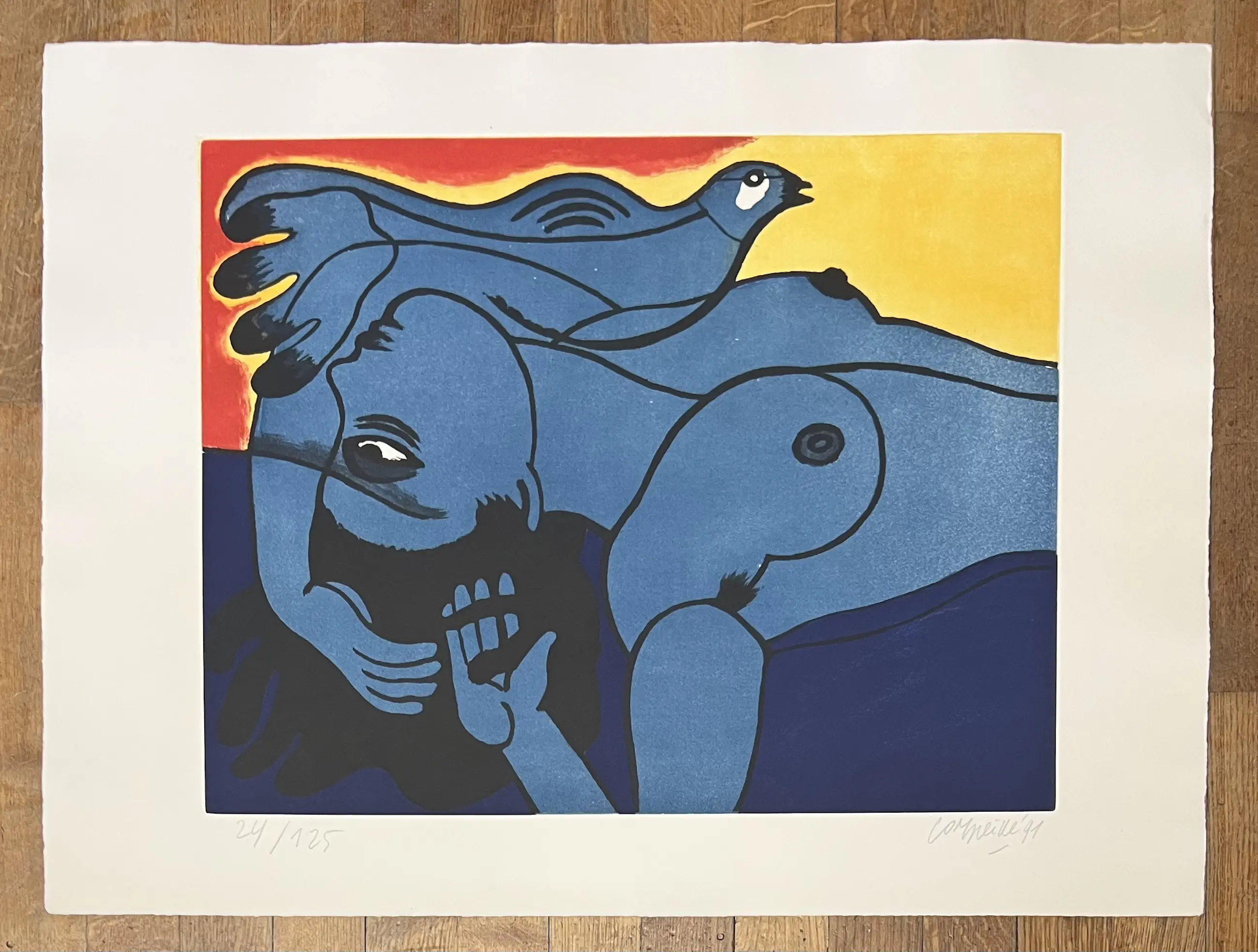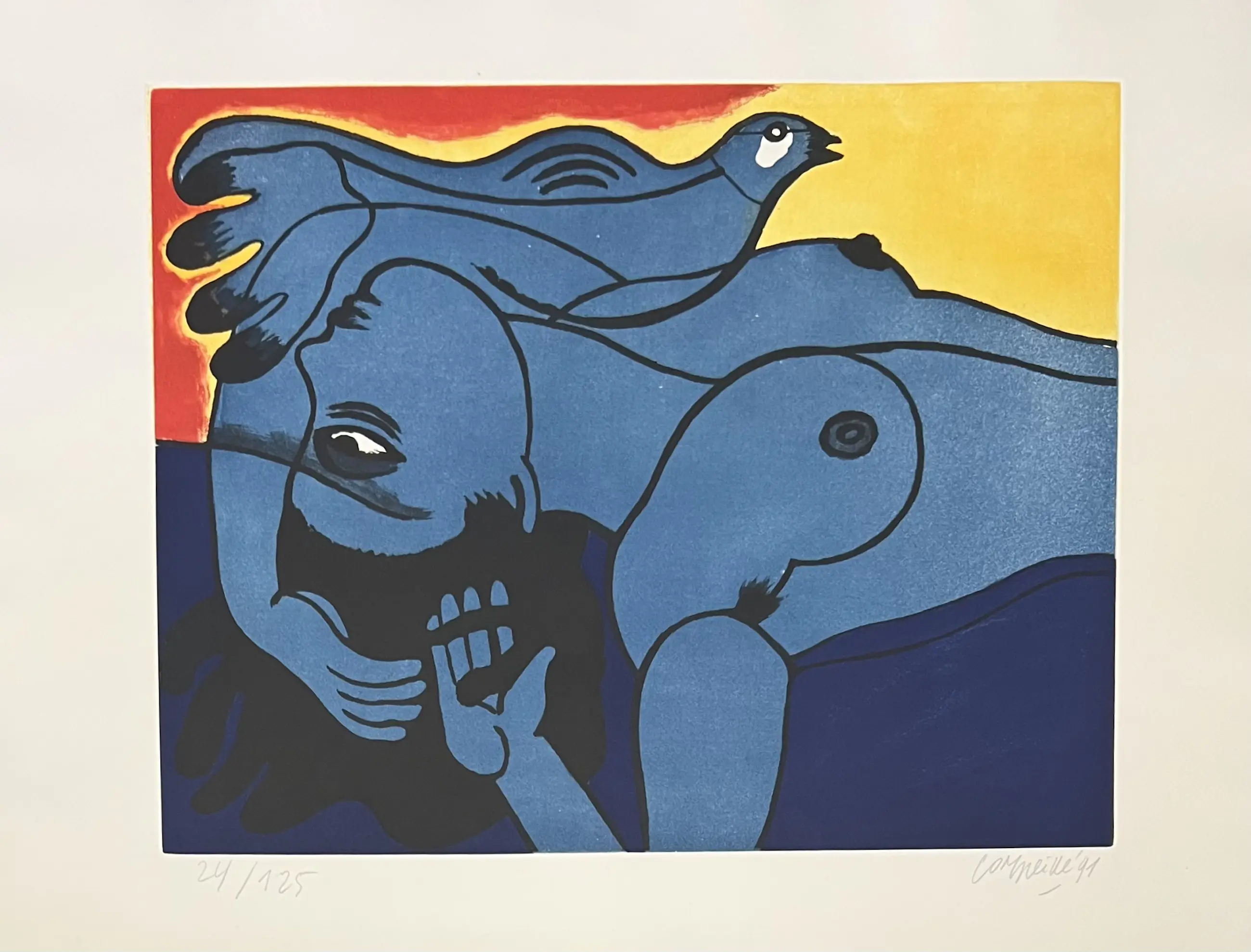 Corneille werd geïdentificeerd als een belangrijke figuur in de vernieuwing van de abstractie in Noord-Europa. Vanaf 1967 evolueerde hij geleidelijk naar een rijke en kleurrijke Nouvelle Figuration die aansloot bij de Pop Art-smaak van de jaren 1960 en 1970. Hij stelde tentoon naast Andy Warhol, Arman, César, enz.Originele aquatint, gesigneerd en gedateerd in grafiet door de kunstenaar.