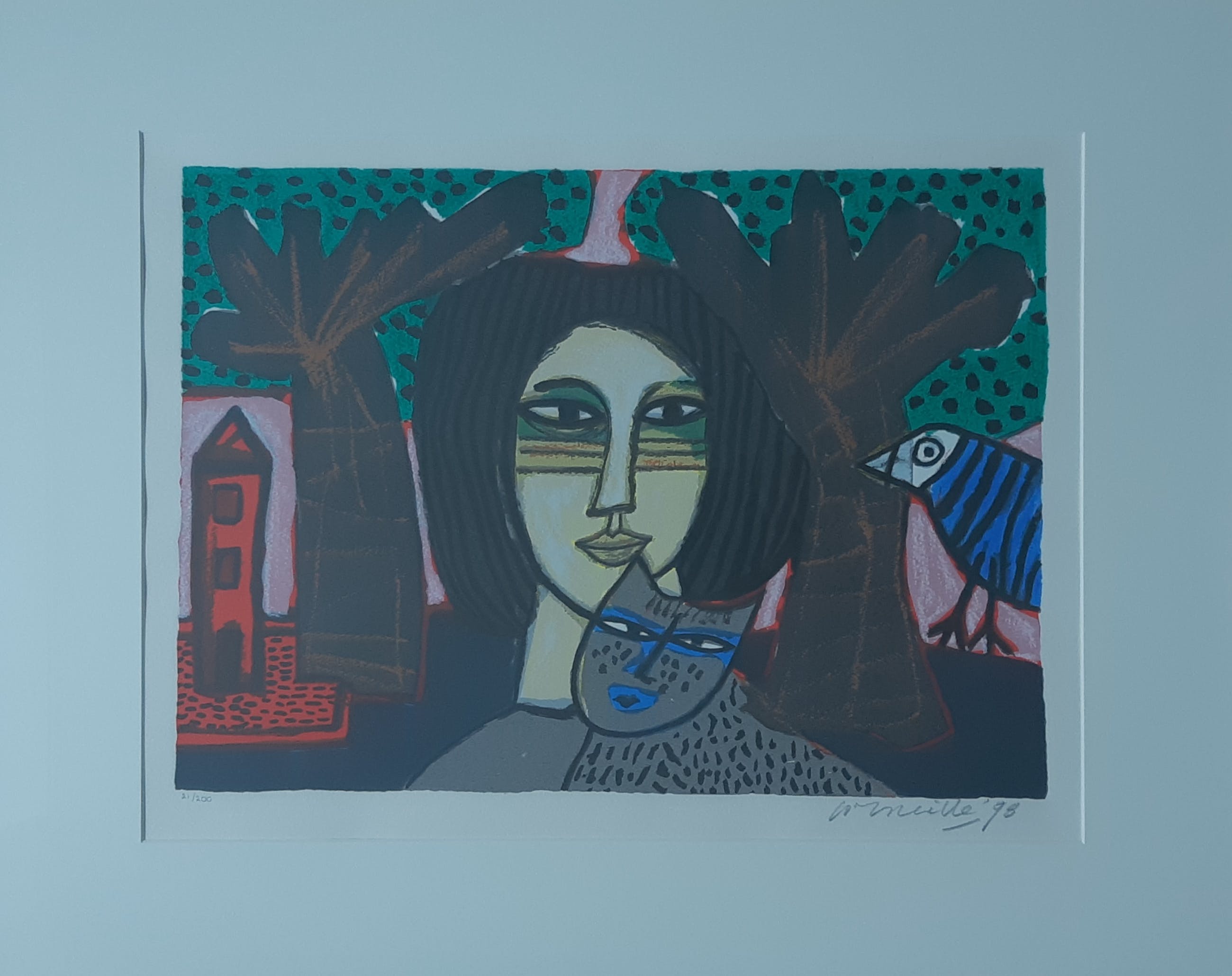 Fraai ingelijste zeefdruk van Corneille uit 1998. De zilverkleurige houten lijst heeft een gelaagd profiel wat een extra diepte in het geheel maakt. Voorzien van een professioneel gesneden Passe-partout. Dit is nummer 21 uit een serie van 200 exemplaren. Gesigneerd, gedateerd en genummerd in potlood door de kunstenaar. Werkelijk een prachtig geheel dat zo aan de muur kan!!