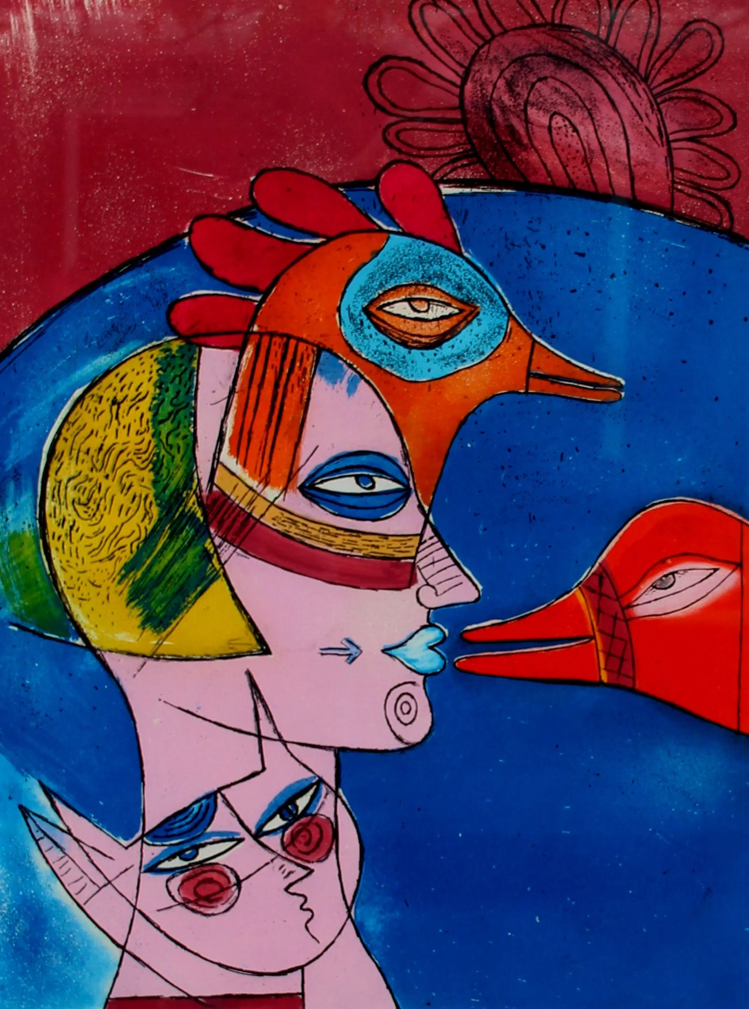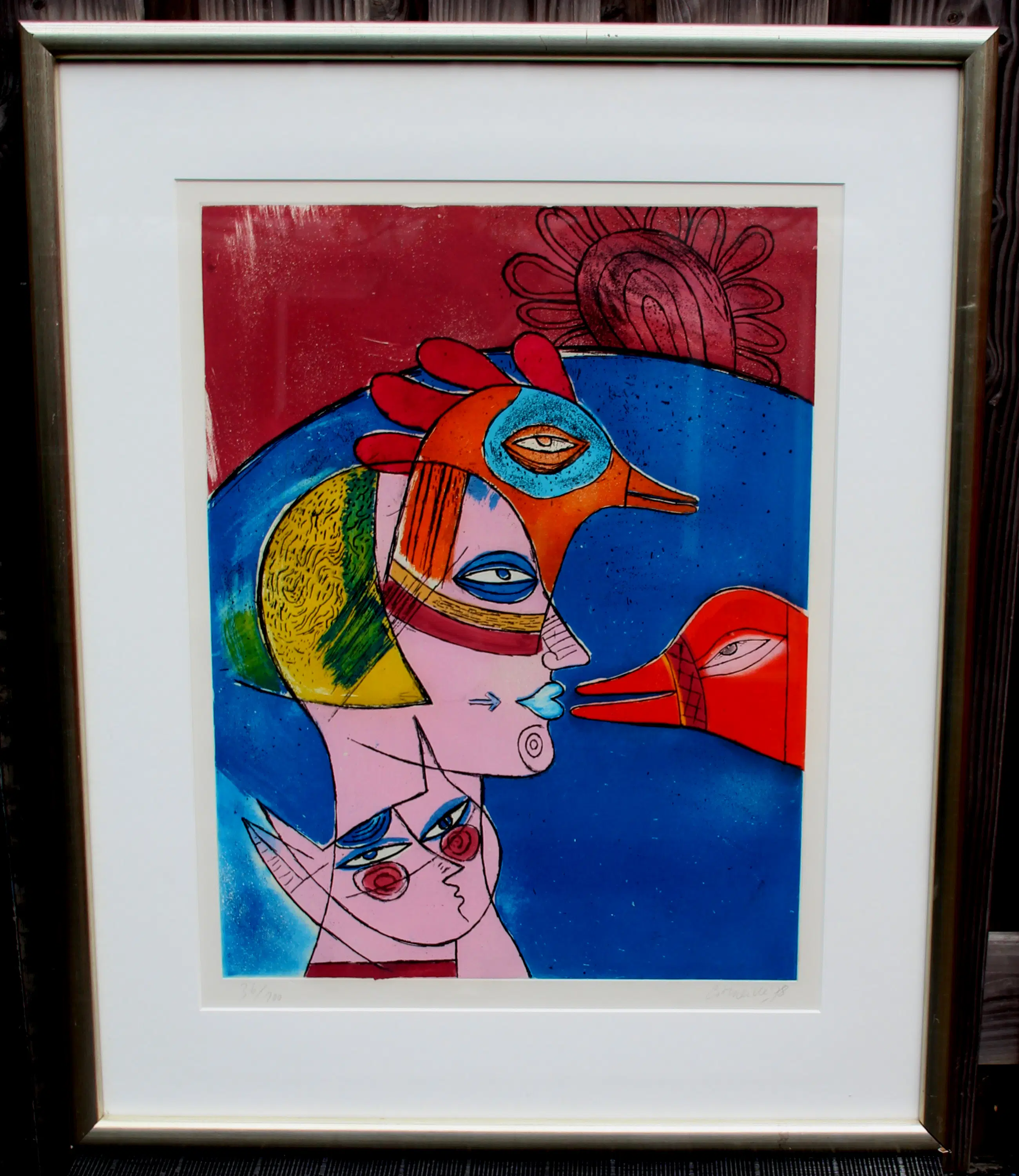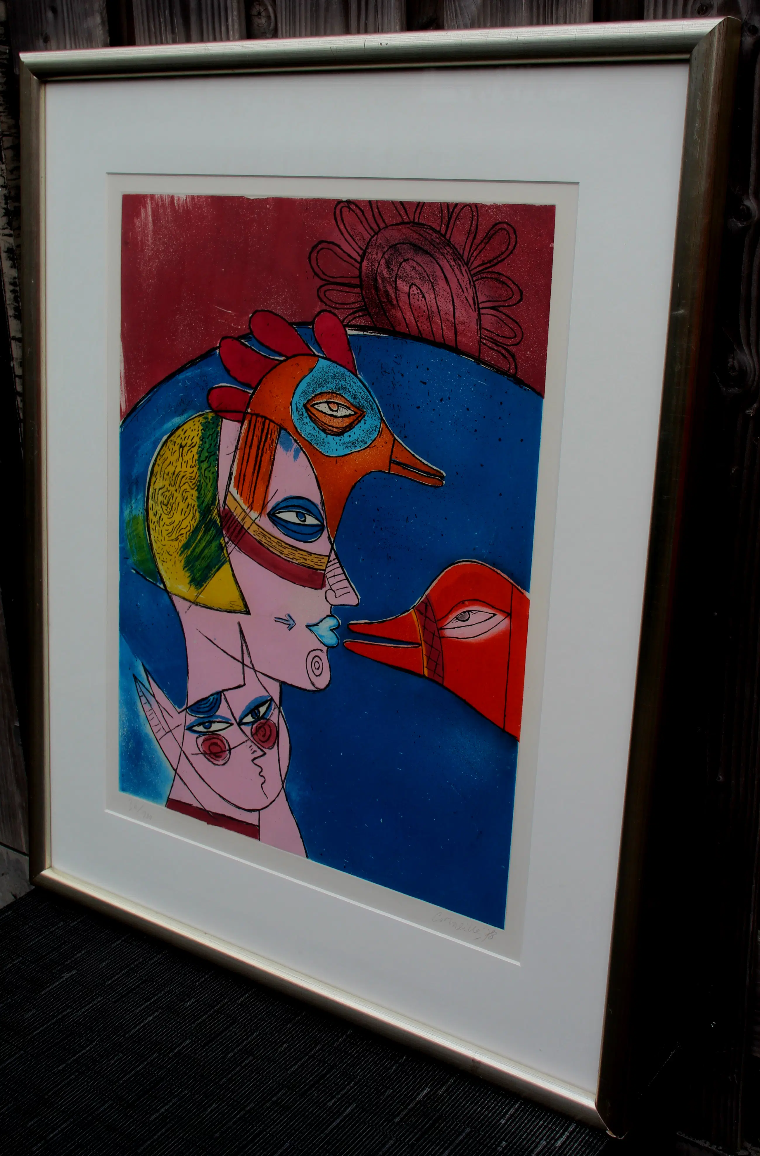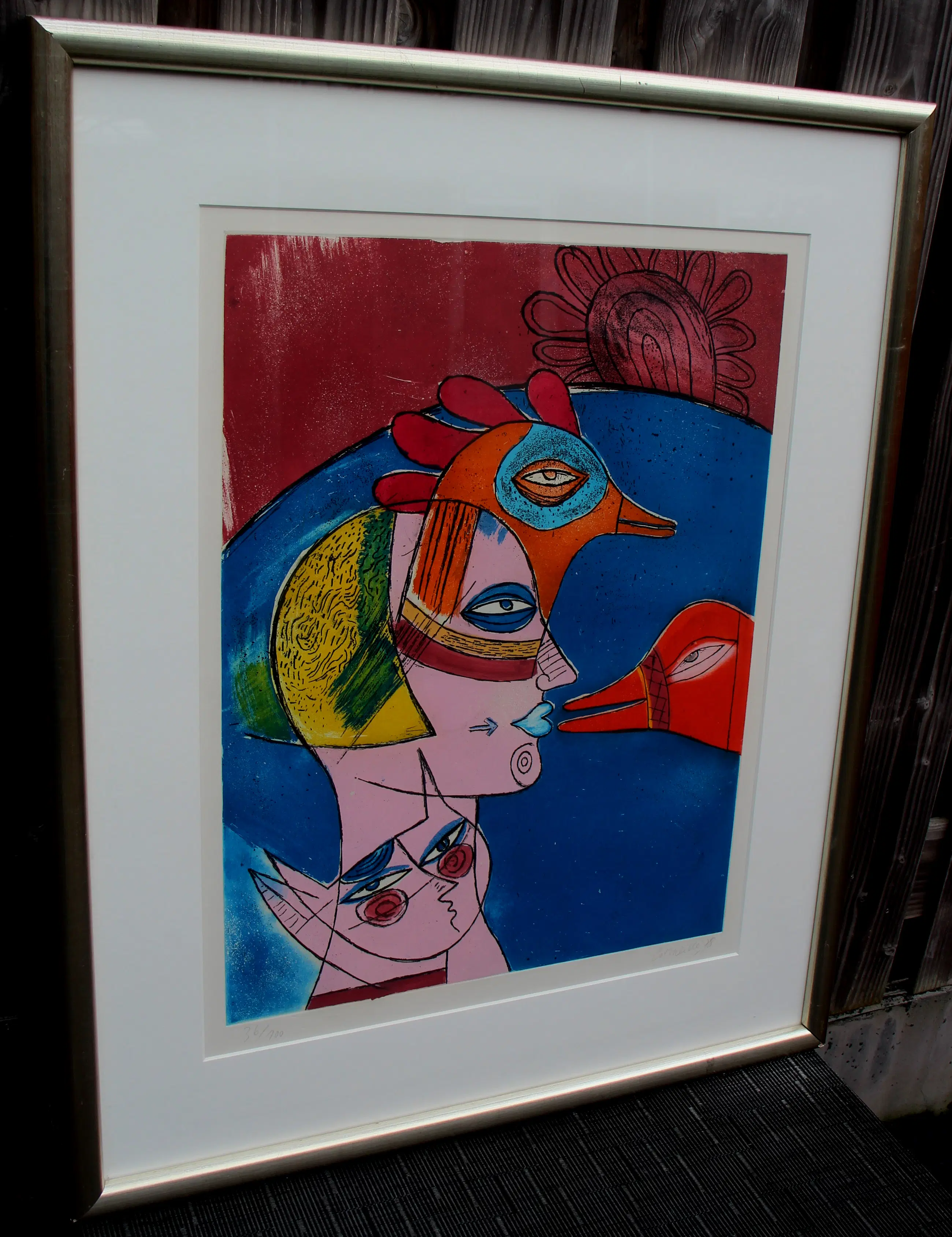 Ingelijste ets van Corneille. Titel: jeux entre chat et oiseau(spelletjes tussen kat en vogel). Jaar: 1978. Oplage: 36/100. Afmetingen incl lijst: H94 x b77cm. Afmetingen voorstelling: H64 x b50cm. Het werk is rechts onderaan, gesigneerd en gedateerd door de kunstenaar. De authenticiteit van het aangeboden werk wordt volledig gegarandeerd. Een certificaat van echtheid kan, op aanvraag, worden gemaild.