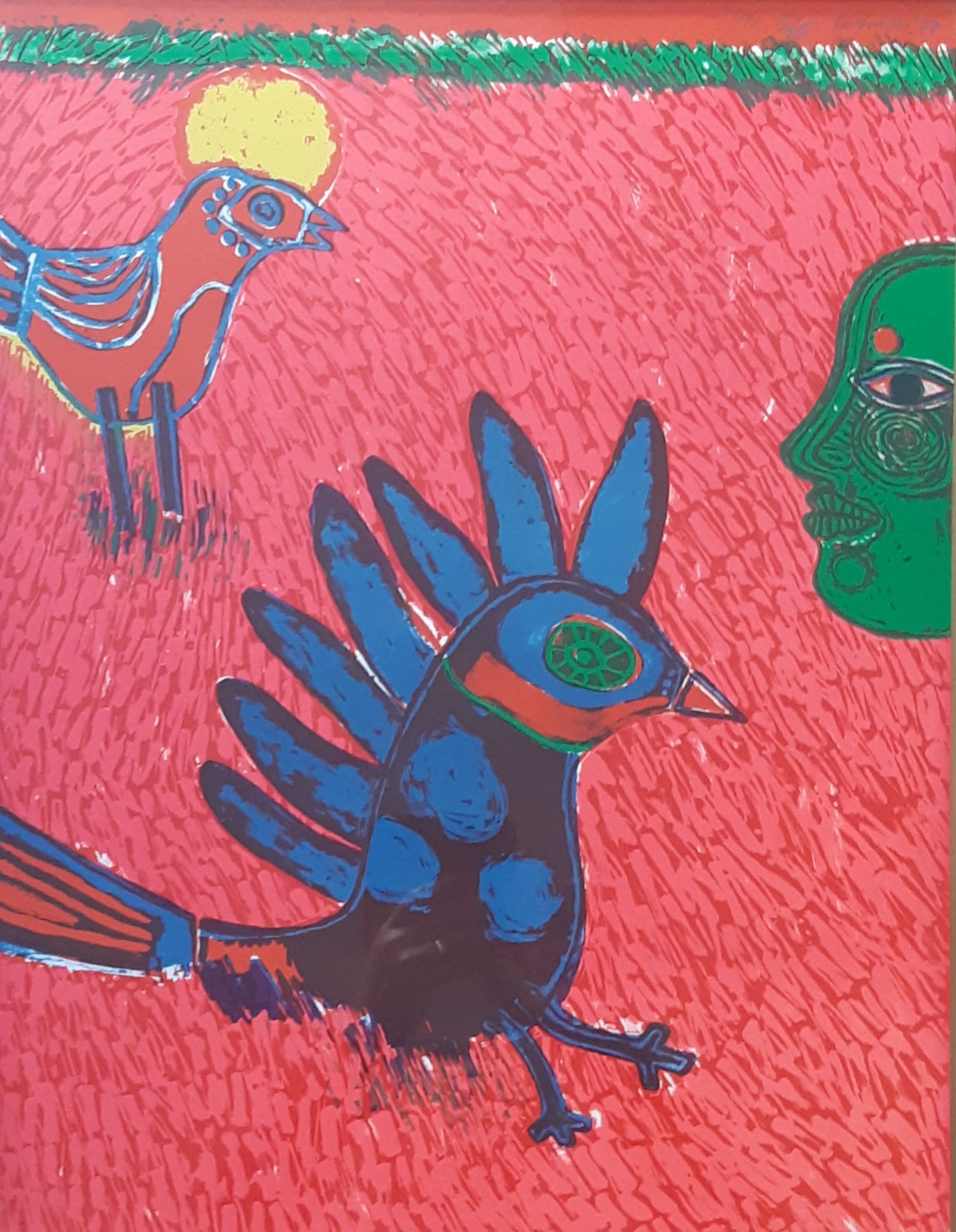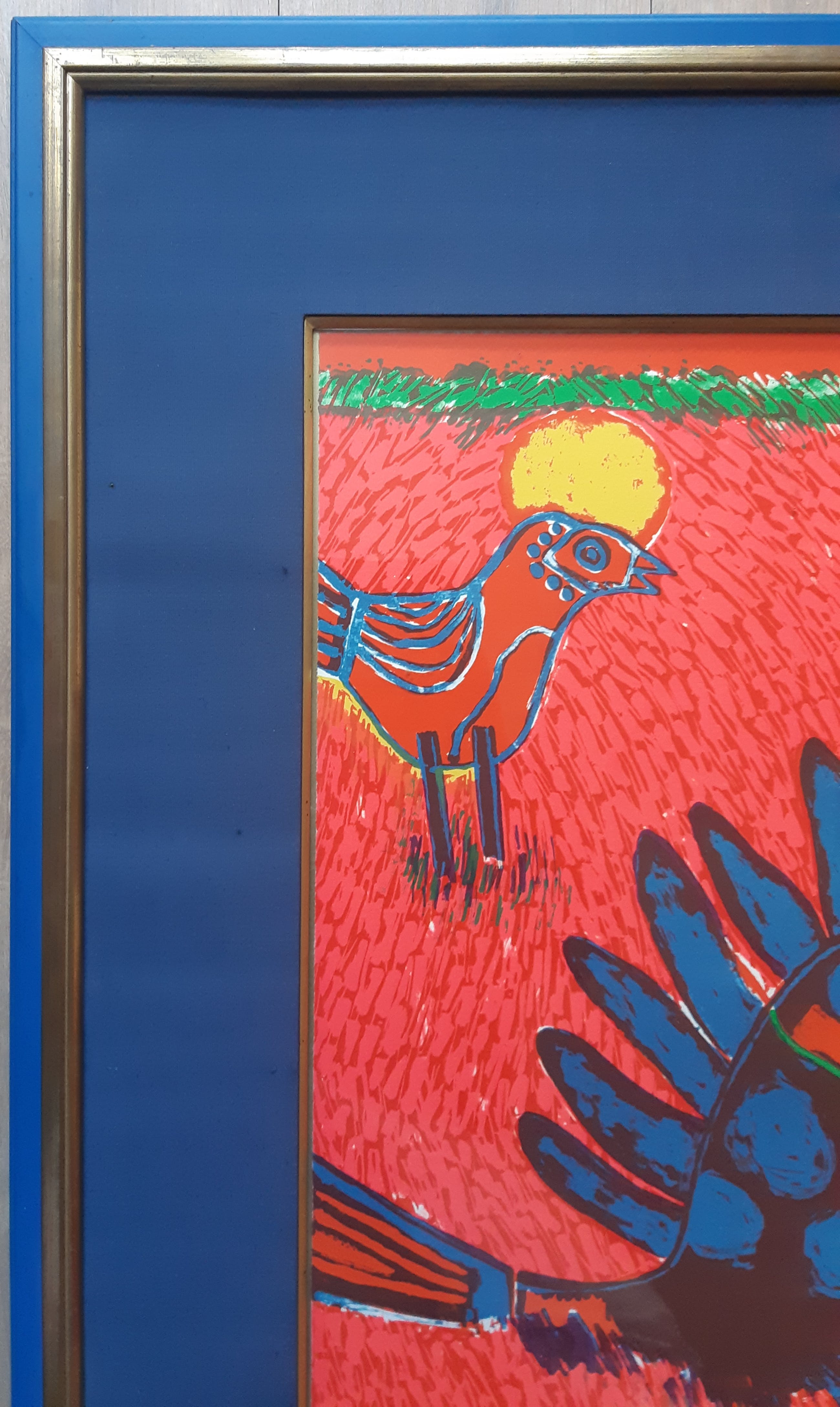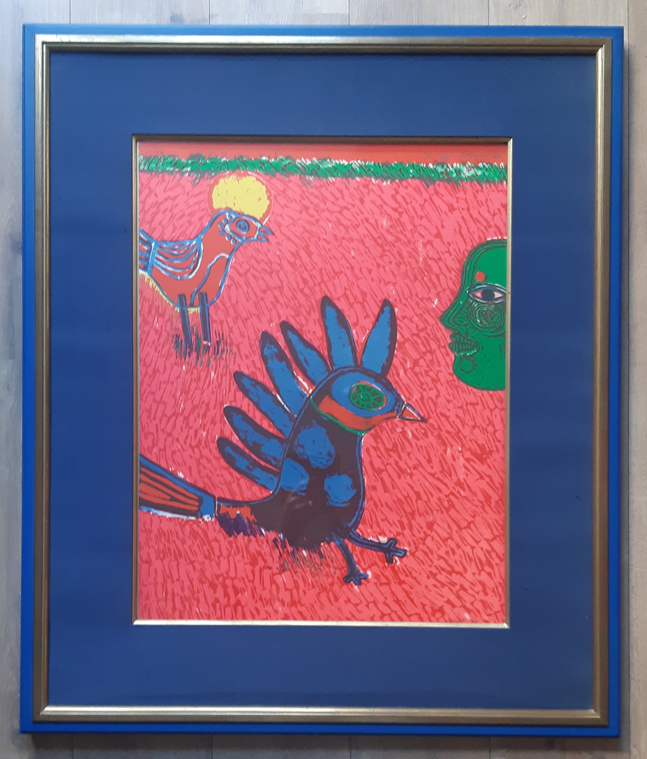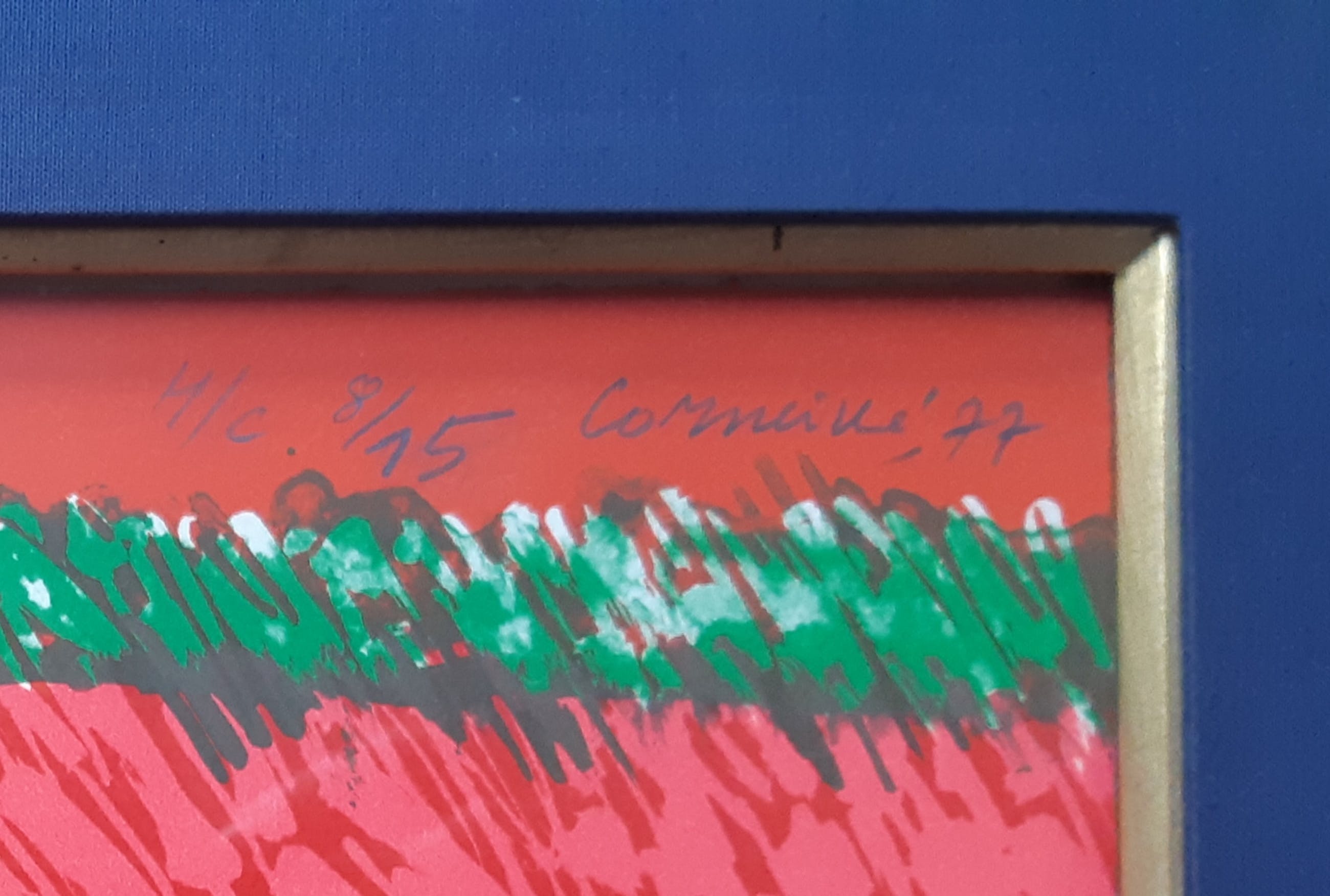 Erg smaakvol en bijzonder ingelijst werk van Corneille. De binnenkant van het geheel dat als Passe-partout dient, is van stof. Slechts de lithografie is afgedekt met een glasplaat, wat het een kunstzinnige omlijsting op zich maakt. Het werk is onderdeel van de portfolio " L'enchantement de l'ete " die in 1977 is gedrukt in Londen. Een vergelijkbaar exemplaren is opgenomen in de collectie van het Carnegie museum of modern art in Pittsburgh. Gesigneerd gedateerd en genummerd in potlood door de kunstenaar.