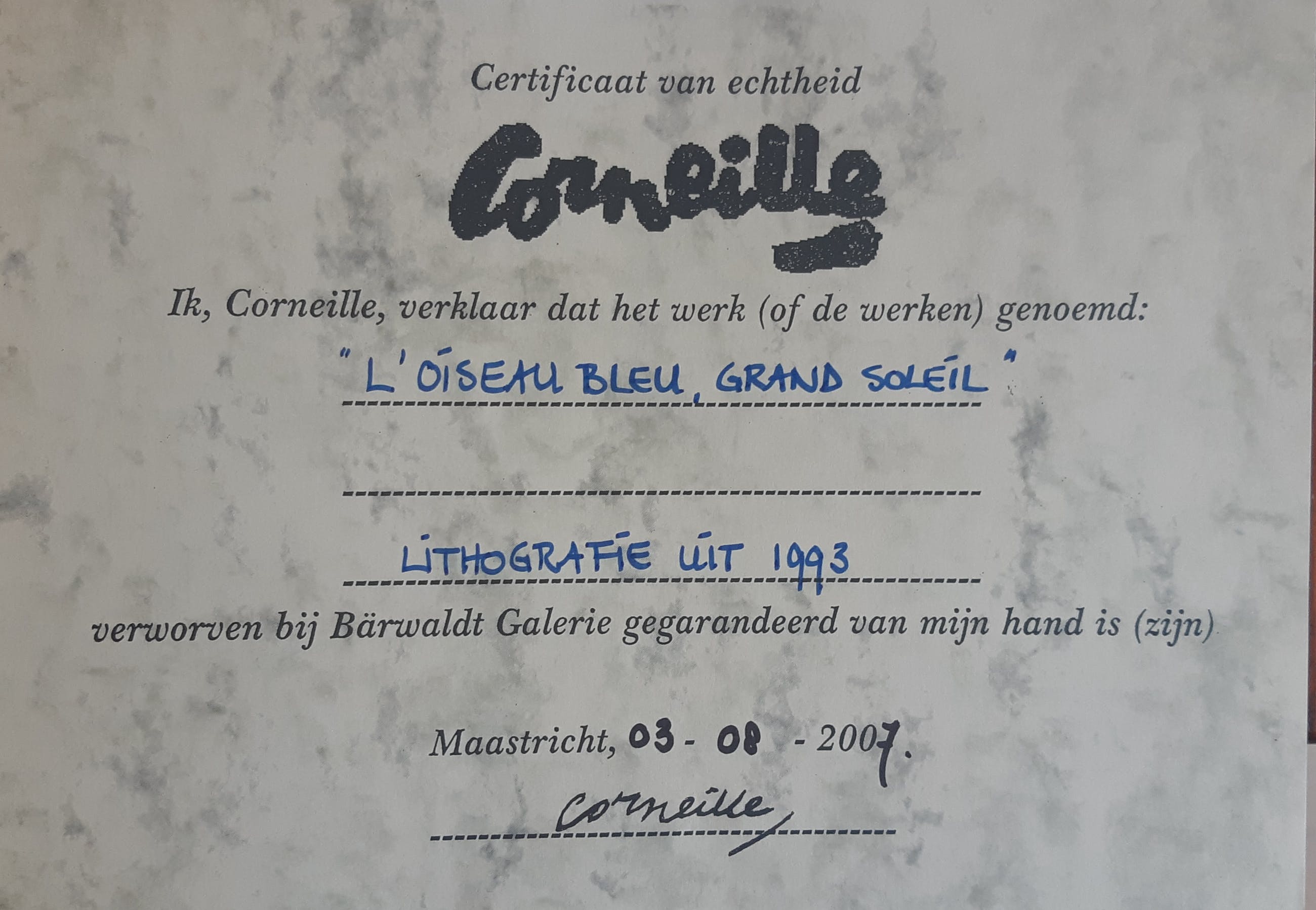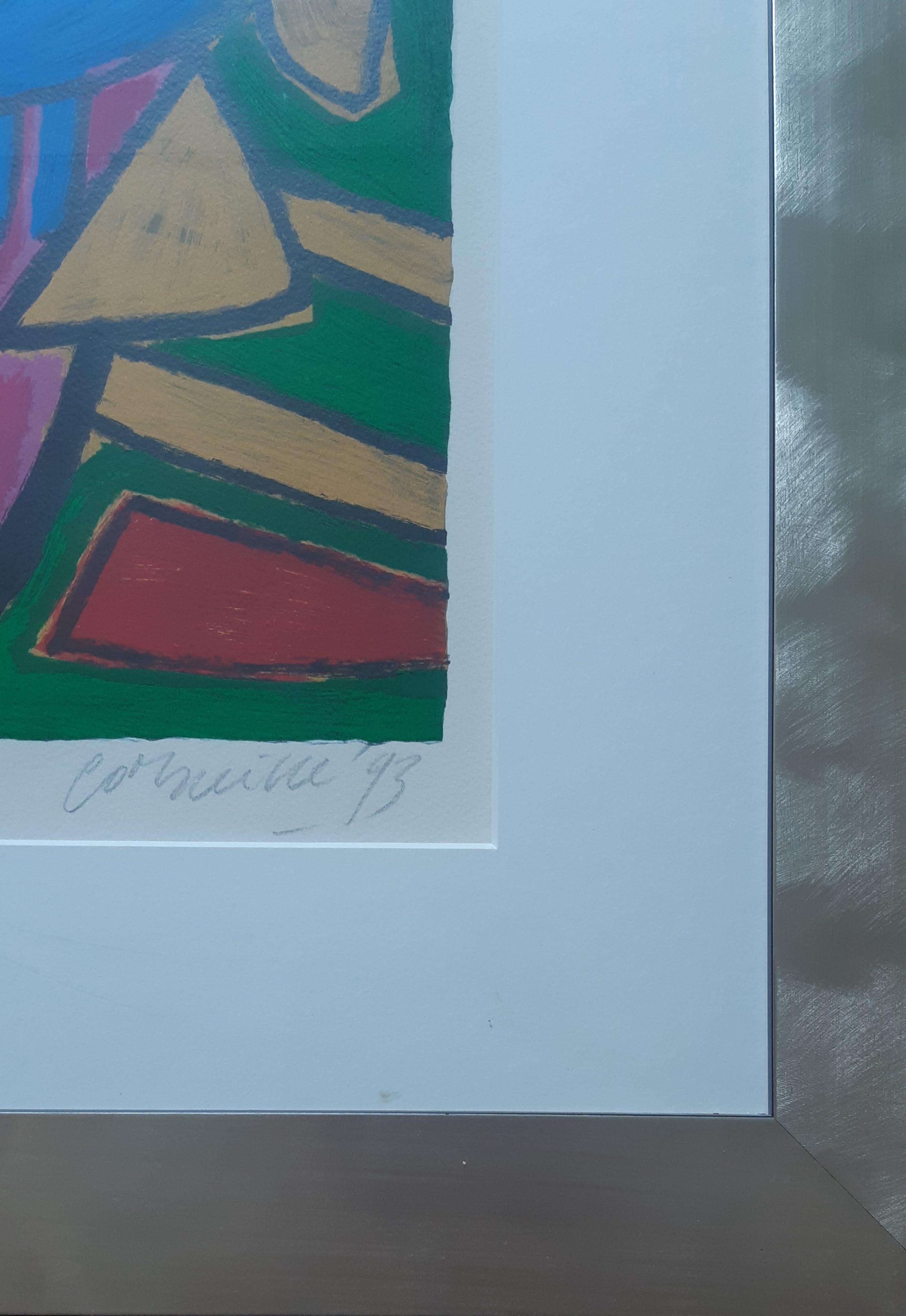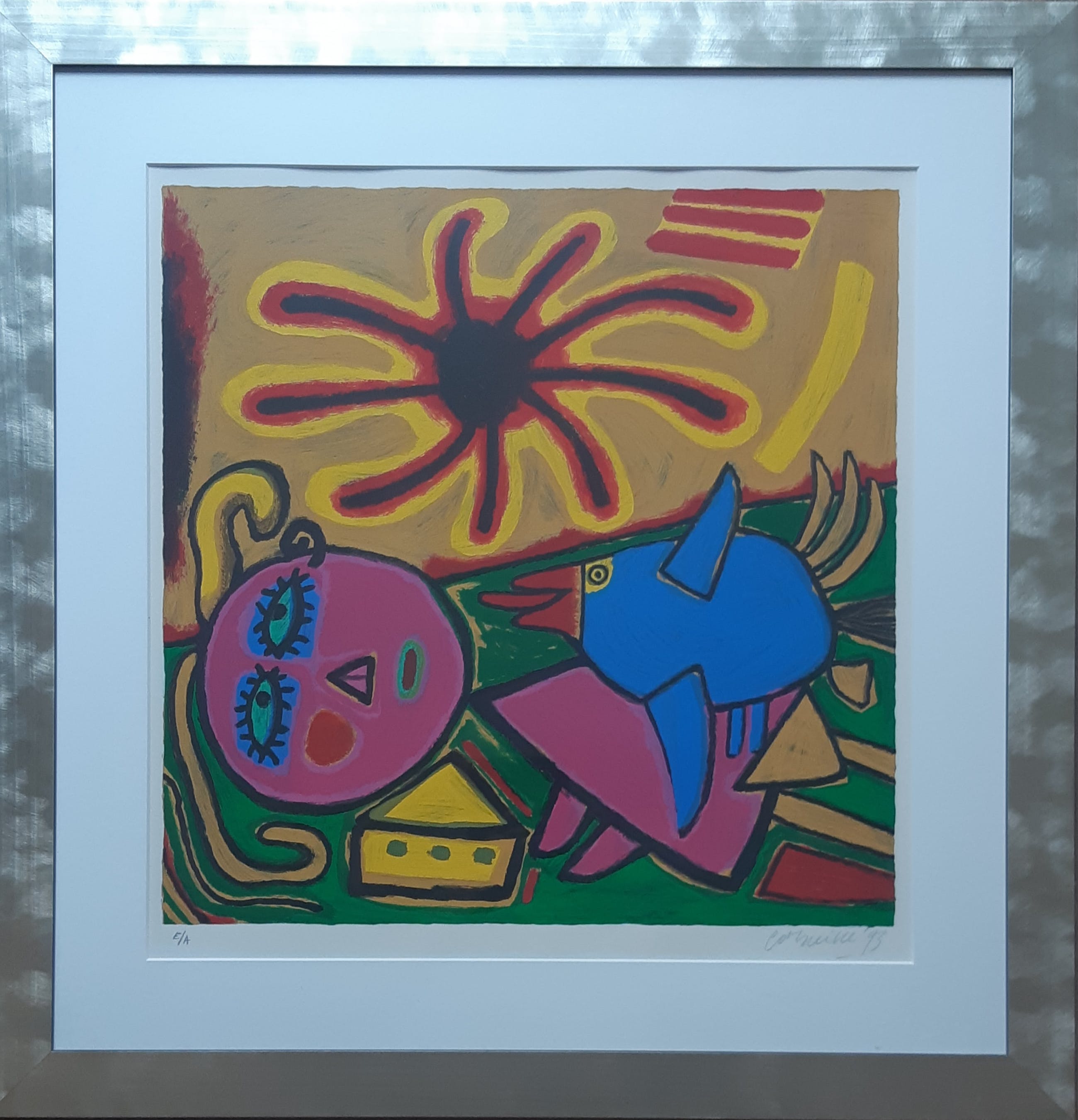Bijzonder mooi ingelijste zeefdruk van CoBrA- kunstenaar Corneille uit 1993. Gekaderd in Passe-partout en brede houten,zilverkleurige lijst met een geborsteld effect. Het betreft een Epreuve D'artiste en is gesigneerd en gedateerd in potlood door de kunstenaar. Bij het werk is een door Corneille gesigneerd certificaat van echtheid beschikbaar. Ook is er een handgeschreven verklaring van de Kunsthandel/ Galerie Barwaldt uit Maastricht aanwezig. Erg mooi geheel met een prachtige herkomst!!