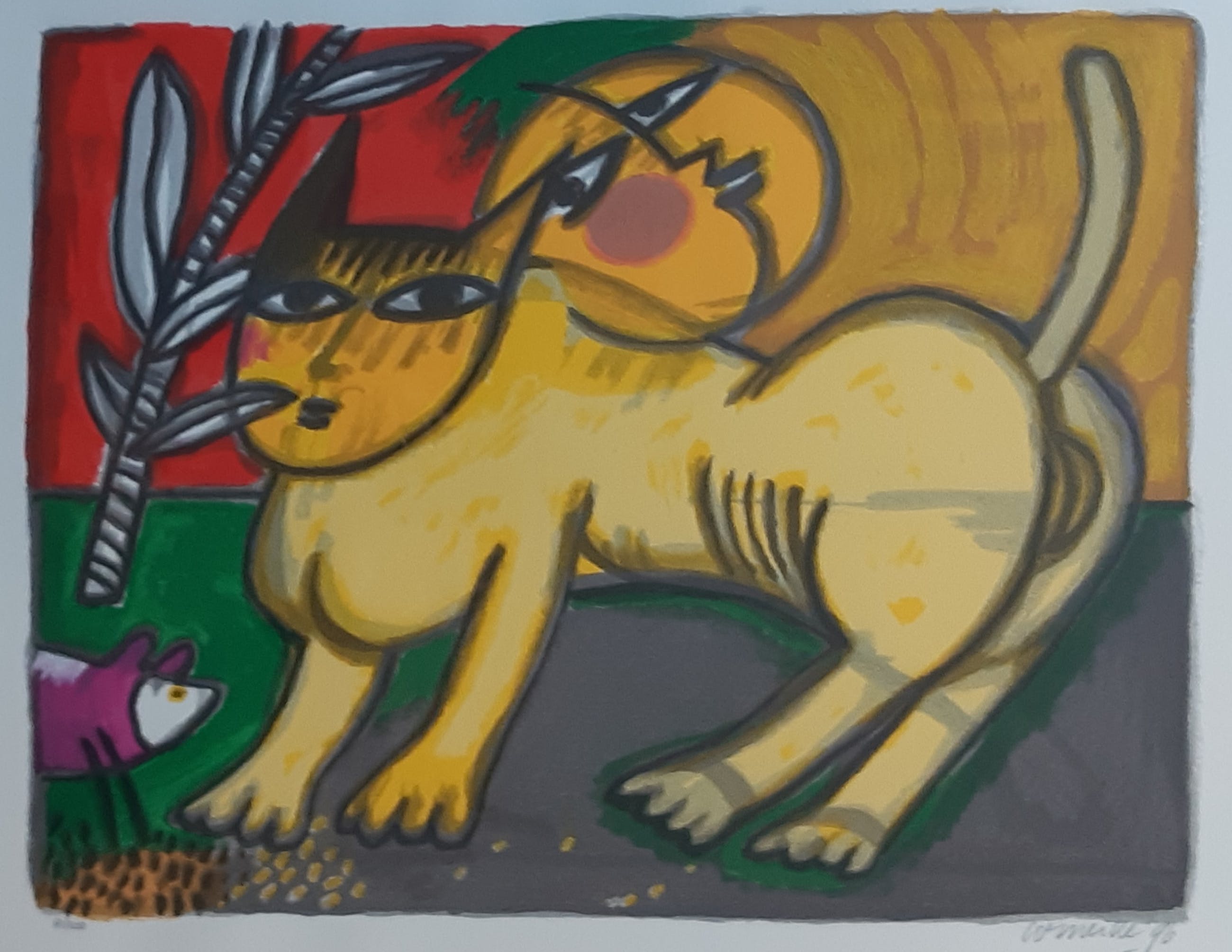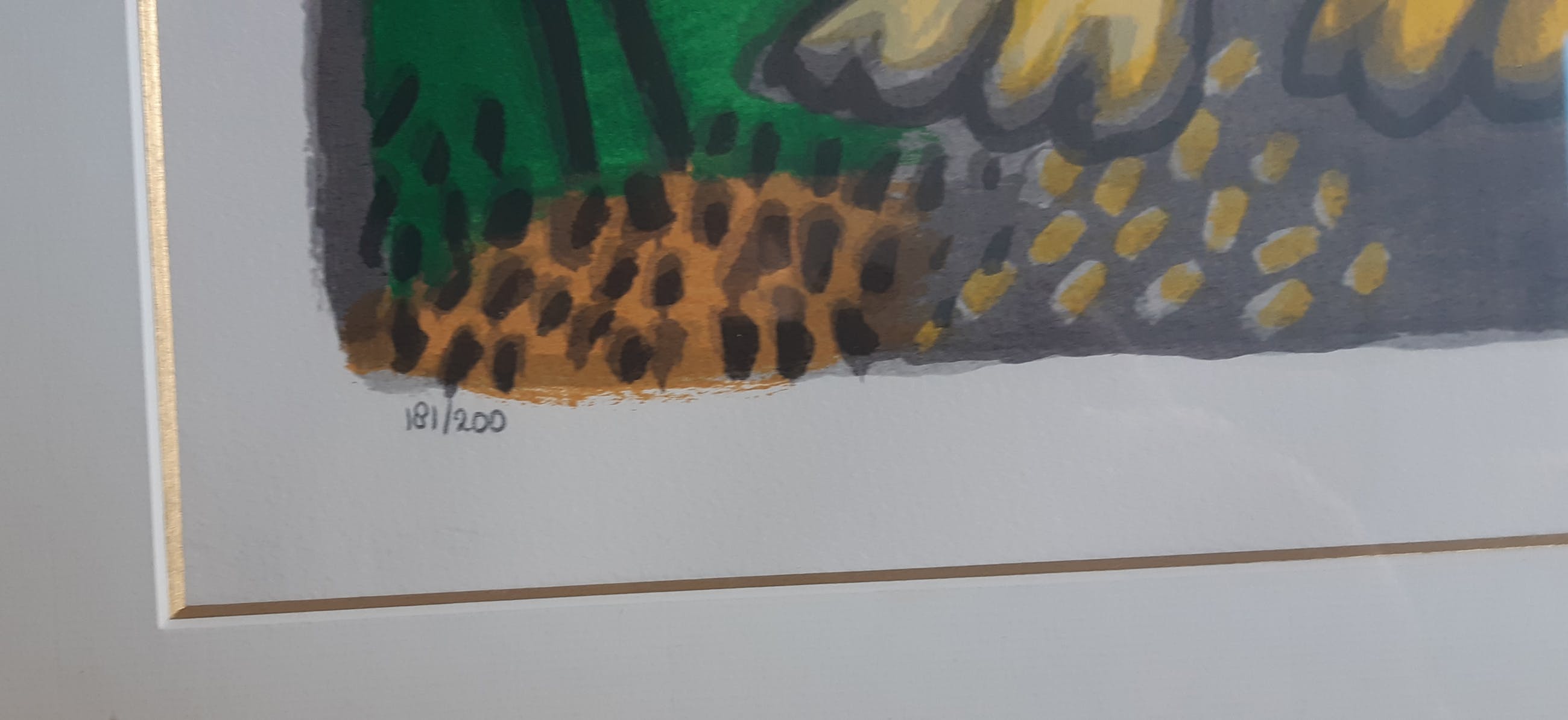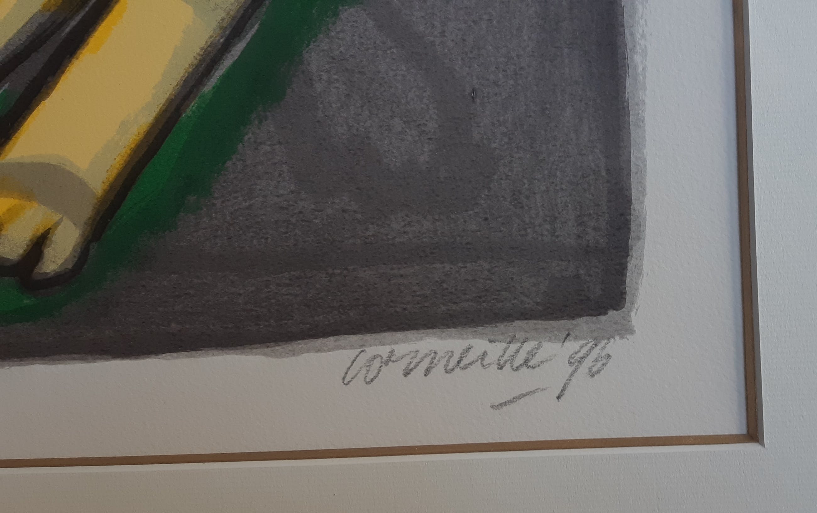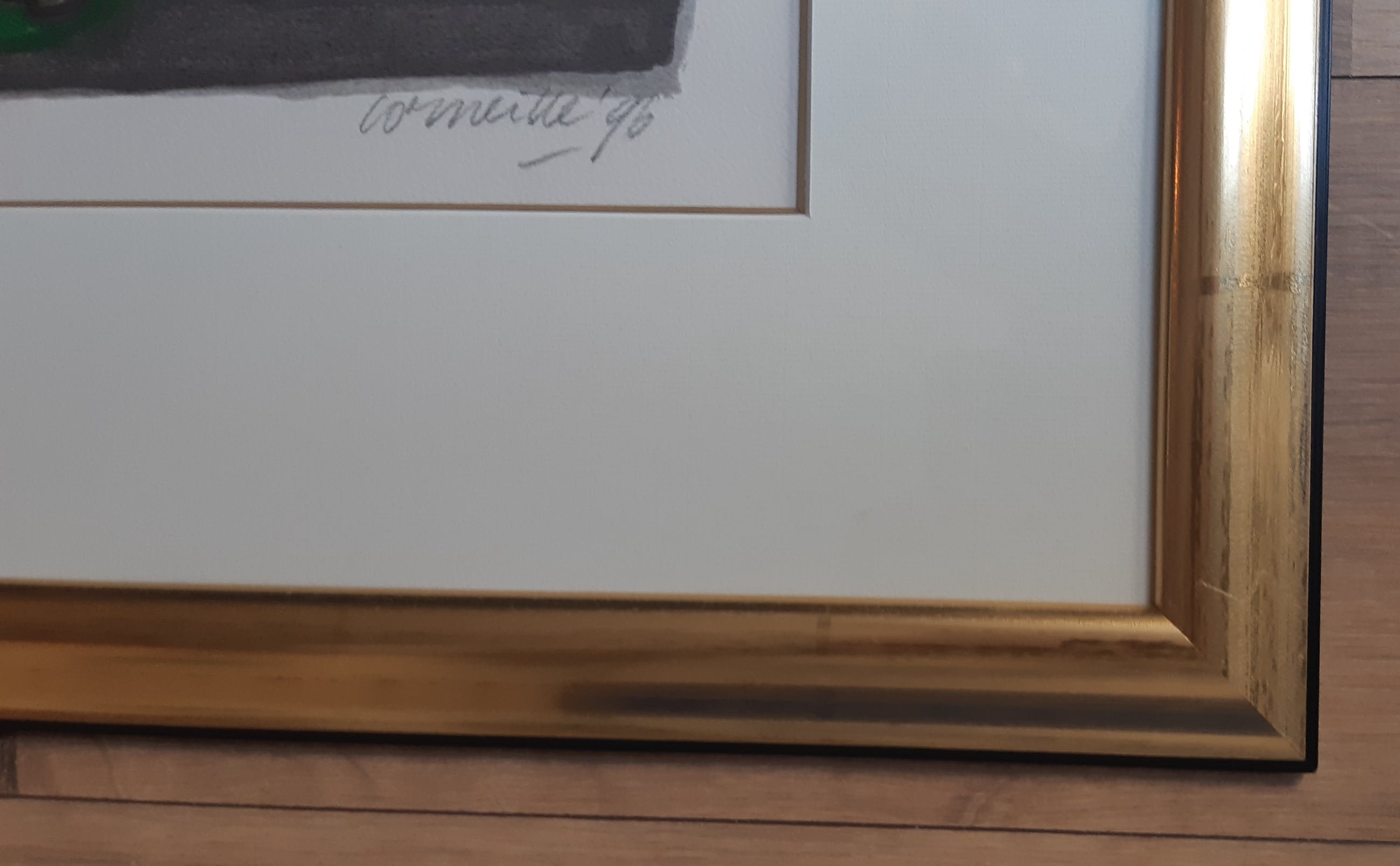 Professioneel ingelijste zeefdruk van Corneille uit 1996. Ingelijst in een prachtige, houten goudkleurige lijst. Het geheel is voorzien van een Passe-partout met een smaakvolle gouden bies. Gesigneerd, gedateerd en genummerd in potlood door de kunstenaar. Mooi groot formaat.