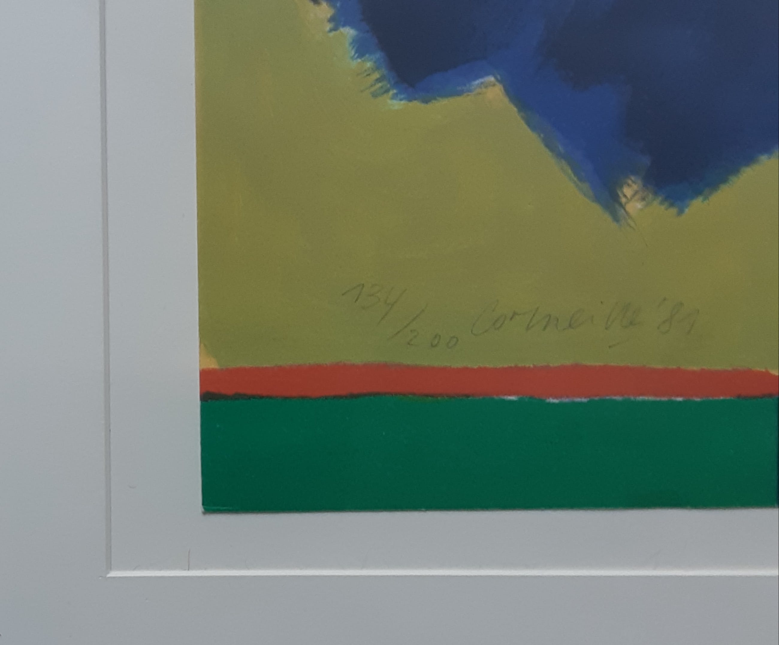 Erg mooie lithografie van Corneille in sprekende, warme kleuren. Professioneel ingelijste in een robuuste metalen, zilverkleurige lijst en voorzien van een Passe-partout. Gesigneerd, gedateerd en genummerd in potlood door de kunstenaar. Mooi!!