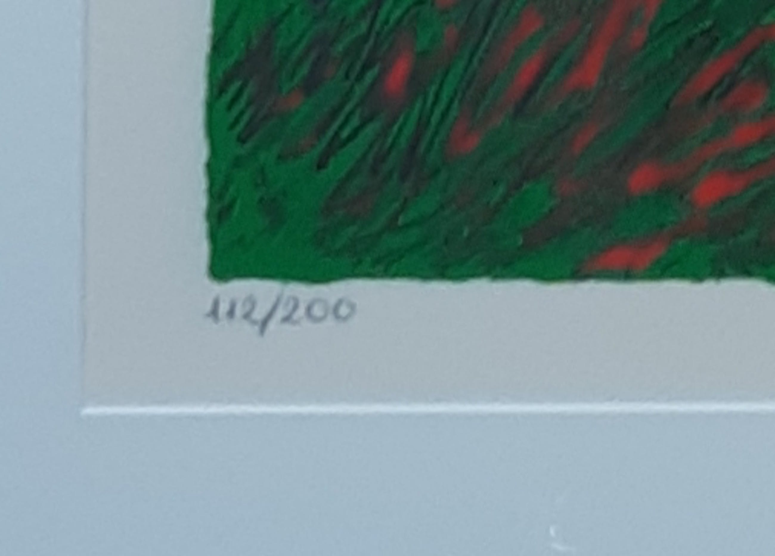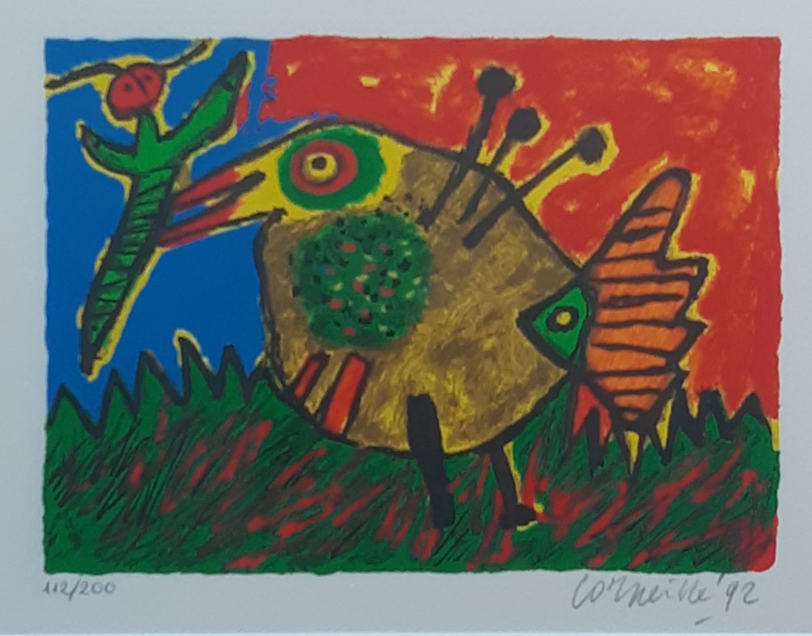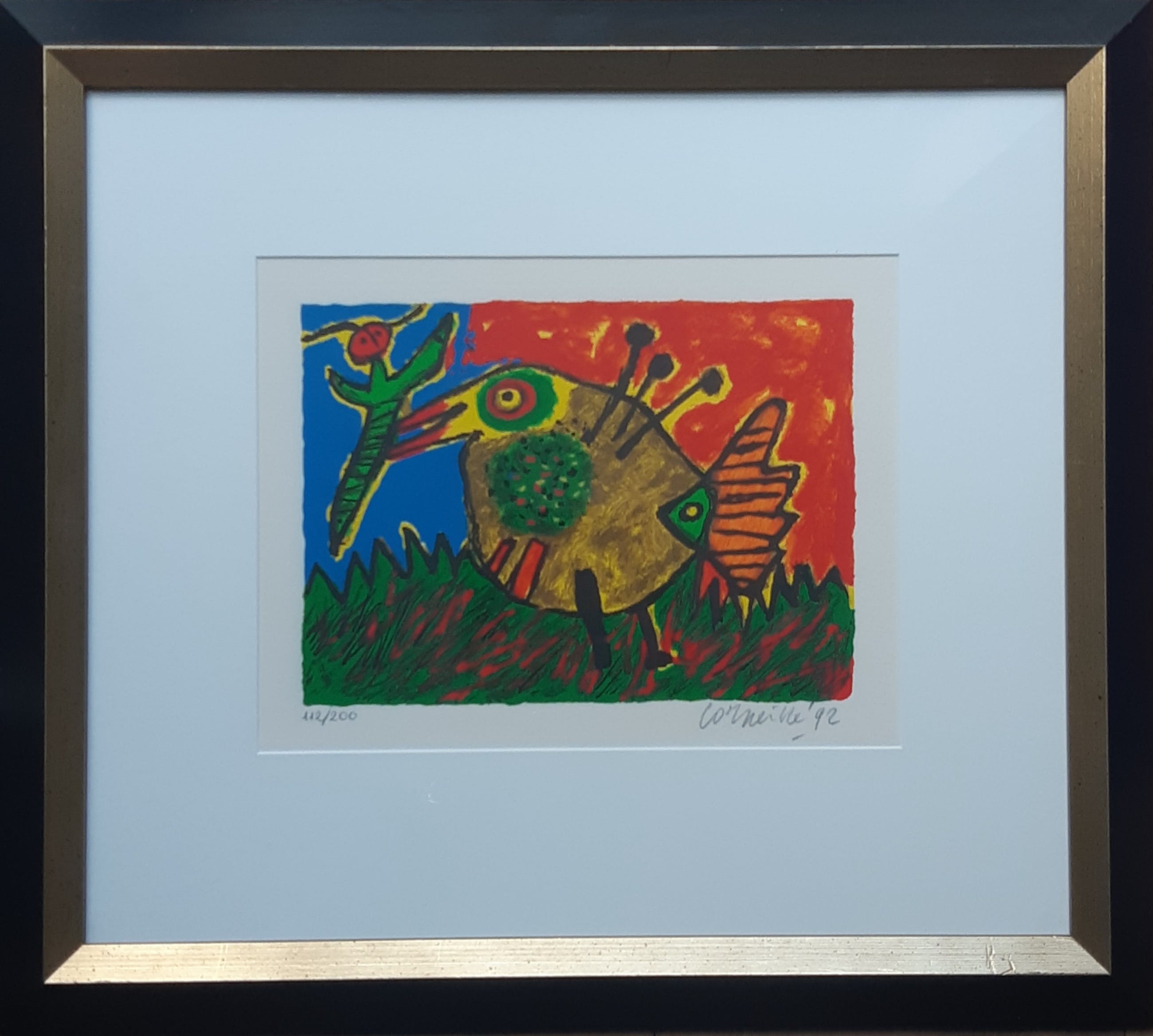 Ontzettend leuke en kleurrijke zeefdruk van Corneille uit 1992. Erg mooi ingelijst in een houten zwart/gouden lijst en voorzien van een Passe-partout. Dit is nummer 112 uit een serie van 200 exemplaren. Gesigneerd, gedateerd en genummerd in potlood door de kunstenaar. Een erg mooi geheel!!